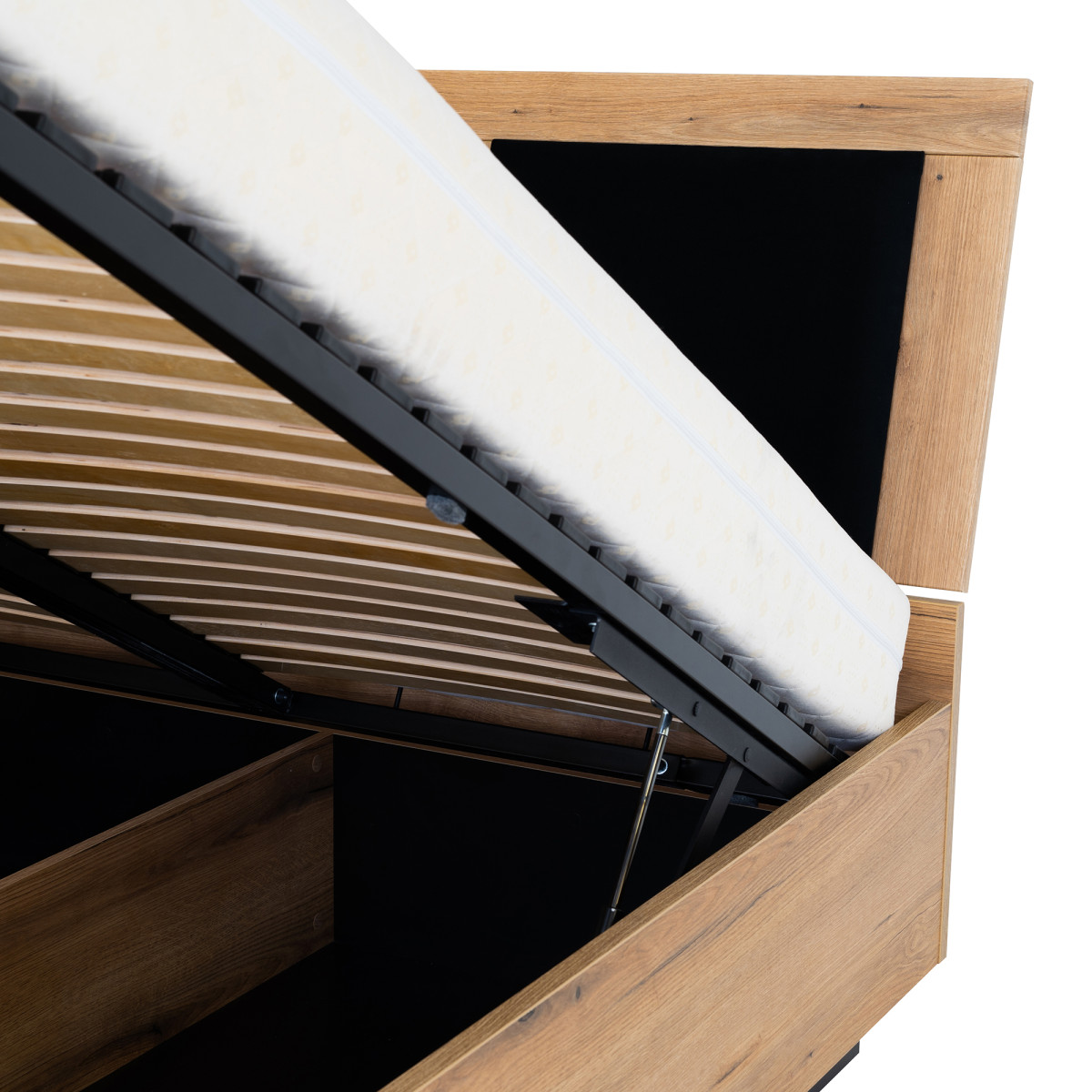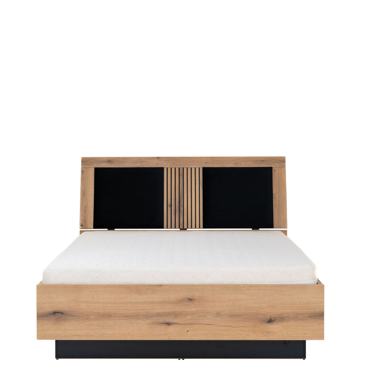 Lova ARIS AS14 siūlo komfortą ir patogumą, derinamą su išskirtine, modernia išvaizda. Lova turi metalinį rėmą su hidraulinio pakėlimo funkcija, po kuriuo yra didelis patalynės skyrius. Šis skyrius yra geriausias pasirinkimas mažam miegamajam; interjeras yra padalintas į dvi dalis, todėl kiekvienas svečias turi savo vietą atsarginei patalynei. Čiužinys neįskaičiuotas; jį galima įsigyti atskirai. Lova puikiai dera į modernaus stiliaus erdves. Stilingas spalvų derinys paverčia ją tikra akį traukiančia detale. Be to, lovos rėmą galima apšviesti LED juostele (už papildomą mokestį), sukuriančia subtilų švytėjimą ir romantišką atmosferą. Juodi fasadai kartu su medžio dekoru, praturtintu grotelių efektu, suteikia interjerui elegancijos. Lova, kurią galima įsigyti trijų dydžių: 140 cm, 160 cm ir 180 cm, puikiai tinka derinti su kitais ARIS serijos baldais arba kaip atskiras baldas, prisitaikantis prie jūsų kambario interjero.
