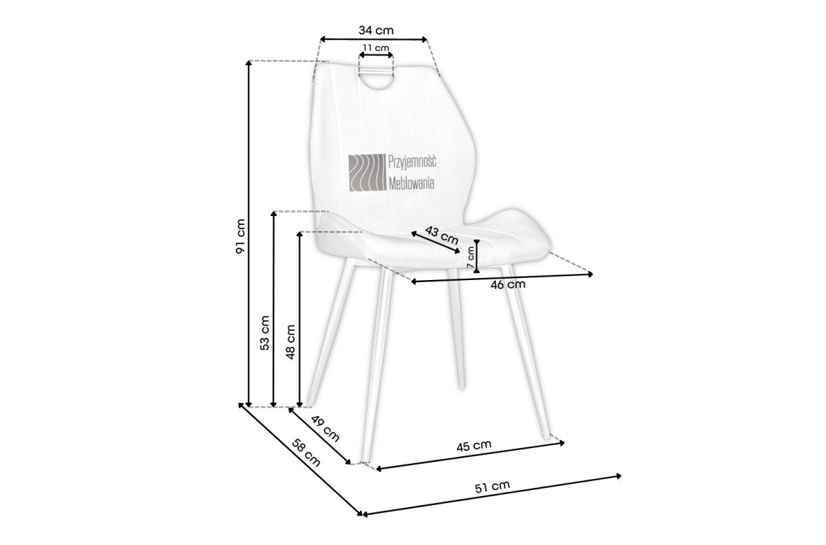 Milteliniu būdu dažytas plieninis rėmas garantuoja stabilumą ir ilgaamžiškumą, o lieknos kojelės suteikia konstrukcijai modernumo. Praktiška rankena atlošo viršuje leidžia lengvai perkelti kėdę.