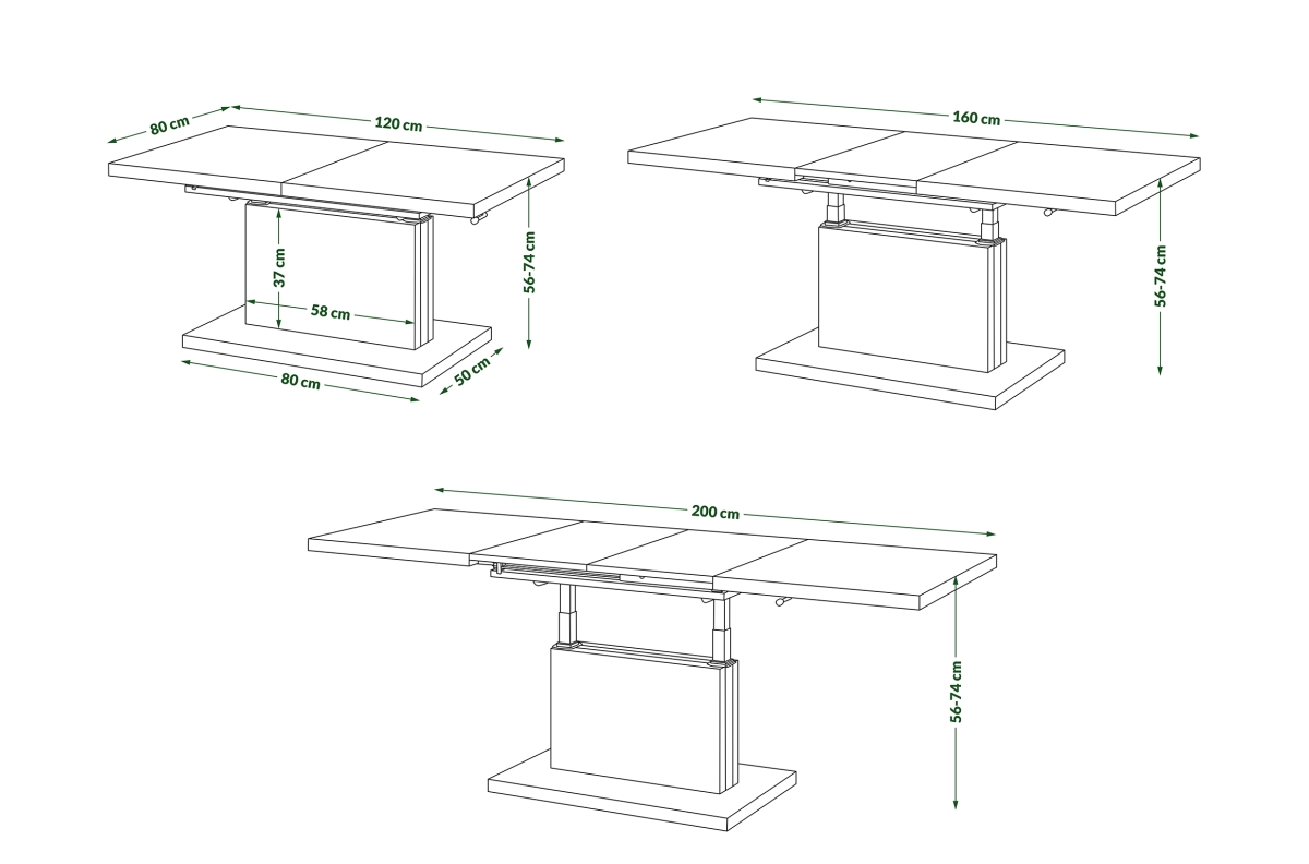 PLOTIS 120 cm / 160 cm / 200 cm, GYLIS 70 arba 80 cm (priklausomai nuo pasirinkimo) REGULIUOJAMAS, AUKŠTIS 56–74 cm, ĮDĖKLŲ SKAIČIUS 2 vnt. x 40 cm (paslėpti po stalviršiu), MEDŽIAGOS Medžio drožlių plokštė, FUNKCIJA Ištraukiamas stalviršis, PAVIRŠIUS Matinis, STILIUS Modernus, SVORIS SU PAKUOTE 65 kg