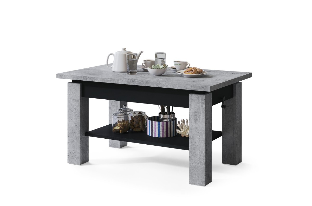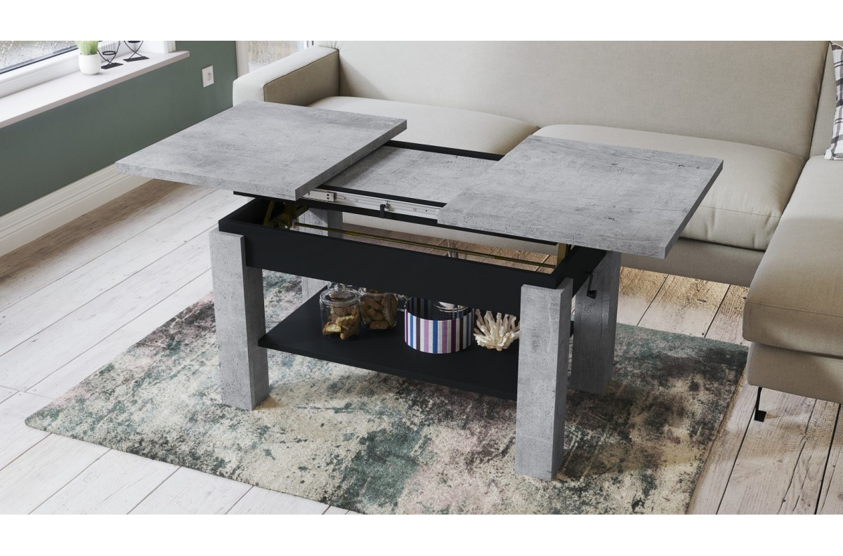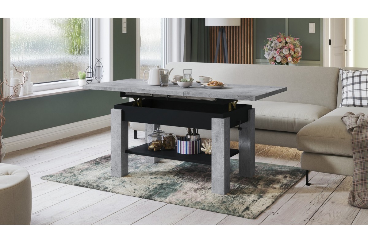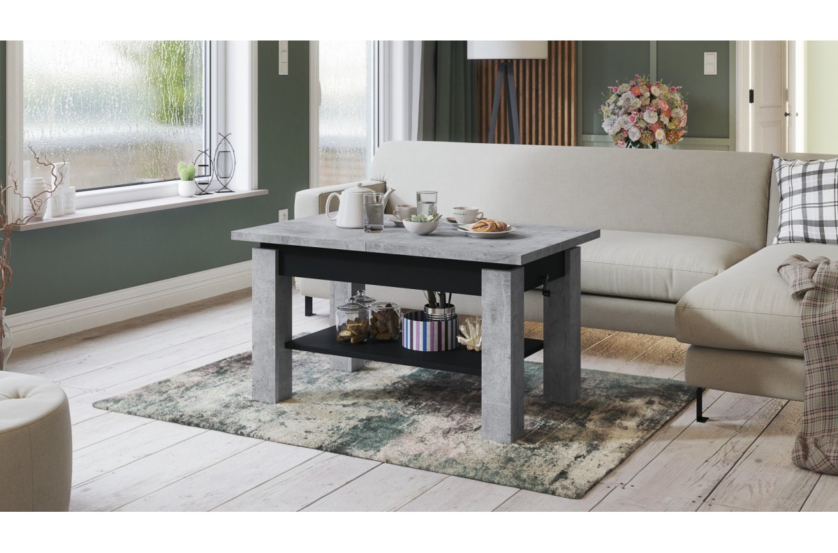 ASTORIA „Millenium Concrete/Matinė juoda“ – SULANKSTOMAS SUOLAS, PAKELIAMAS STALAS, KAVOS STALIUKAS SU LENTYNA