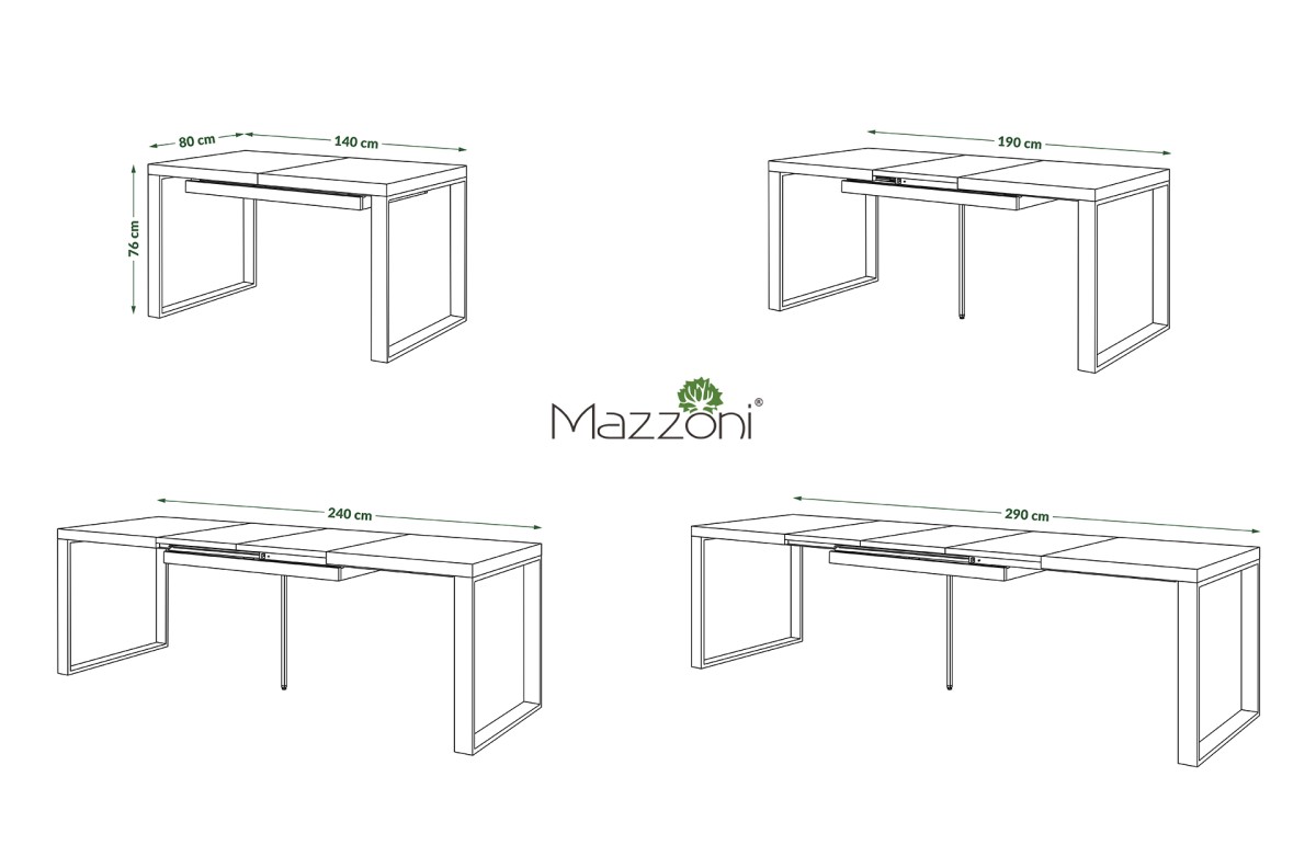 PLOTIS 140 arba 120 cm (priklausomai nuo pasirinkto dydžio), GYLIS 80 cm, AUKŠTIS 76 cm, ĮDĖKLŲ SKAIČIUS 3 vnt. x 50 cm (paslėpti po stalviršiu), FUNKCIJA Ištraukiamas stalviršis, PAVIRŠIUS Matinis, STILIUS Loft, SVORIS SU PAKUOTE 83 kg