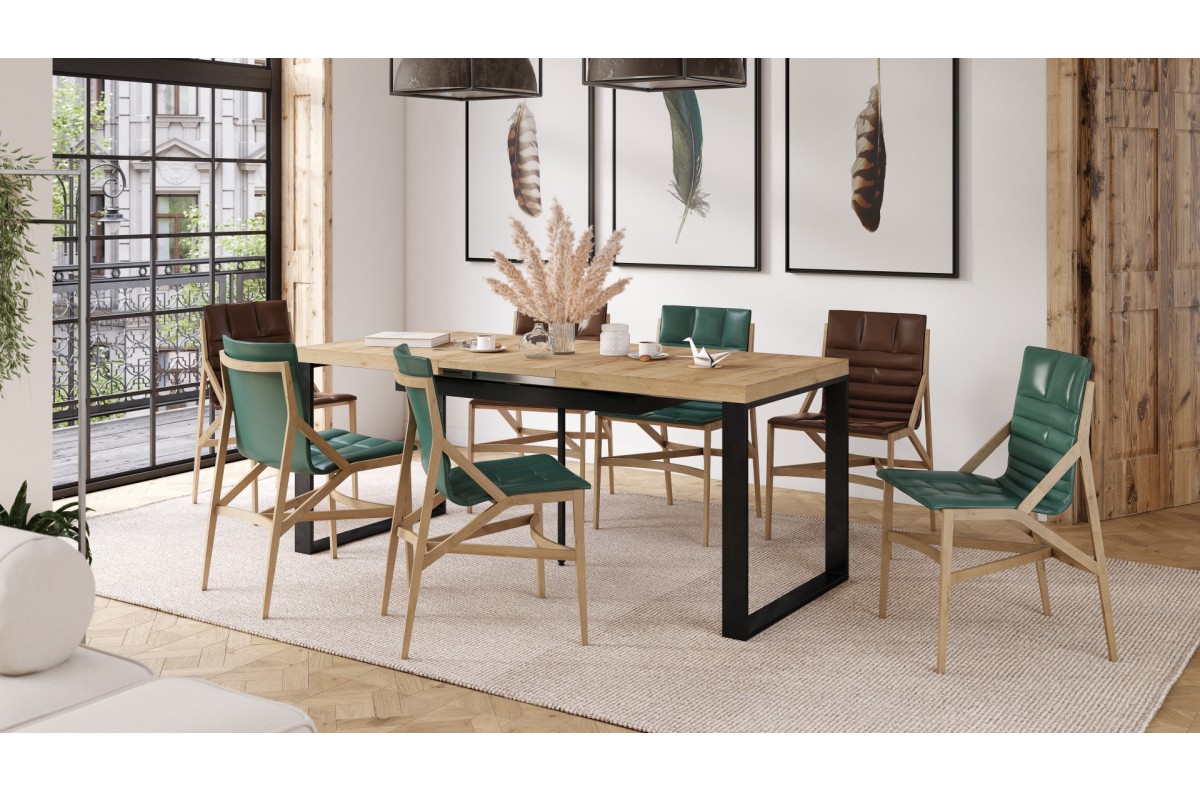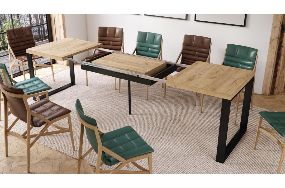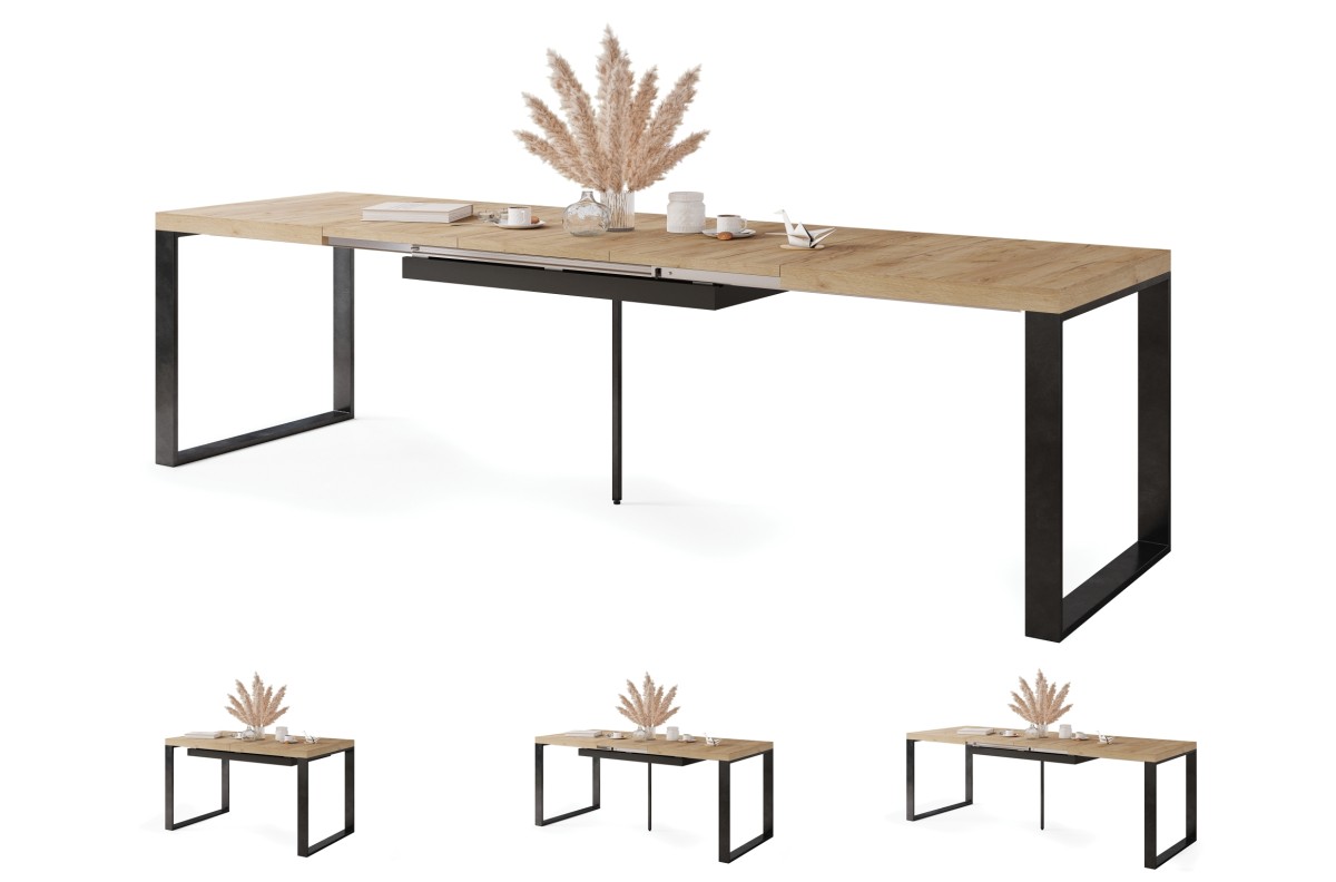 PLOTIS 140 arba 120 cm (priklausomai nuo pasirinkto dydžio), GYLIS 80 cm, AUKŠTIS 76 cm, ĮDĖKLŲ SKAIČIUS 3 vnt. x 50 cm (paslėpti po stalviršiu), FUNKCIJA Ištraukiamas stalviršis, PAVIRŠIUS Matinis, STILIUS Loft, SVORIS SU PAKUOTE 83 kg