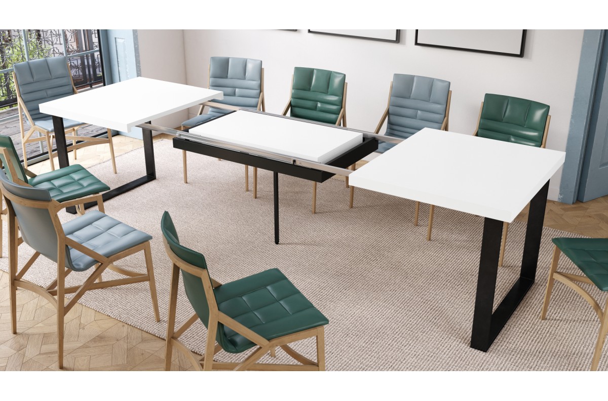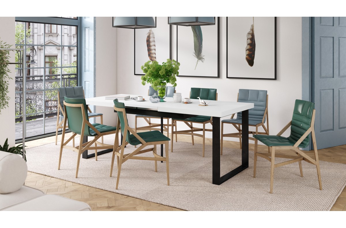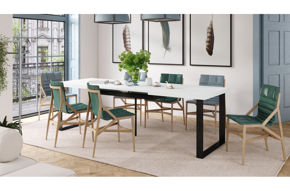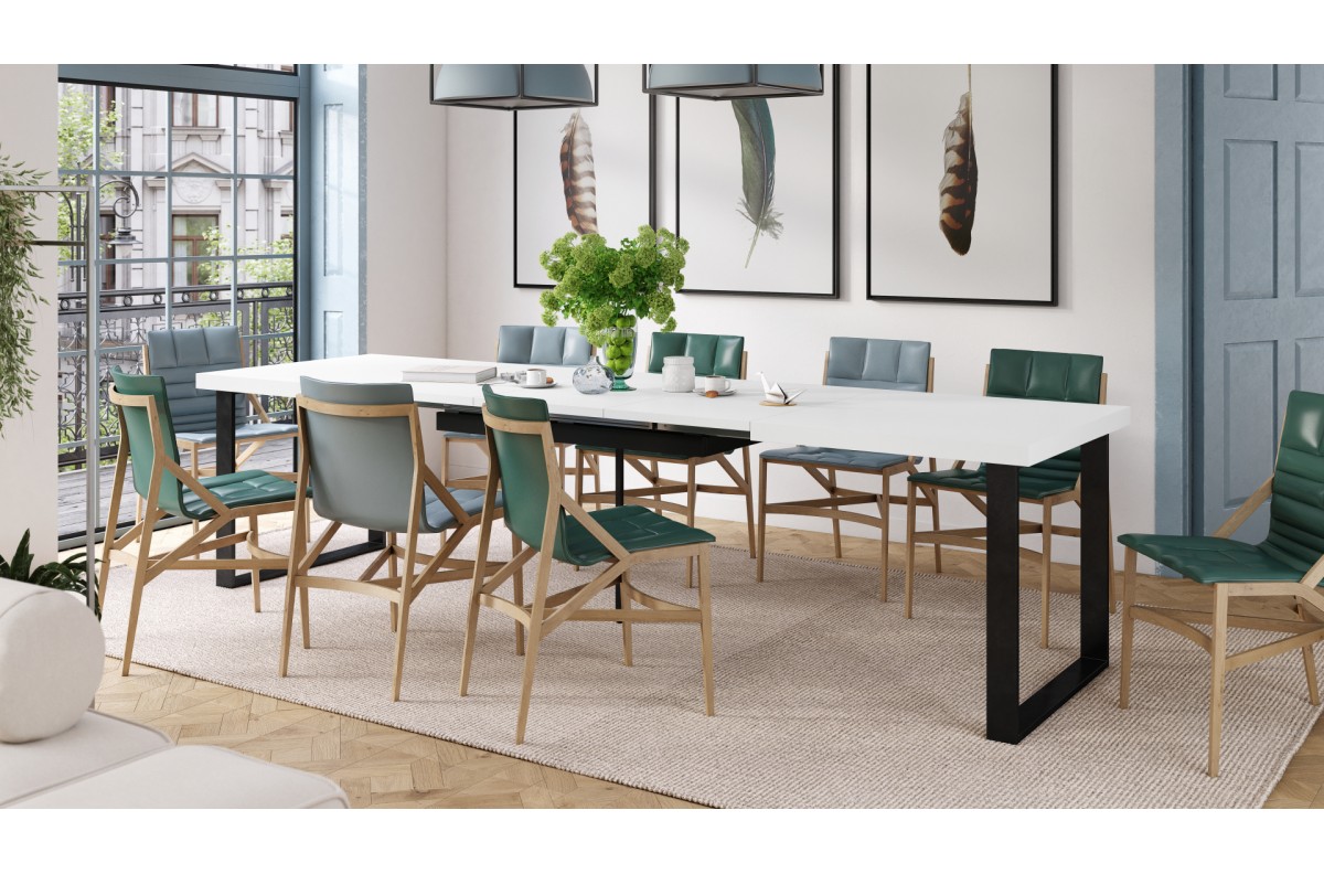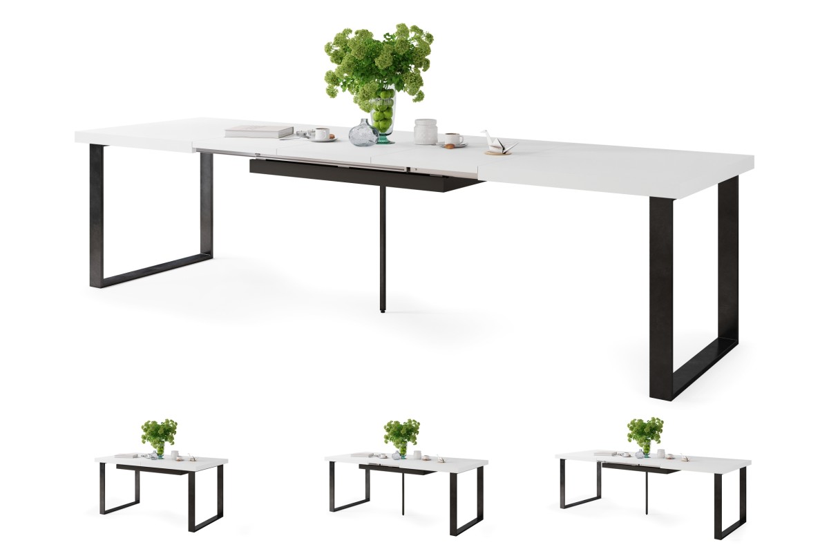 AVELLA matinės baltos spalvos – palėpės stalas svetainei/valgomajam, ilgis iki 310 cm!