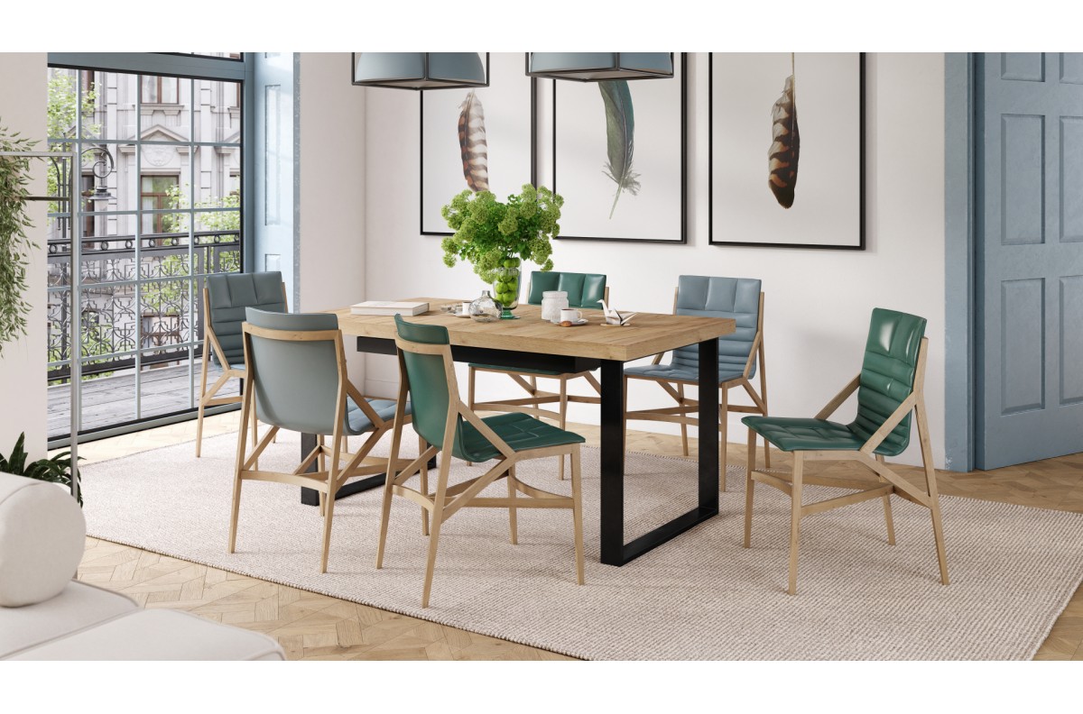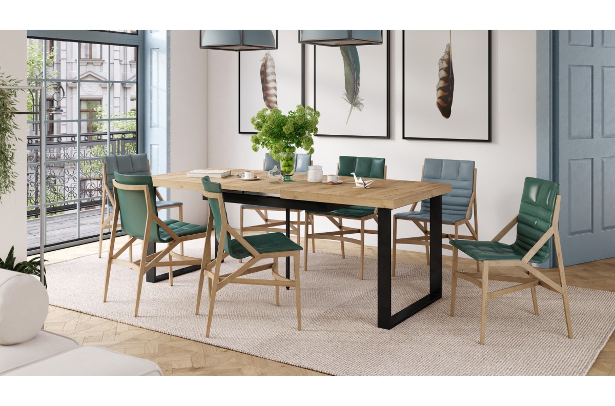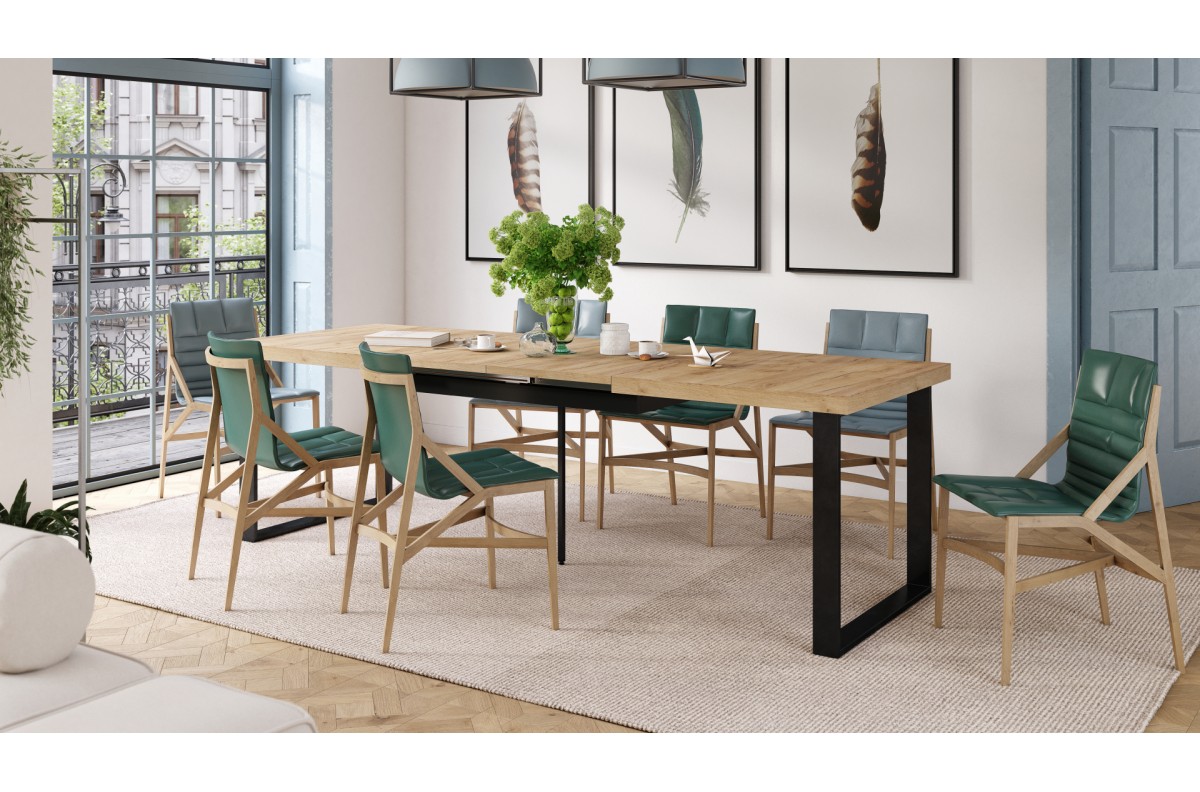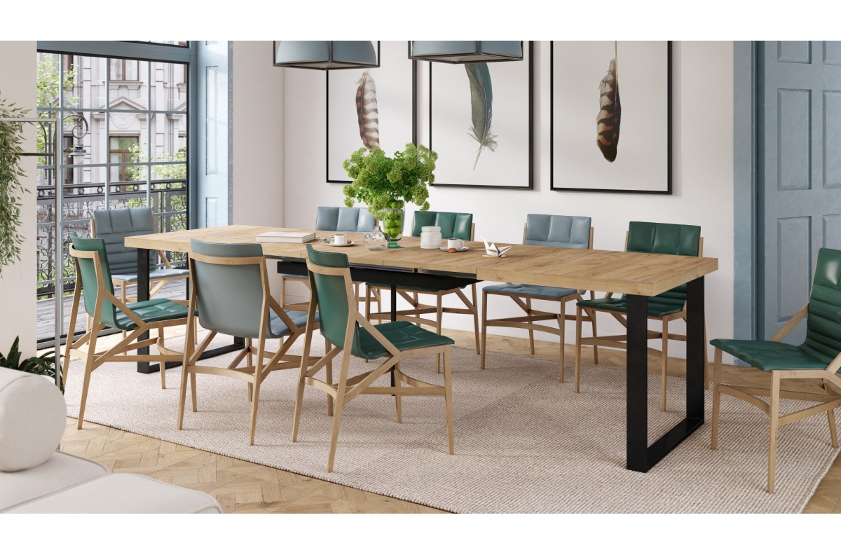 PLOTIS 160 cm / 210 cm / 260 cm / 310 cm, GYLIS 90 cm, AUKŠTIS 76 cm, ĮDĖKLŲ SKAIČIUS 3 vnt. x 50 cm (paslėpta po stalviršiu), FUNKCIJA Ištraukiamas stalviršis, PAVIRŠIUS Matinis, STILIUS Loft, SVORIS SU PAKUOTE 90 kg