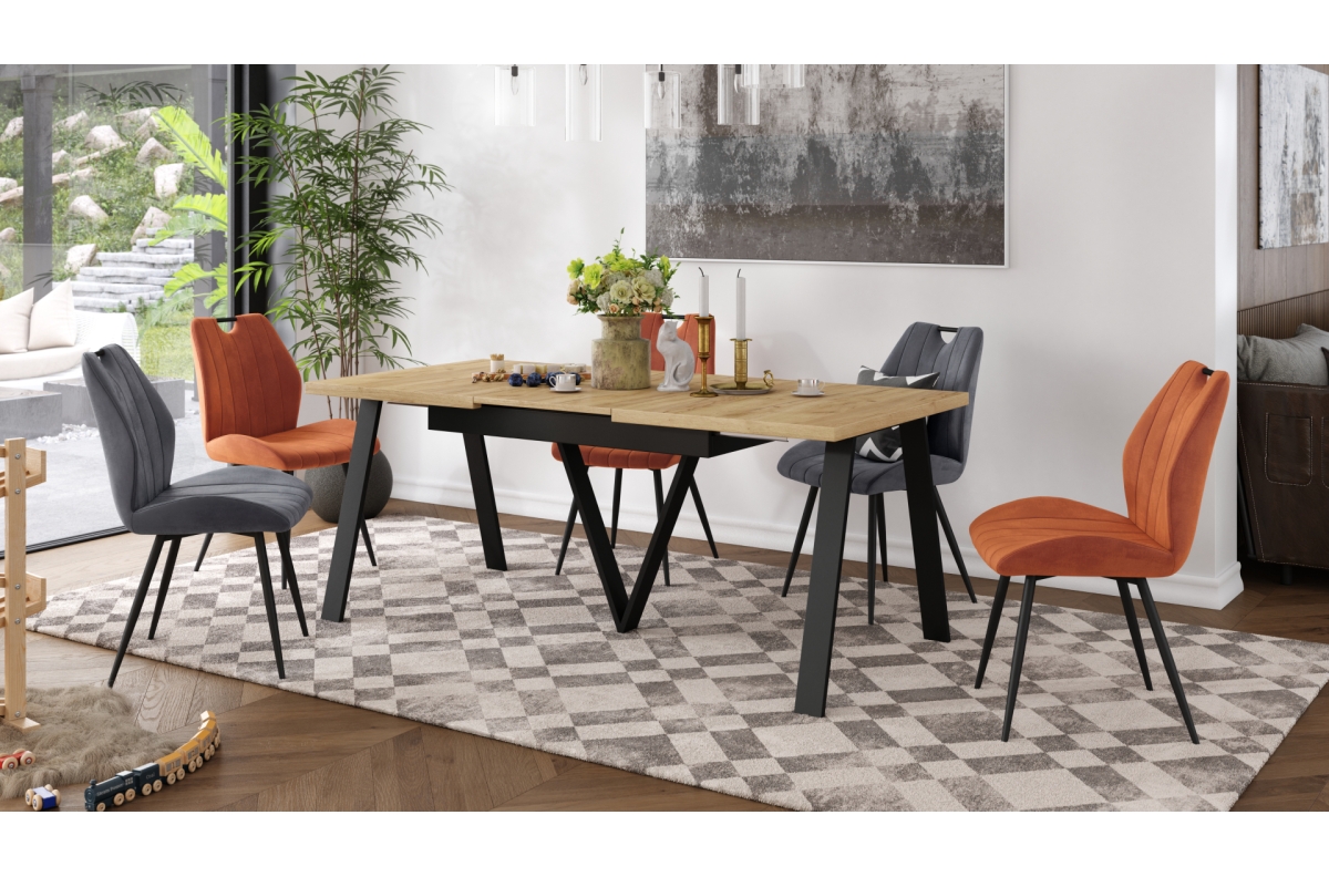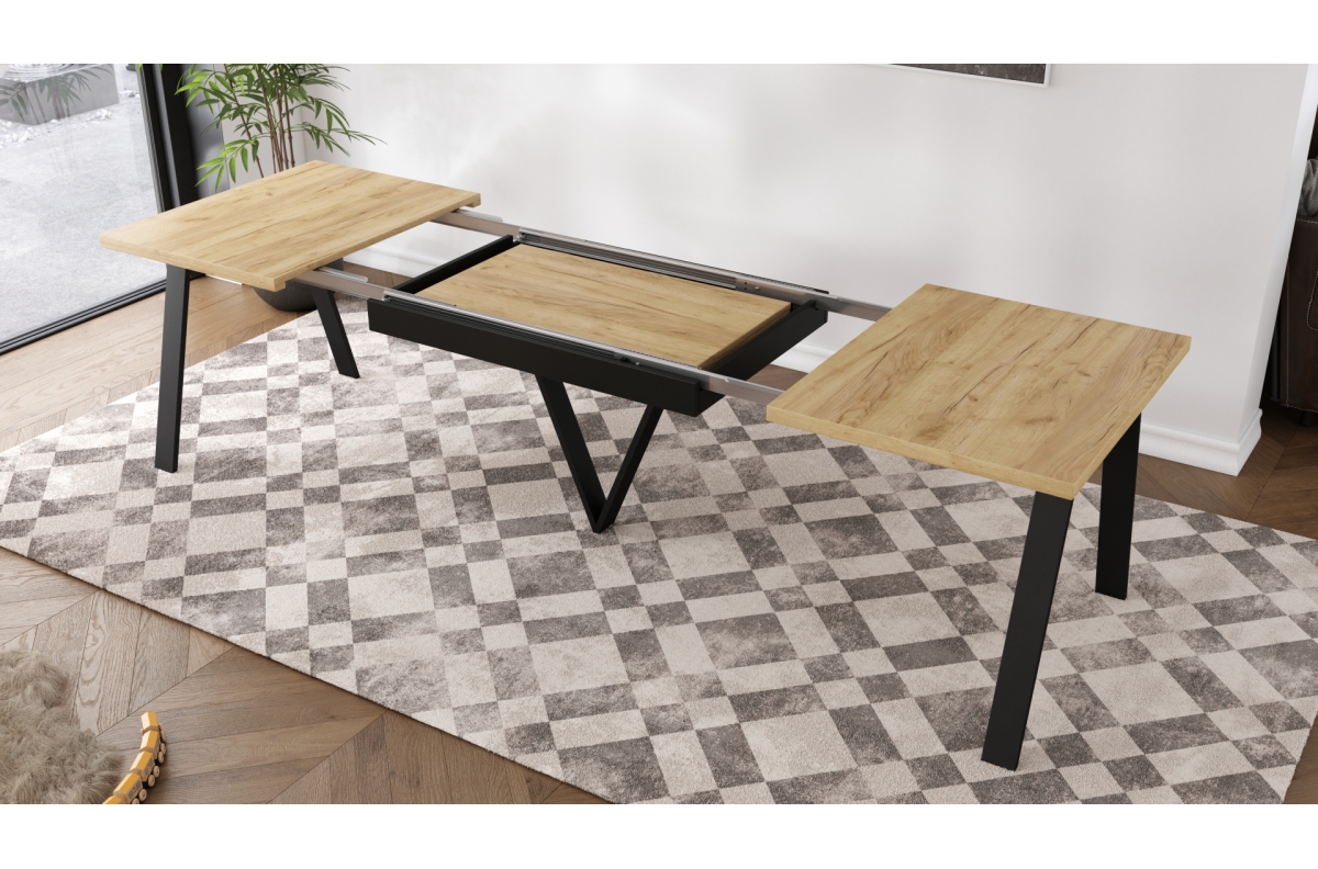 AVERY Gold Craft ąžuolo/juodo dugno stalas – LOFT/INDUSTRIAL stalas svetainei/valgomajam, ištraukiamas – 2 dydžiai!