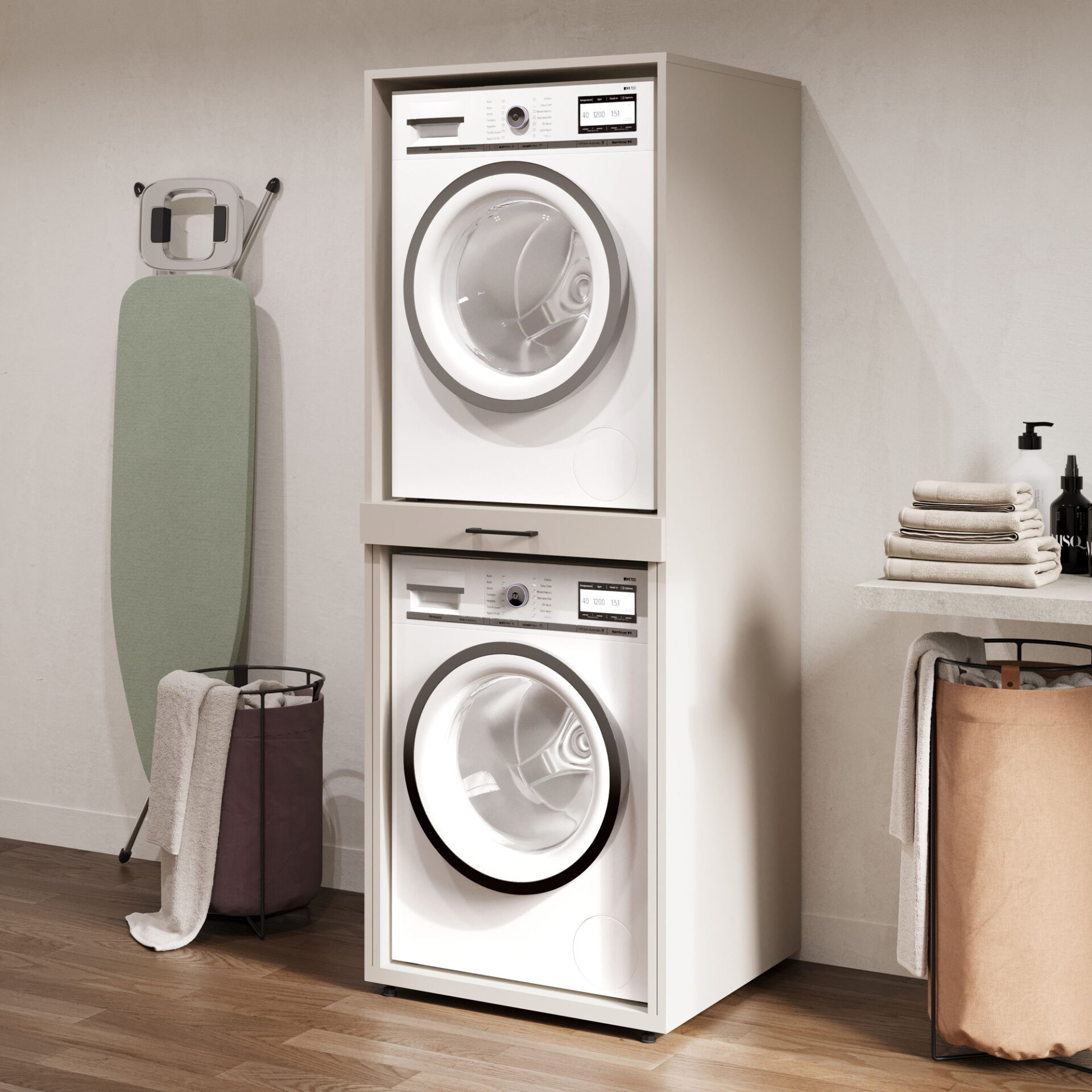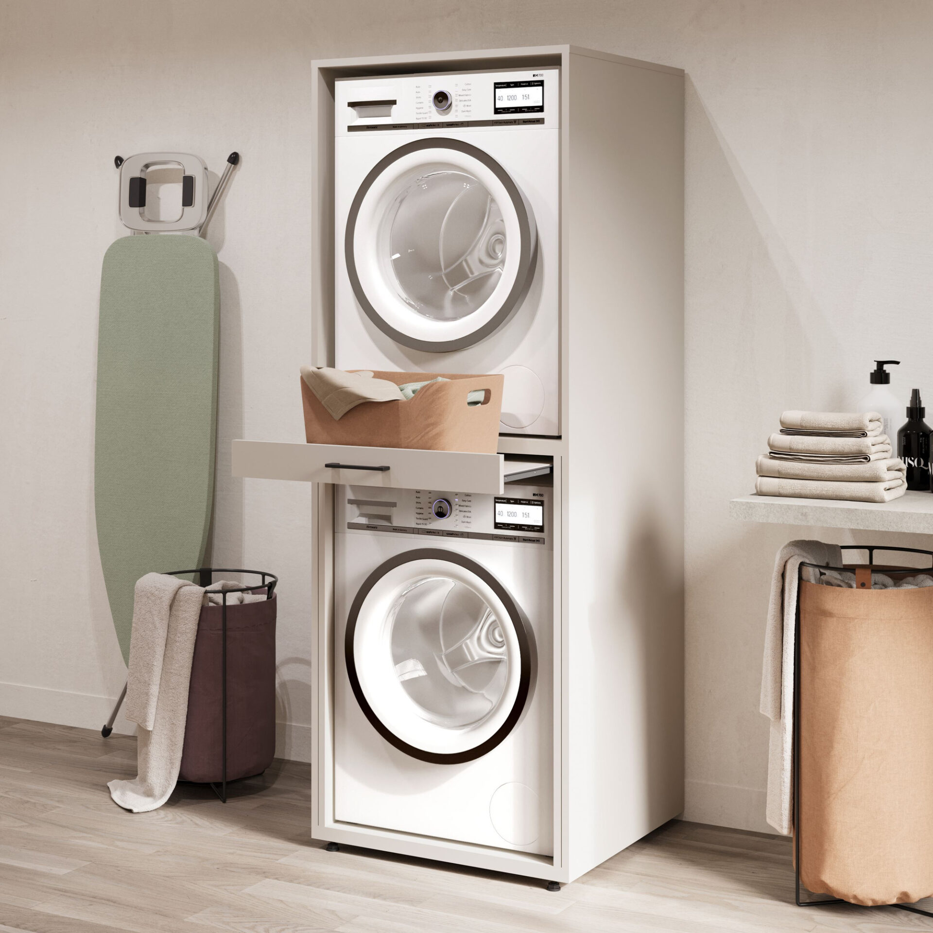 „Helvetia“ įmontuojama skalbimo mašina ir džiovyklė „Aza“ – puikus sprendimas visiems, norintiems į savo skalbyklą ar vonios kambarį įnešti tvarkos ir harmonijos. Pagaminta iš aukštos kokybės laminuotos plokštės, elegantiškos kašmyro spalvos, ji neabejotinai suteiks žavesio jūsų interjerui ir sukurs funkcionalią erdvę daiktams susidėti. Pagerinkite savo namus jau šiandien, derindami estetiką su praktiškumu! Gerai apgalvotas dizainas, kurio aukštis yra 189 cm, o plotis – 69 cm, suteikia daug vietos saugiai pastatyti skalbimo mašiną ir džiovyklę. 67 cm gylis suteikia stabilumo ir patogumo. Šis sprendimas ne tik paslepia prietaisus, bet ir leidžia lengvai pasiekti prietaisus, supaprastina kasdienes užduotis ir padeda palaikyti tvarką kambaryje. Be to, „Aza“ buvo sukurta atsižvelgiant į jūsų patogumą. Ji turi praktiškas lentynas ir matines juodas rankenas, kurios harmoningai dera su šviesia rėmo spalva. Ant jos galite laikyti skalbimo priemones, rankšluosčius ir įvairius priedus, sukurdami visiškai organizuotą erdvę. Tai ne tik baldas, tai tikras pagalbininkas kasdieniame gyvenime!