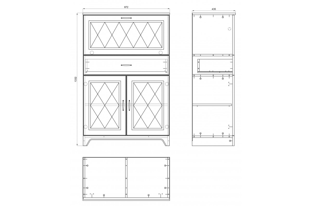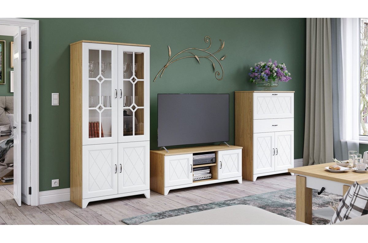 PLOTIS 87,2 cm, GYLIS 43,5 cm, AUKŠTIS 133,2 cm, MEDŽIAGOS MDF + medžio drožlių plokštės, PAVIRŠIUS Matinis, STILIUS Provanso, SVORIS SU PAKUOTE 55 kg