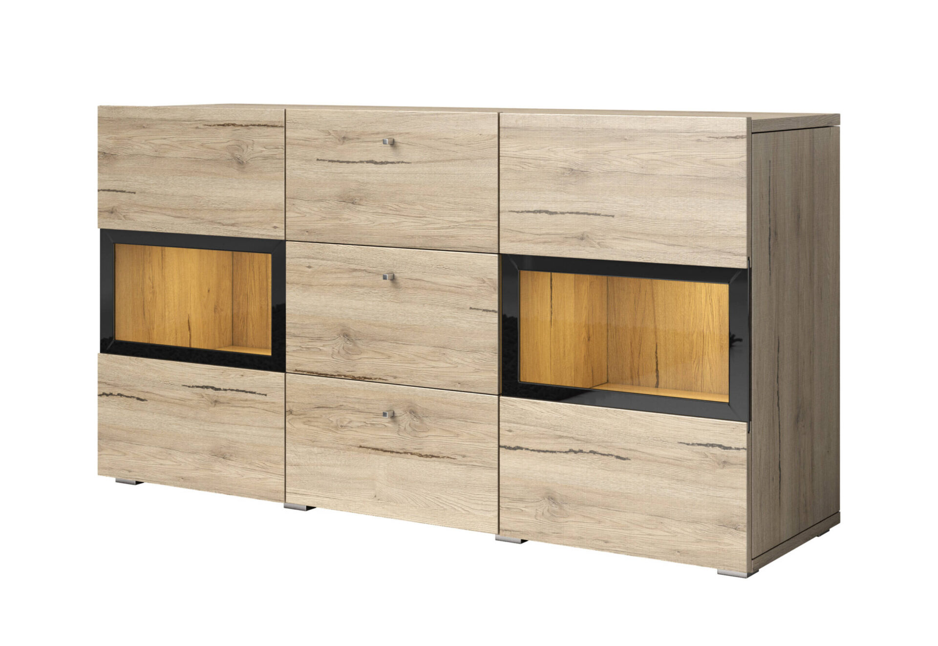 Unikalus šios komodos išskirtinumas – pasirenkamas RGB LED apšvietimas. Dėl to jūsų vitrinų vidus gali spindėti įvairiomis spalvomis, kurias galite keisti pagal savo nuotaiką ar pageidavimus naudodami patogų nuotolinio valdymo pultą. Ši parinktis dar labiau pagerina jūsų daiktų pateikimą, sukurdama unikalią atmosferą kambaryje.