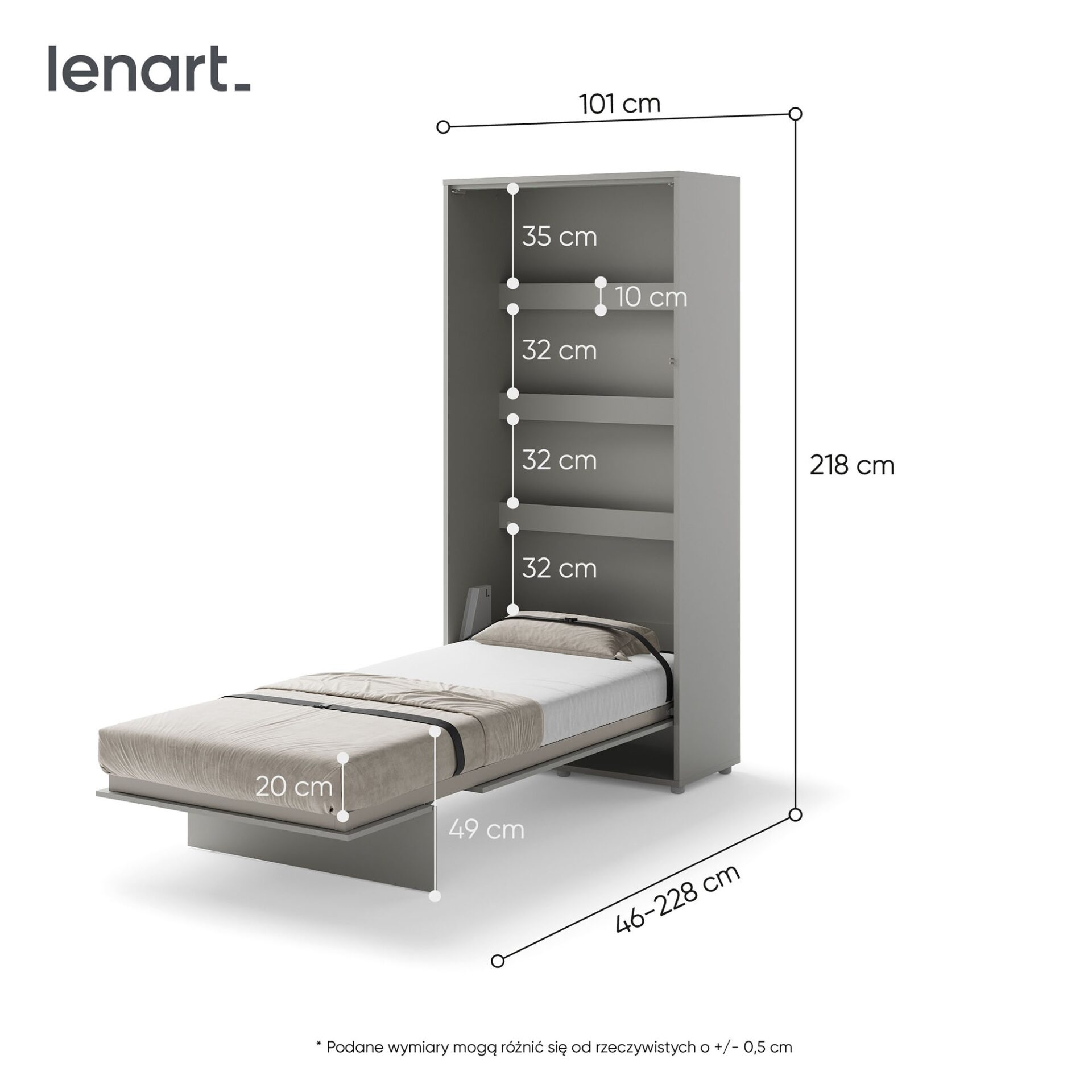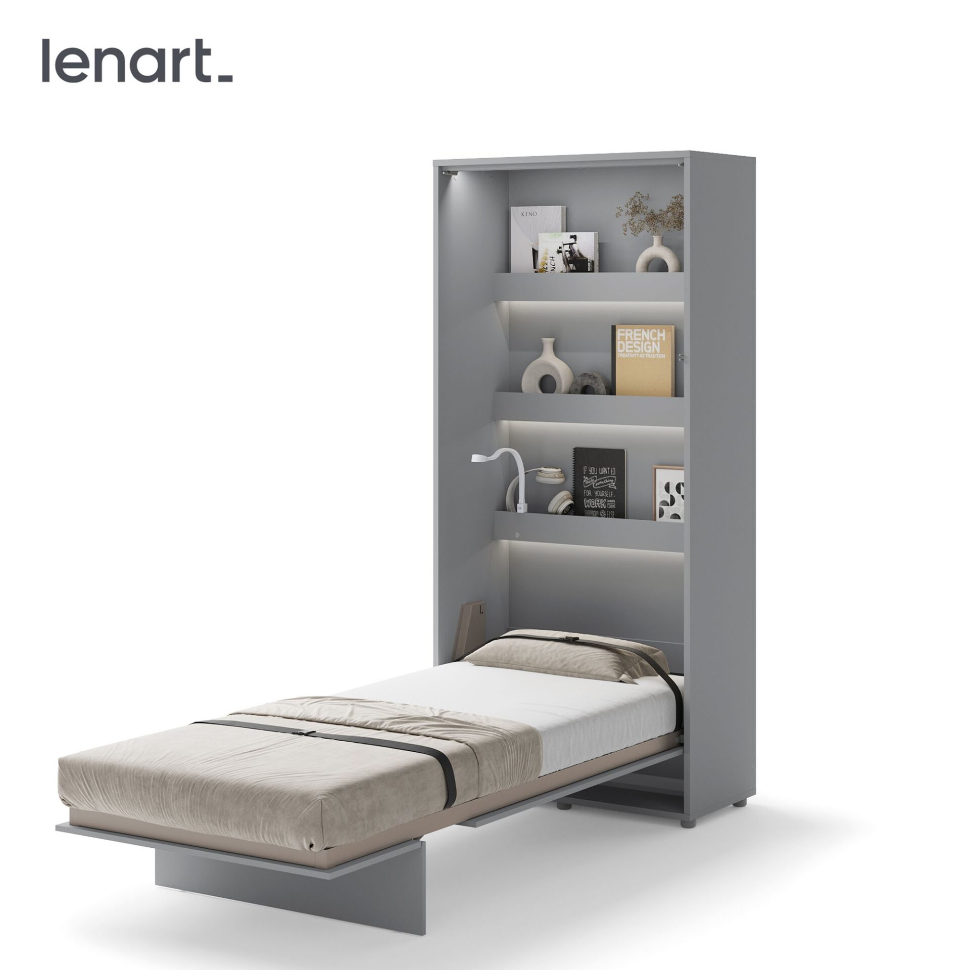 „Lenart BED CONCEPT BC-03“ vertikali prie sienos tvirtinama lova, kurios ilgis 90 cm, yra praktiška ir moderni prie sienos tvirtinama lova, puikiai tinkanti mažiems butams. „Lenart“ prekės ženklas sukūrė baldą, kuris leis per akimirką svetainę ar jaunimo kambarį paversti patogiu miegamuoju. Pilka versija pasižymi elegantiška ir nesenstančia išvaizda, todėl lengvai pritaikoma įvairiems interjero dizainams. „BED CONCEPT BC-03“ modelis skirtas 90 cm pločio čiužiniui, todėl tai puikus pasirinkimas vienam asmeniui, paaugliui ar vyresniam vaikui. Papildomos lentynos prie sienos tvirtinamos lovos viduje leidžia laikyti knygas, dekoracijas ir smulkius kasdienius aksesuarus. Tvirtas korpusas, metalinis rėmas ir pneumatiniai keltuvai garantuoja saugumą ir patogų naudojimą. Šios savybės pelnė baldams 2019 m. Poznanės tarptautinės parodos aukso medalį. Dėl minimalistinio dizaino ir funkcionalumo pilka prie sienos tvirtinama lova BC-03 puikiai tinka tiek kasdieniam naudojimui, tiek svečių kambariui, užtikrindama patogų miegą ir taupydama vietą.