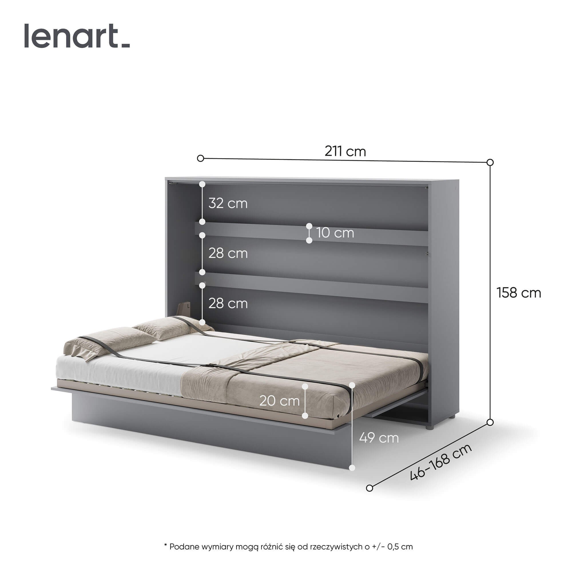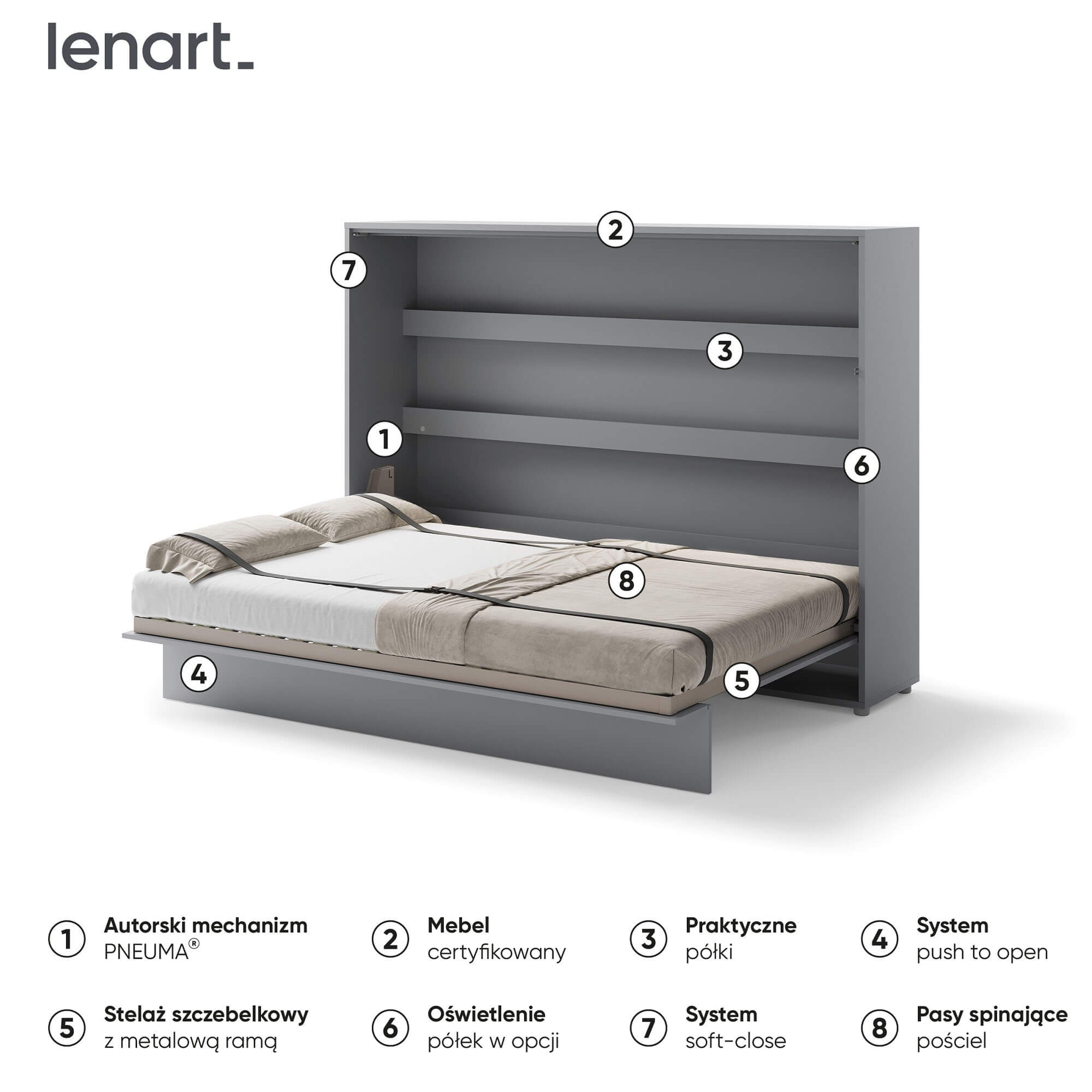 „Lenart BED CONCEPT BC-04“ horizontali sieninė lova, 140 cm, yra praktiška sieninė lova, puikiai tinkanti mažiems ir vidutinio dydžio butams. „Lenart“ sukūrė baldą, kuris leis per akimirką paversti svetainę patogiu miegamuoju. Pilka versija pasižymi modernia, universalia išvaizda, todėl ją lengva priderinti prie įvairių interjero dizainų. „BED CONCEPT BC-04“ modelis skirtas 140 cm pločio čiužiniui, todėl tai puikus pasirinkimas porai arba kaip erdvi viengulė lova. Sieninė lova turi papildomas vidines lentynas, puikiai tinkančias knygoms, dekoracijoms ar kasdieniams daiktams laikyti. Stabilus, prie sienos tvirtinamas rėmas, metalinis rėmas ir pneumatiniai keltuvai užtikrina saugumą, komfortą ir ilgaamžiškumą. Už funkcionalumą ir aukštą meistriškumo kokybę baldas buvo apdovanotas 2019 m. Poznanės tarptautinės parodos aukso medaliu. Šis sprendimas maksimaliai išnaudoja erdvę, užtikrindamas visišką miego komfortą, išlaikant modernią ir elegantišką išvaizdą.