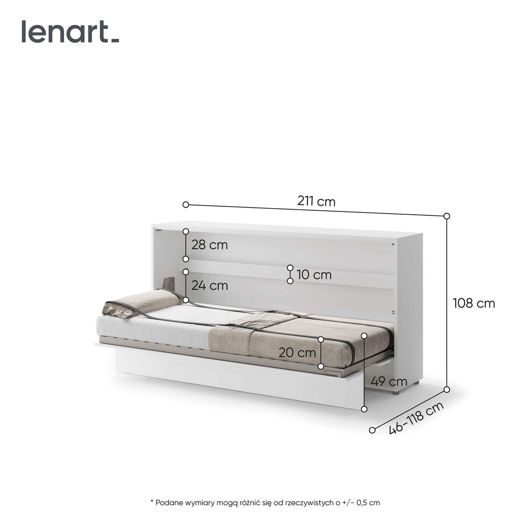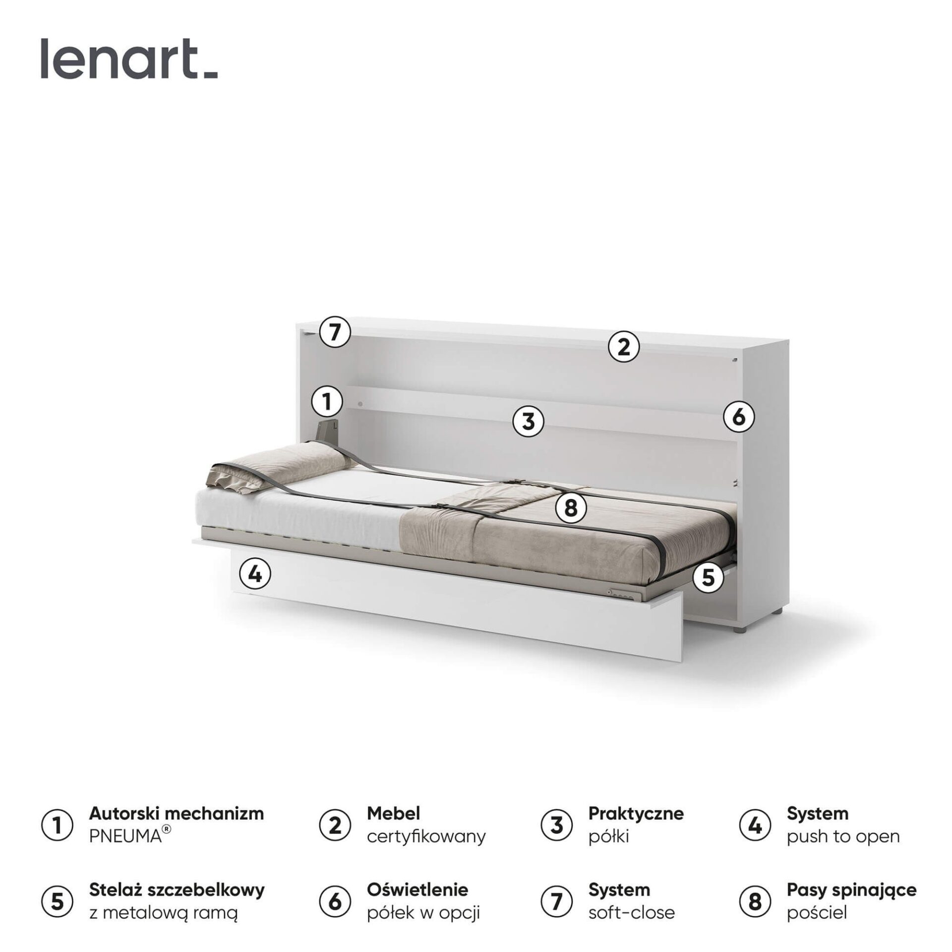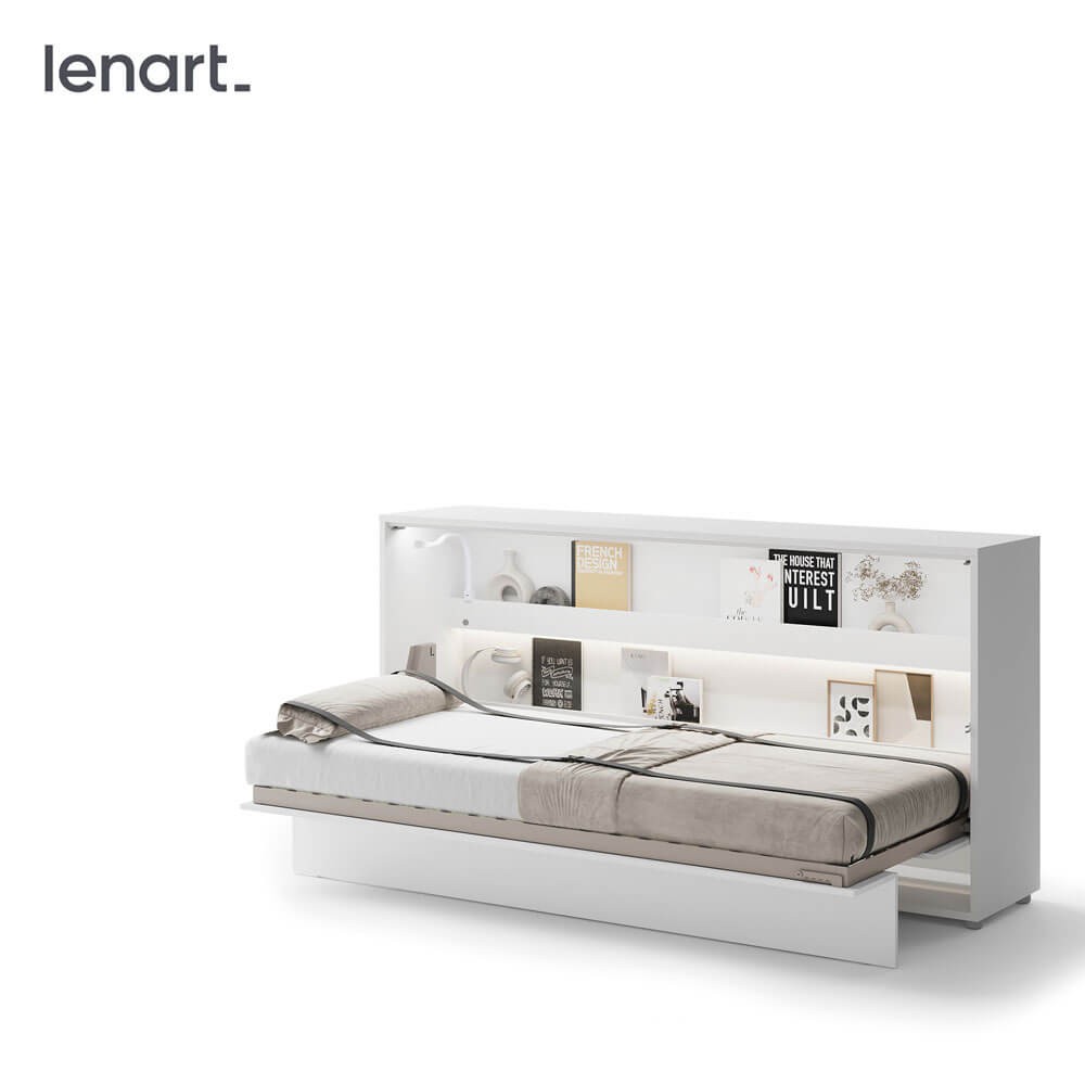 „Lenart BED CONCEPT BC-06“ – tai 90° horizontali sieninė lova, pasižyminti kompaktišku dizainu ir moderniu stiliumi. Šis modelis sukurtas žmonėms, norintiems maksimaliai išnaudoti erdvę savo namuose neprarandant patogios miegojimo vietos. „Lenart BED CONCEPT BC-06“ – tai praktiškas sprendimas mažiems butams, studijoms ar jaunimo kambariams, kur svarbus kiekvienas kvadratinis metras. Horizontali lova skirta 90 cm pločio čiužiniui, todėl tai puiki patogi miegojimo vieta vaikui, paaugliui ar vienam asmeniui. Sieninėje lovoje yra vidinės lentynos, kuriose galima laikyti knygas, dekoracijas ar smulkius daiktus. Visa konstrukcija yra tvirta, o valdymo mechanizmas leidžia atidaryti ir uždaryti lengvai, saugiai ir praktiškai tyliai. BC-06 modelis buvo giriamas už savo funkcines savybes – švelnaus uždarymo sistema, pneumatiniai keltuvai ir patalynės dirželiai daro jį patogų ir paprastą naudoti. Minimalistinis dizainas ir balta spalva paverčia jį universaliu baldu, kuris papildys įvairius interjero dizaino stilius. Tai puikus praktiškumo ir elegancijos derinys, leidžiantis sukurti modernią, bet patogią erdvę.