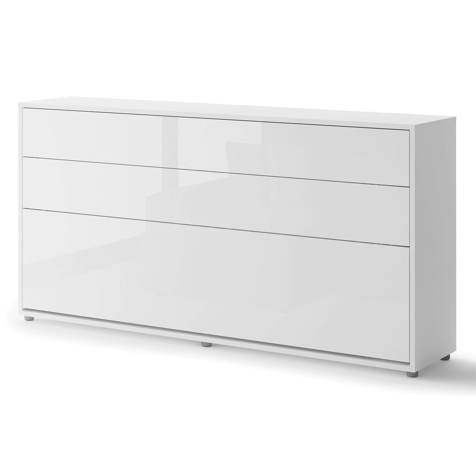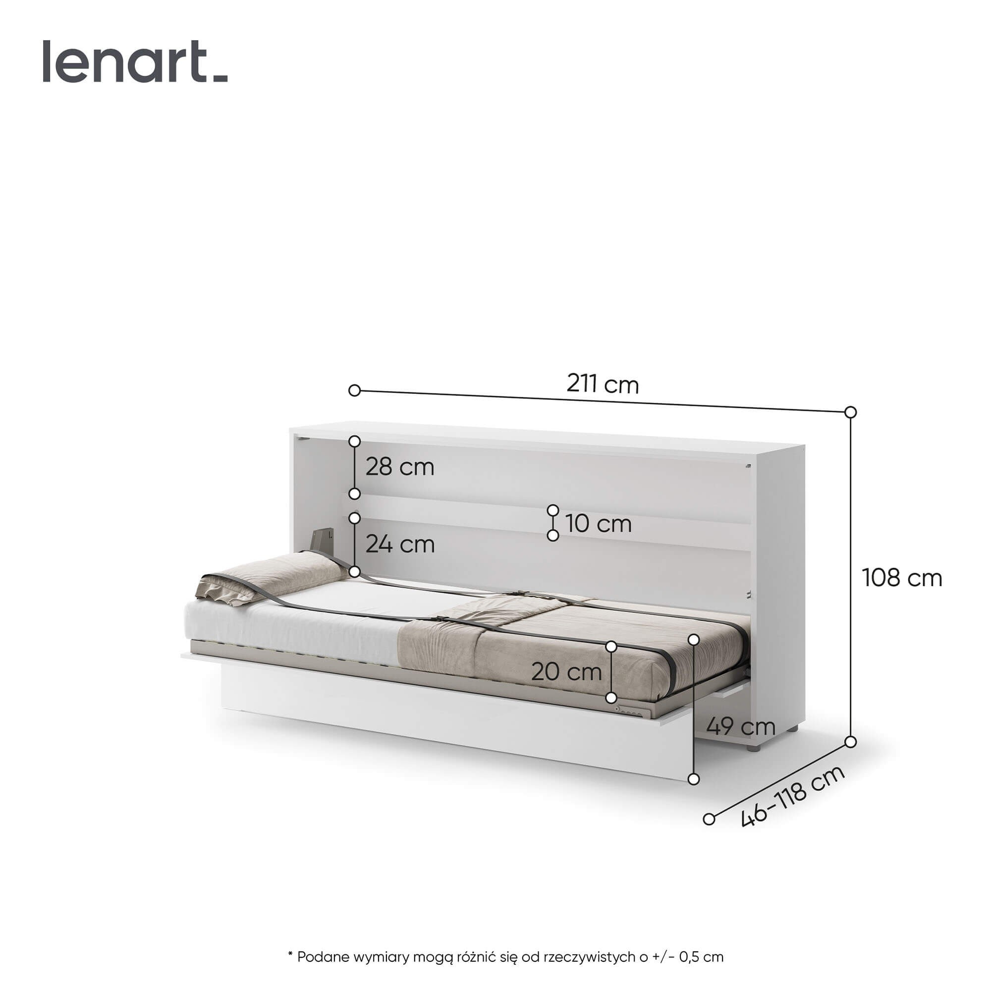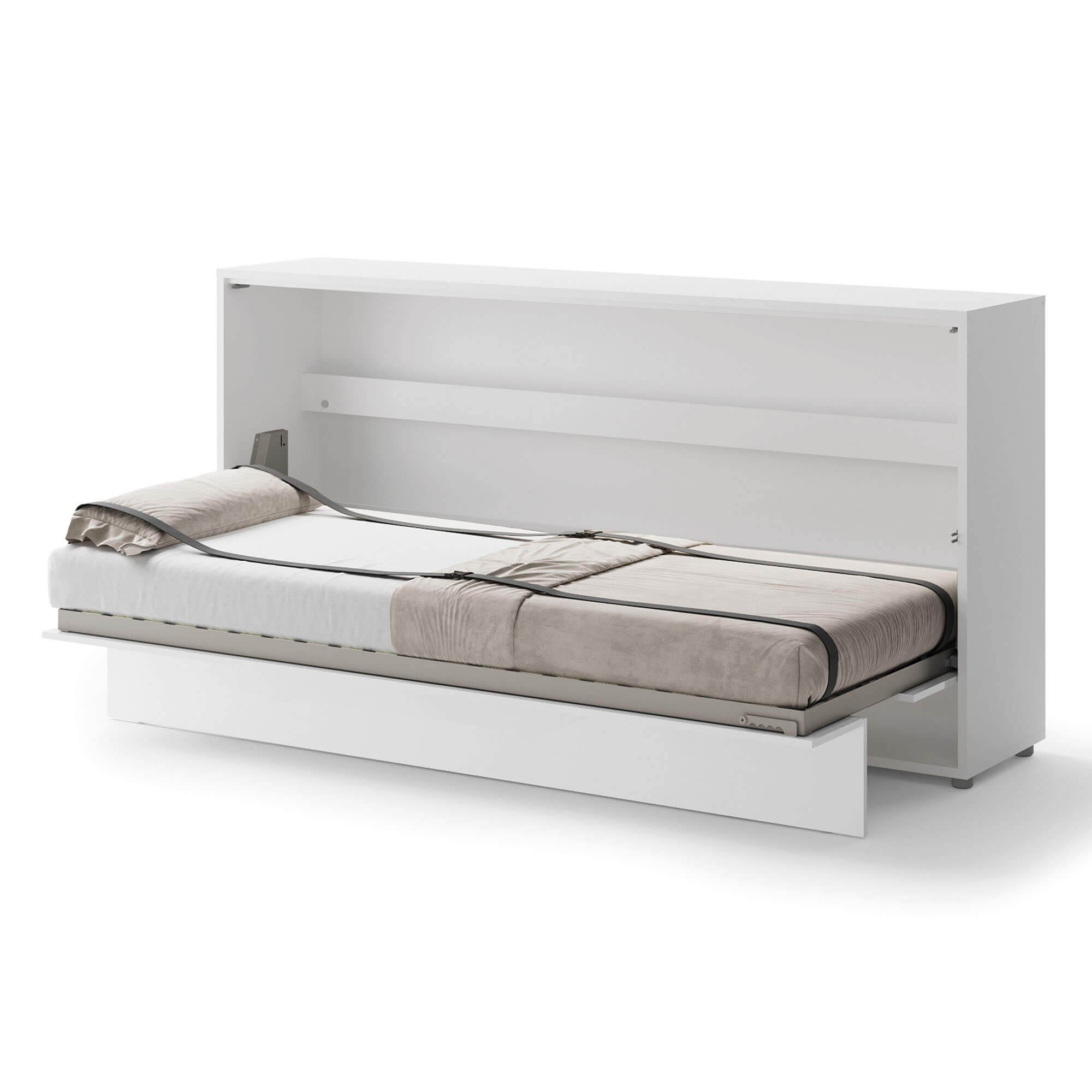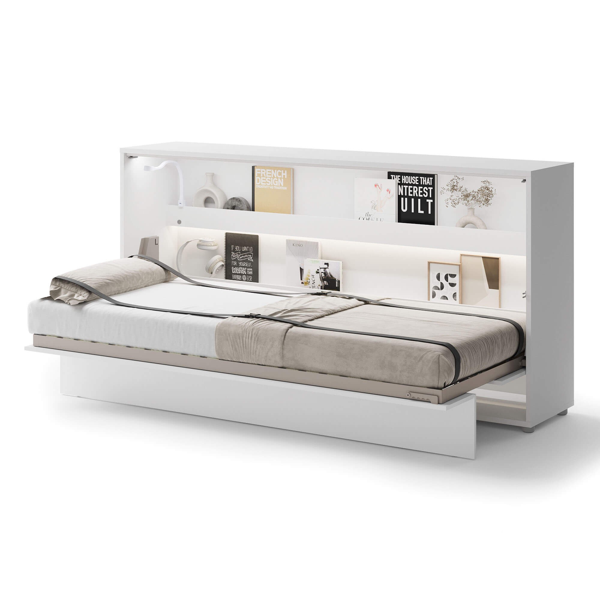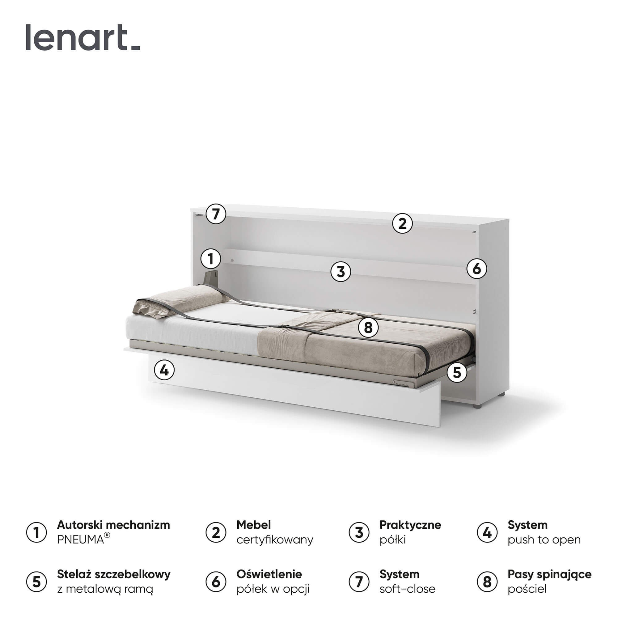 „Lenart BED CONCEPT BC-06p“ – tai 90° kampu horizontali sieninė lova blizgios baltos spalvos, skirta tiems, kurie vertina funkcionalumą ir modernų stilių. Tai puikus sprendimas mažiems butams, studijos tipo apartamentams, jaunimo kambariams ar svečių kambariams, kur svarbus kiekvienas erdvės centimetras. „Lenart BED CONCEPT BC-06p“ akimirksniu pavers jūsų svetainę patogiu miegamuoju, o elegantiška, blizgi apdaila suteikia interjerui modernumo. Lova, sukurta 90 cm pločio čiužiniui, puikiai tinka vienam asmeniui, vyresniam vaikui ar paaugliui. Įmontuotos lentynos leidžia laikyti knygas, dekoracijas ar kasdienius reikmenis. Pneumatiniai keltuvai ir švelnaus uždarymo sistema užtikrina patogų ir saugų atidarymą bei uždarymą, o patalynės tvirtinimo dirželiai užtikrina, kad jums nereikės rūpintis papildoma daiktų laikymo vieta. Tvirta, prie sienos tvirtinama konstrukcija, metalinis rėmas, grotelių rėmas ir kruopšti apdaila daro lovą tokią pat patogią ir patvarią, kaip ir klasikiniai miegamojo baldai. Tai praktiškas ir elegantiškas sprendimas, kuris padės jums sukurti funkcionalią ir estetiškai patrauklią erdvę.
