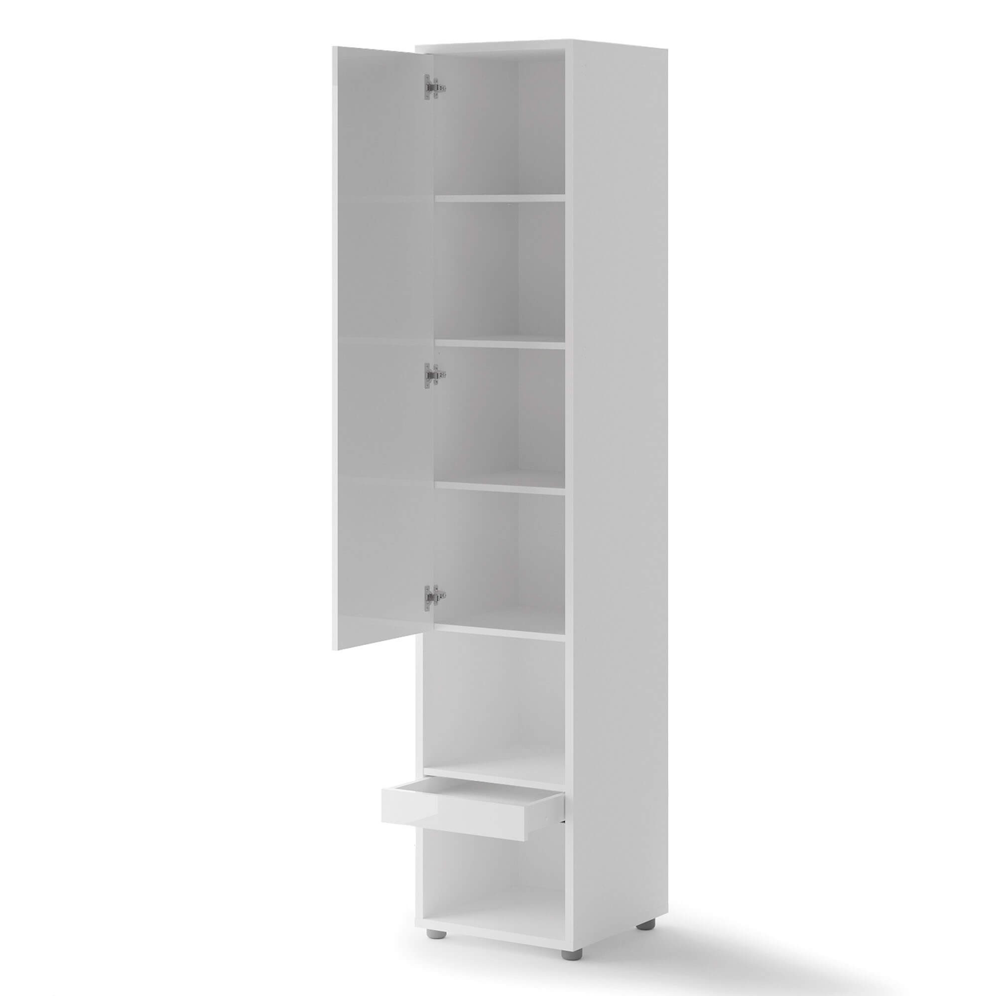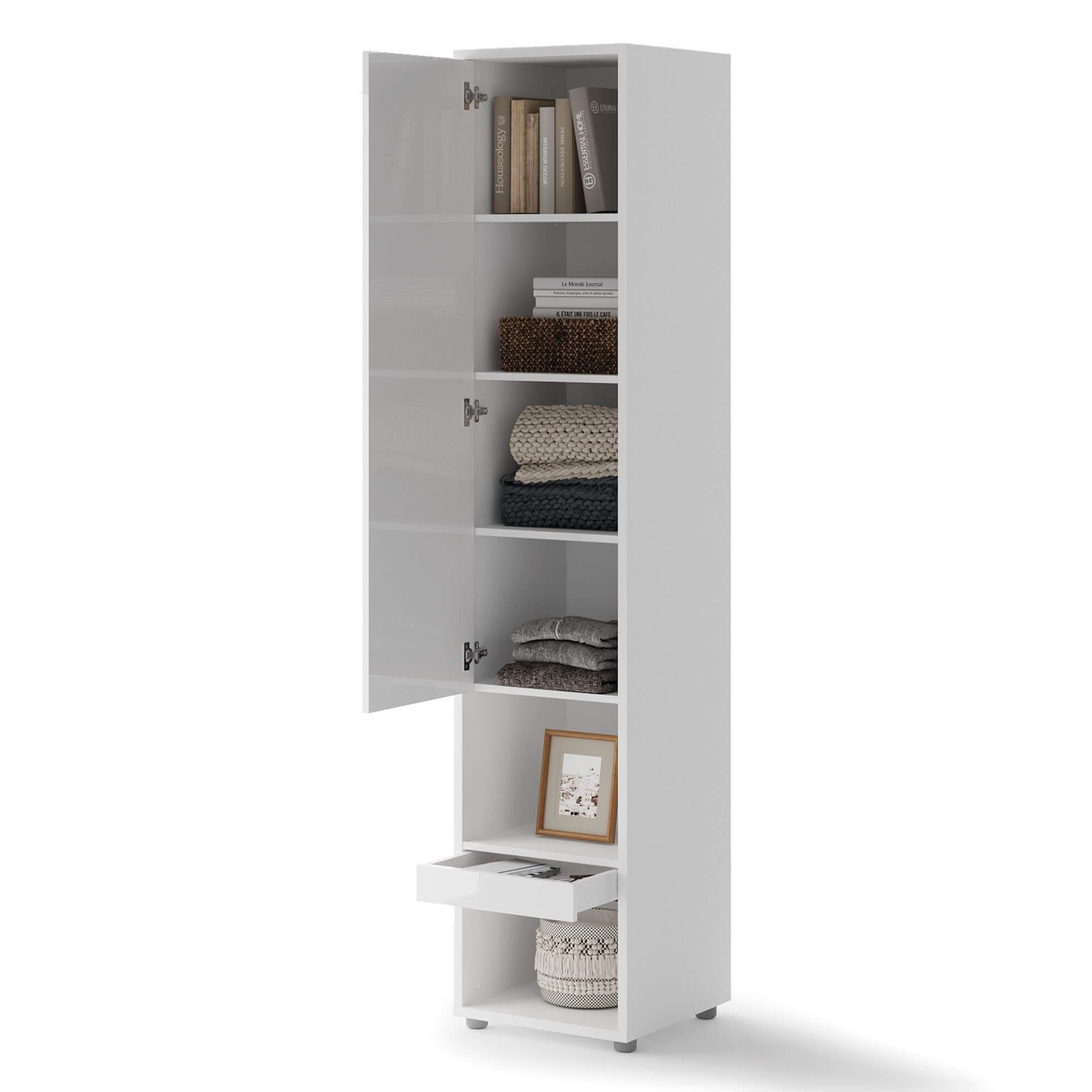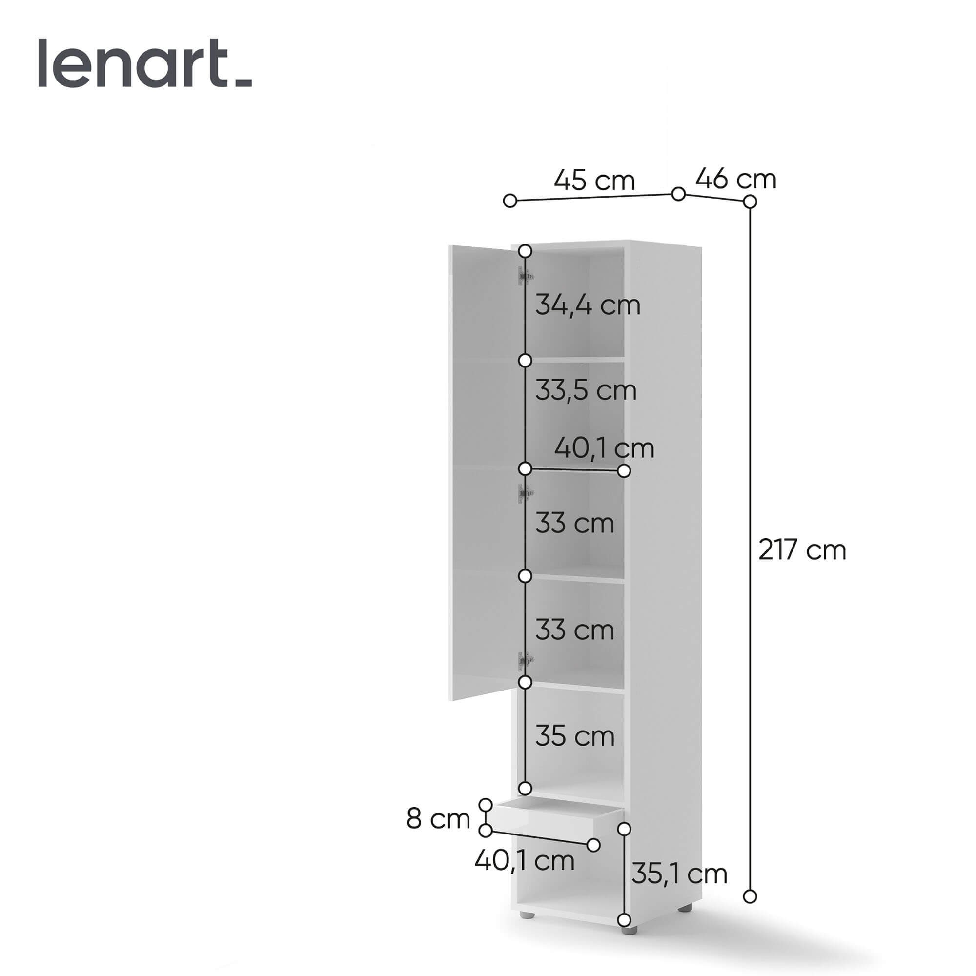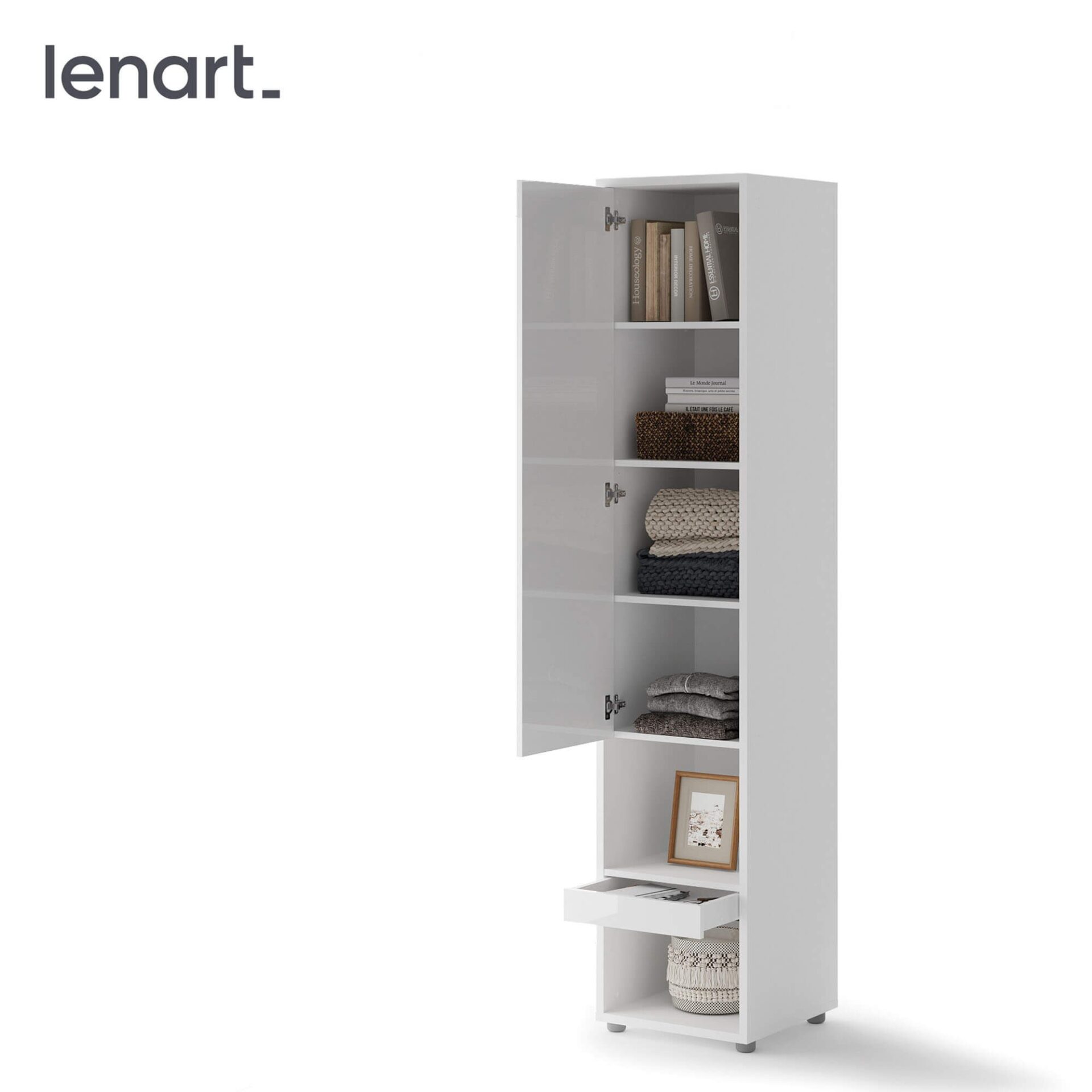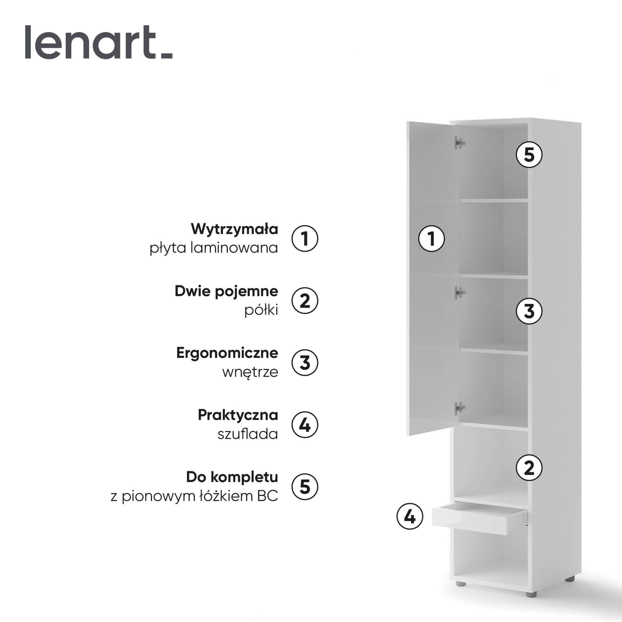 „Lenart BED CONCEPT BC-07p“ – tai blizgios baltos spalvos vieno kambario spintelė, sukurta kaip puikus BED CONCEPT kolekcijos vertikalių lovų papildymas. Šis aukštas spintelė su durelėmis, atviromis nišomis ir praktišku stalčiumi pagerina sieninės lovos funkcionalumą ir suteikia visam spintelės dizainui tradicinio miegamojo įvaizdį. „Lenart BED CONCEPT BC-07p“ derina modernų vaizdą su praktiškumu, puikiai tinkančiu moderniam interjerui. Lentyna suteikia patogų vidų drabužiams, aksesuarams ir kasdieniams daiktams laikyti. Atvira dalis puikiai tinka knygoms, dekoracijoms ar suvenyrams eksponuoti, o apatinis stalčius suteikia papildomos vietos mažesniems daiktams, pavyzdžiui, papuošalams. Blizgios baltos spalvos fasadai suteikia spintelei elegantiško charakterio ir vizualiai pagyvina erdvę, todėl visa konstrukcija atrodo lengvesnė ir modernesnė. Tvirta konstrukcija su patvariomis medžiagomis garantuoja ilgaamžiškumą ir atsparumą kasdieniam naudojimui. Minimalistinis stilius ir blizgi apdaila leidžia spintelei lengvai papildyti kitus BED CONCEPT kolekcijos elementus ir įvairius interjero dizainus.