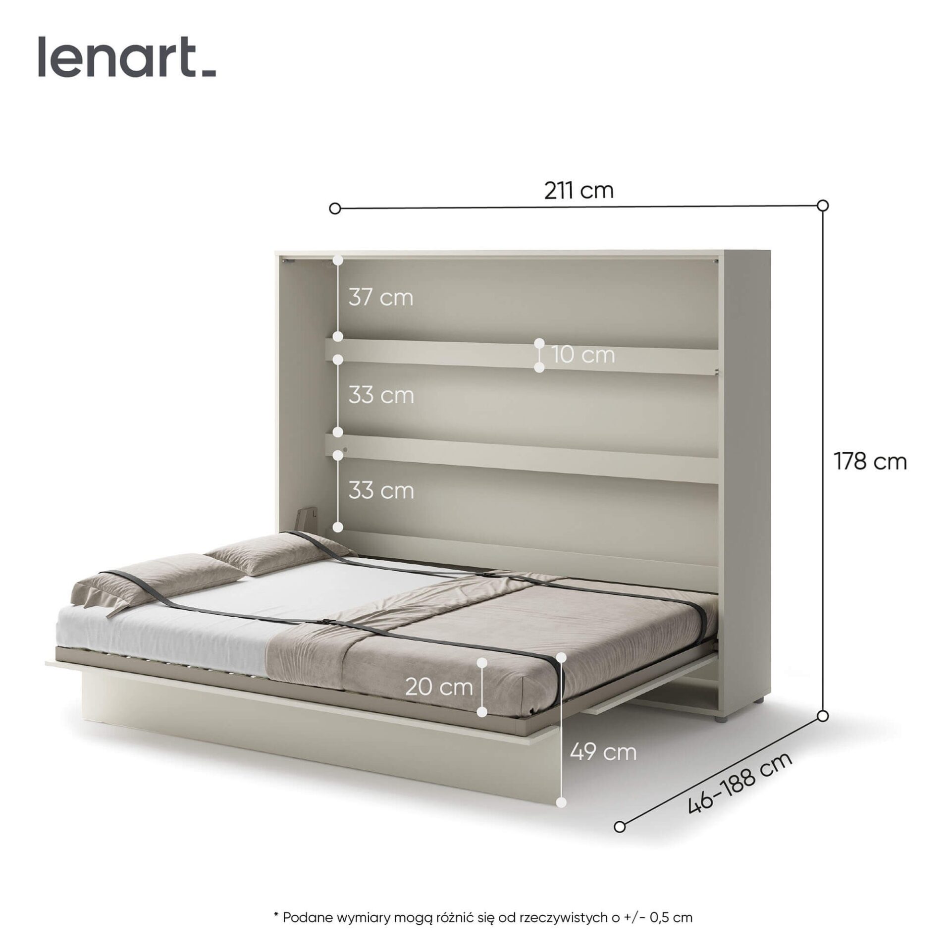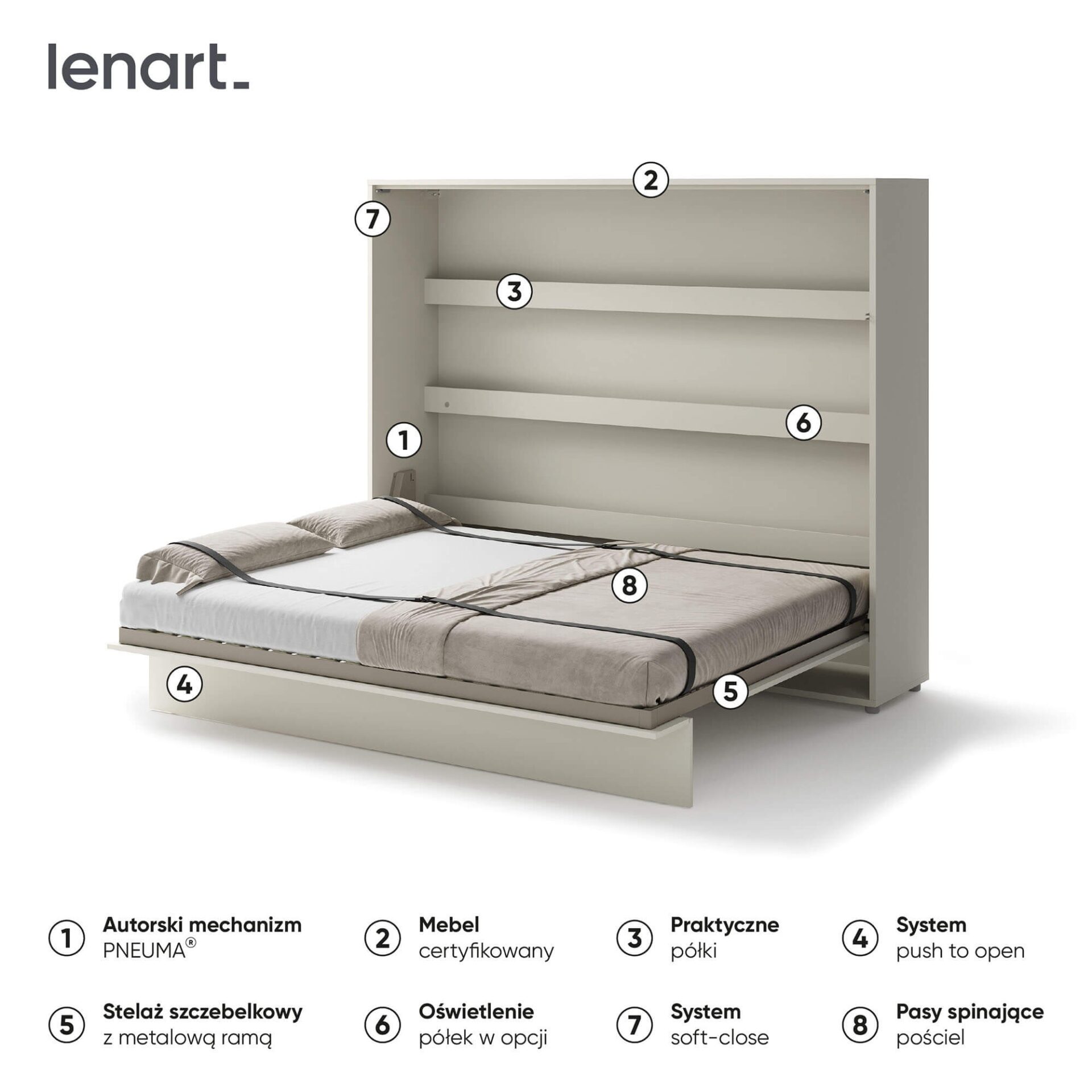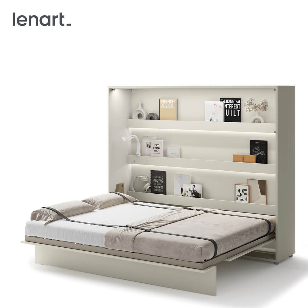 „Lenart BED CONCEPT BC-14“ – tai horizontali sieninė lova, skirta 160 cm čiužiniui, kašmyro spalvos. „Lenart“ sukūrė šį modelį galvodamas apie modernų interjerą, kuriame svarbiausia yra patogumas ir vietos taupymas. Dėl horizontalaus dizaino lova idealiai tinka mažesniems kambariams, o universalus dizainas dera prie įvairių dekorų. BC-14 sieninė lova turi praktiškas vidines lentynas, kuriose patogu laikyti knygas, dekoracijas ir kasdienius daiktus. Sulankstymo mechanizmas sukurtas patogumui ir saugumui – jį palaiko pneumatiniai keltuvai, metalinis rėmas ir grotelių rėmas. Švelnaus uždarymo sistema užtikrina tylų ir sklandų uždarymą, o patalynės dirželiai leidžia laikyti antklodę ir pagalves šalia lovos. Modelis pagamintas iš aukštos kokybės laminuotos plokštės ir MDF, atsparios įbrėžimams ir drėgmei. Korpusas ir priekinė dalis apdailinti ABS kraštais, o rankena pagaminta iš natūralios odos. Subtilus kašmyro spalvos dizainas suteikia baldui elegantišką akcentą ir sukuria lengvą bei jaukią atmosferą. Sieninė lova BC-14 laimėjo 2019 m. Poznanės tarptautinės parodos aukso medalį, patvirtinantį aukštą jos kokybę ir funkcionalumą. Prie jos galima pridėti prailginimus ir LED apšvietimą.