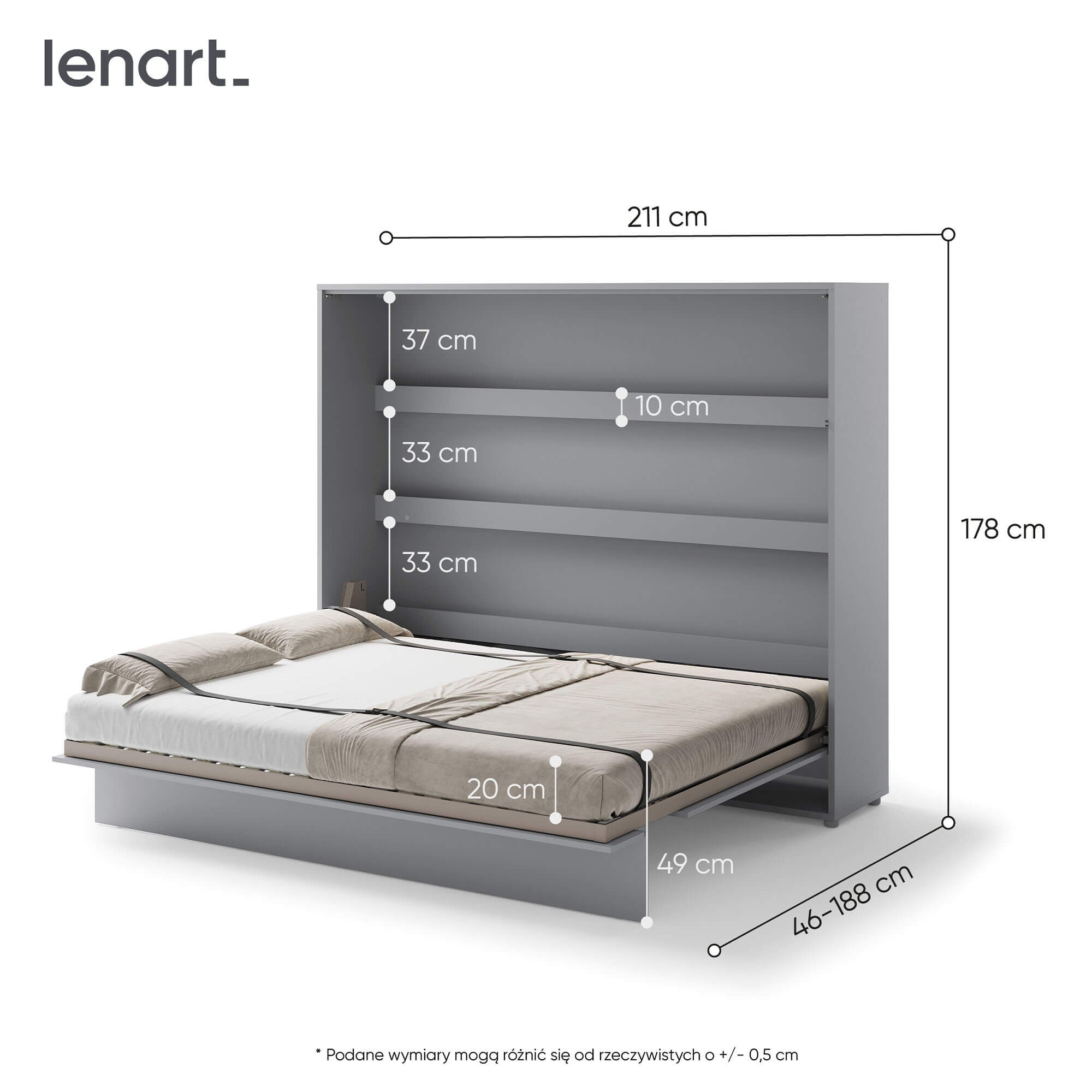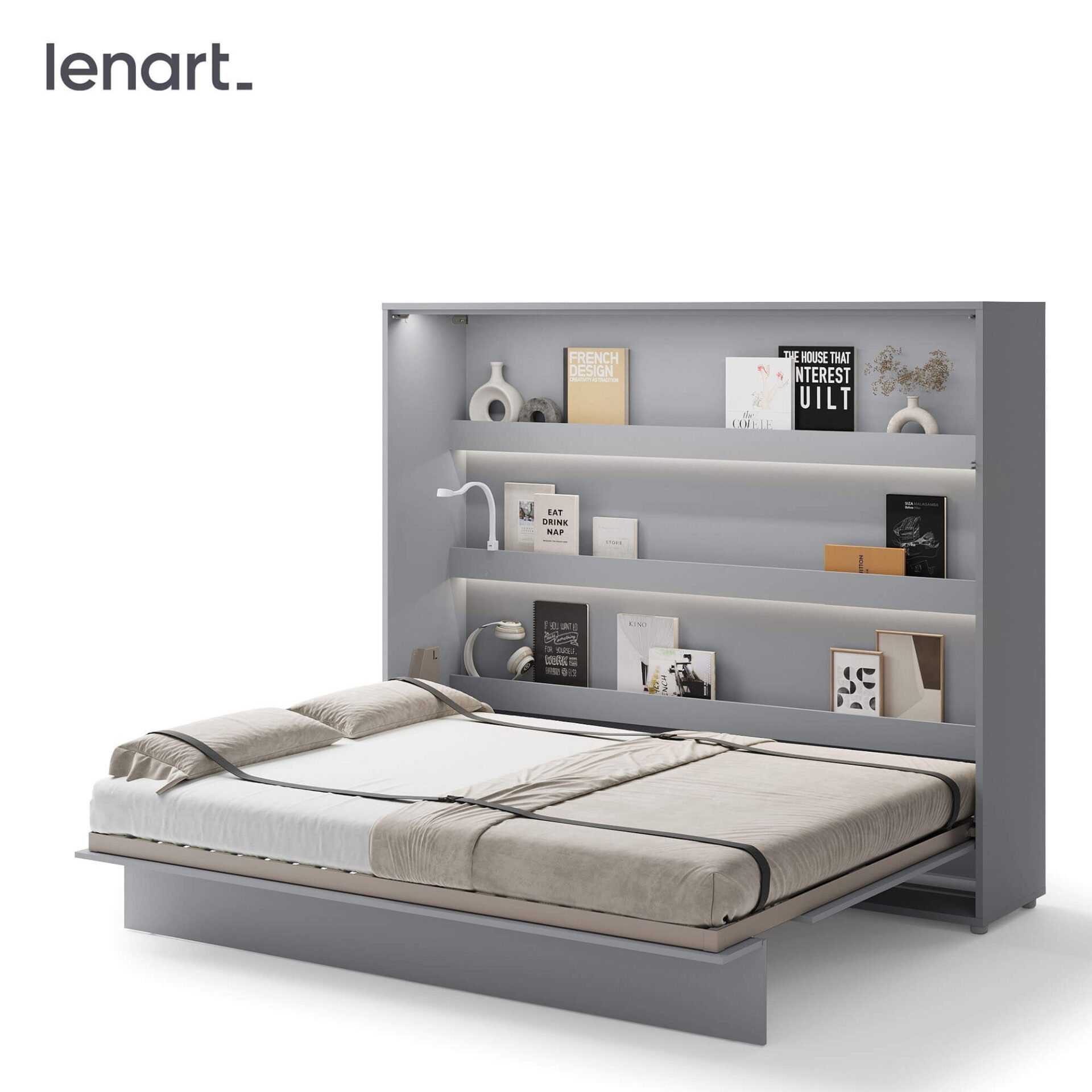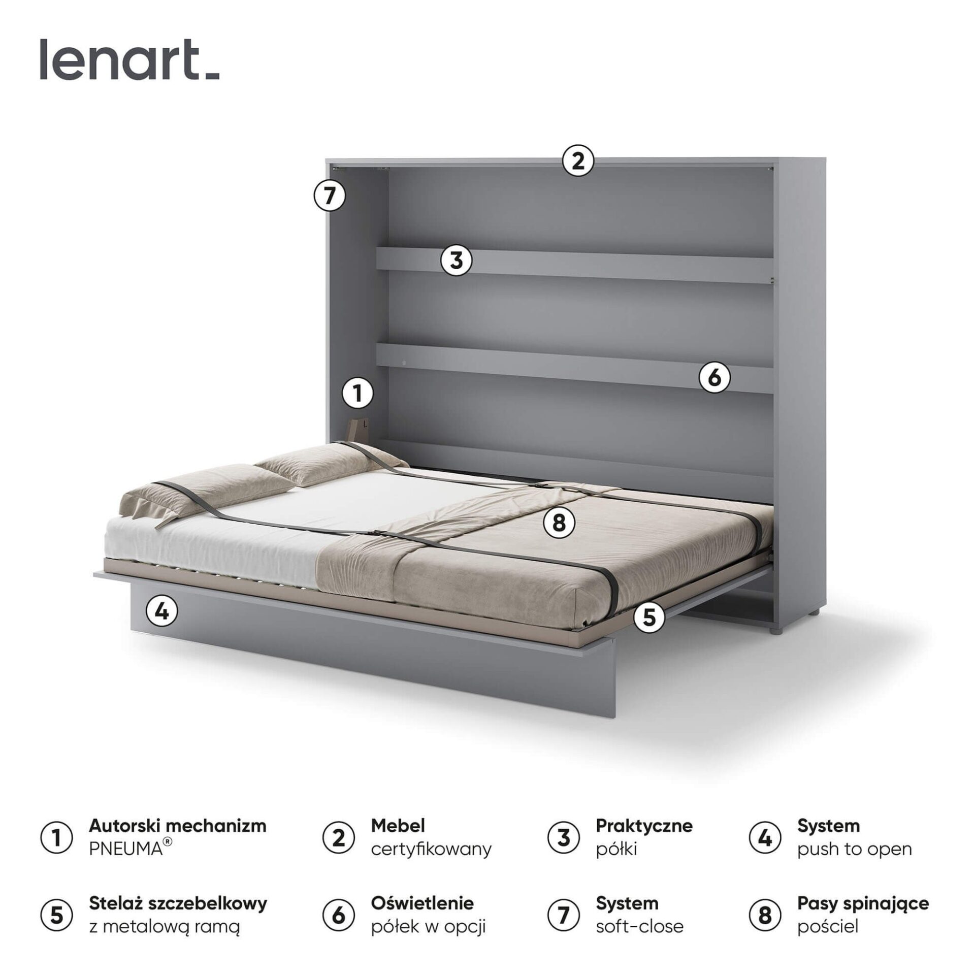 „Lenart BED CONCEPT BC-14“ – horizontali sieninė lova 160 cm čiužiniui, pilkos spalvos. „Lenart“ sukūrė šį modelį tiems, kurie nori suderinti kasdienio miego komfortą su modernia išvaizda ir maksimaliu erdvės išnaudojimu. Dėl savo dizaino BC-14 puikiai tinka mažiems butams, jaunimo kambariams, studijos tipo apartamentams ar svečių kambariams. Lova turi praktiškas vidines lentynas, puikiai tinkančias knygoms, dekoracijoms ar kasdieniams daiktams laikyti. Tvirtas metalinis rėmas ir grotelių rėmas užtikrina komfortą ir ilgaamžiškumą, o pneumatiniai keltuvai leidžia lengvai ir saugiai atidaryti. Sieninė lova taip pat aprūpinta švelnaus uždarymo sistema, užtikrinančia tylų ir sklandų uždarymą. Diržai, tvirtinantys patalynę, leidžia sulankstyti lovą su antklode ir pagalvėmis, todėl nereikia papildomos vietos daiktams laikyti. Baldai pagaminti iš laminuotos ir MDF plokštės, atsparios pažeidimams ir drėgmei. Priekinės dalys ir karkasai apsaugoti ABS apvadais, o rankena pagaminta iš natūralios odos. Pilka spalva daro baldą universalų ir tinkantį įvairiems interjerams – tiek moderniems, tiek klasikiniams. Jį taip pat galima išplėsti naudojant prailginimus ir LED apšvietimą, kad dar labiau pritaikytumėte savo poreikiams.