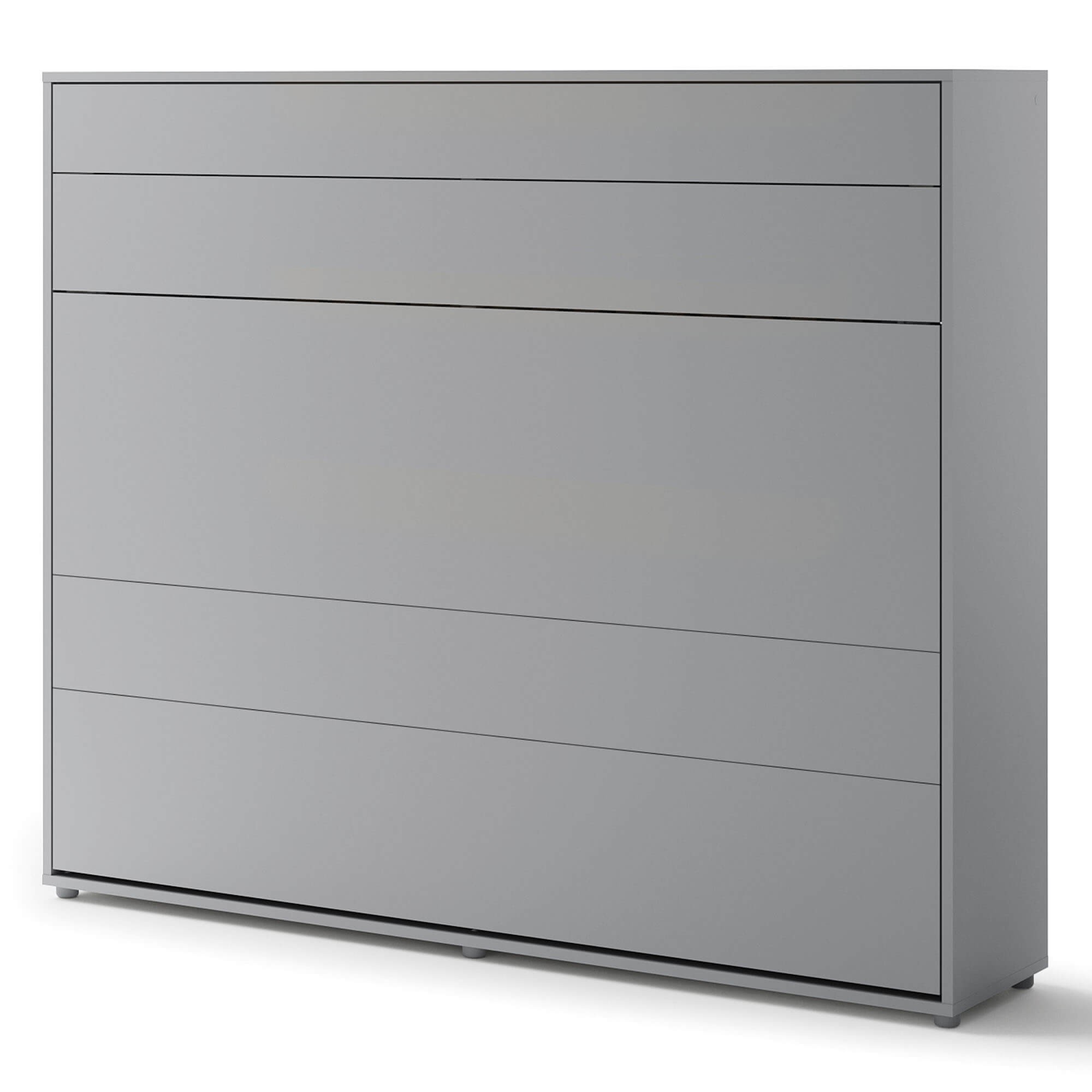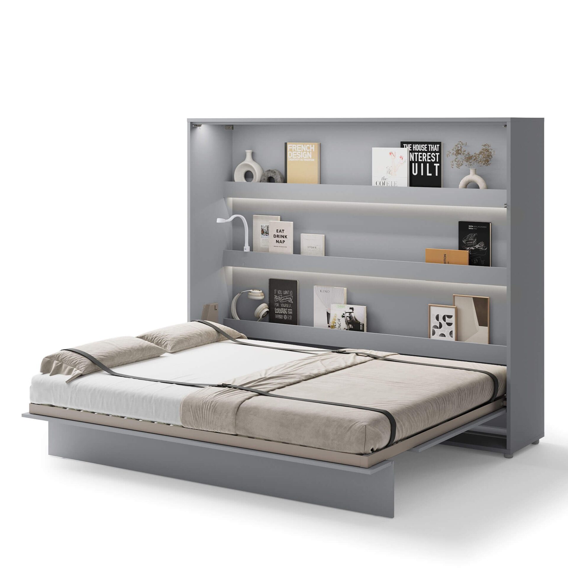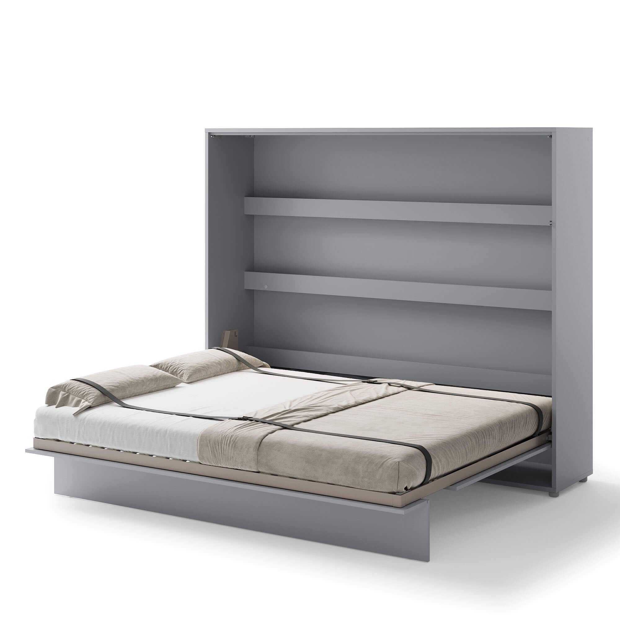 „Lenart BED CONCEPT BC-14“ – horizontali sieninė lova 160 cm čiužiniui, pilkos spalvos. „Lenart“ sukūrė šį modelį tiems, kurie nori suderinti kasdienio miego komfortą su modernia išvaizda ir maksimaliu erdvės išnaudojimu. Dėl savo dizaino BC-14 puikiai tinka mažiems butams, jaunimo kambariams, studijos tipo apartamentams ar svečių kambariams. Lova turi praktiškas vidines lentynas, puikiai tinkančias knygoms, dekoracijoms ar kasdieniams daiktams laikyti. Tvirtas metalinis rėmas ir grotelių rėmas užtikrina komfortą ir ilgaamžiškumą, o pneumatiniai keltuvai leidžia lengvai ir saugiai atidaryti. Sieninė lova taip pat aprūpinta švelnaus uždarymo sistema, užtikrinančia tylų ir sklandų uždarymą. Diržai, tvirtinantys patalynę, leidžia sulankstyti lovą su antklode ir pagalvėmis, todėl nereikia papildomos vietos daiktams laikyti. Baldai pagaminti iš laminuotos ir MDF plokštės, atsparios pažeidimams ir drėgmei. Priekinės dalys ir karkasai apsaugoti ABS apvadais, o rankena pagaminta iš natūralios odos. Pilka spalva daro baldą universalų ir tinkantį įvairiems interjerams – tiek moderniems, tiek klasikiniams. Jį taip pat galima išplėsti naudojant prailginimus ir LED apšvietimą, kad dar labiau pritaikytumėte savo poreikiams.