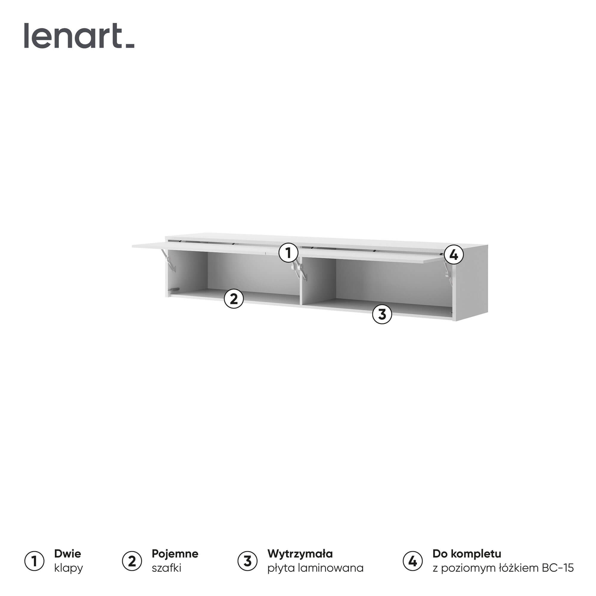 „Lenart BED CONCEPT BC-15“ – tai specialiai BC-14 sieninei lovai sukurtas priedas. „Lenart“ jį sukūrė siekdamas sukurti darnų ir modernų priedą su lova, taupydamas erdvę ir išnaudodamas visą sienos paviršių. Balta versija pagyvina interjerą ir suteikia jam lengvumo. BC-15 priedas turi dvejas duris, po kuriomis slepiasi erdvios spintelės. Tai praktiška vieta drabužiams, patalynei, dėžėms ar kitiems daiktams, kuriuos norite laikyti po ranka, bet paslėpti. Paprastas ir modernus dizainas puikiai tinka įvairiems interjerams, o kartu su BC-14 sienine lova sukuria estetiškai patrauklią ir funkcionalią visumą. Visas baldas pagamintas iš patvarios laminuotos plokštės ir apvadintas ABS kraštais, kurie apsaugo kraštus ir užtikrina patvarumą nuo kasdienio dėvėjimosi. Tvirta, tačiau lengva konstrukcija užtikrina, kad šis baldas tarnaus ilgus metus neprarandant savo modernaus charakterio.