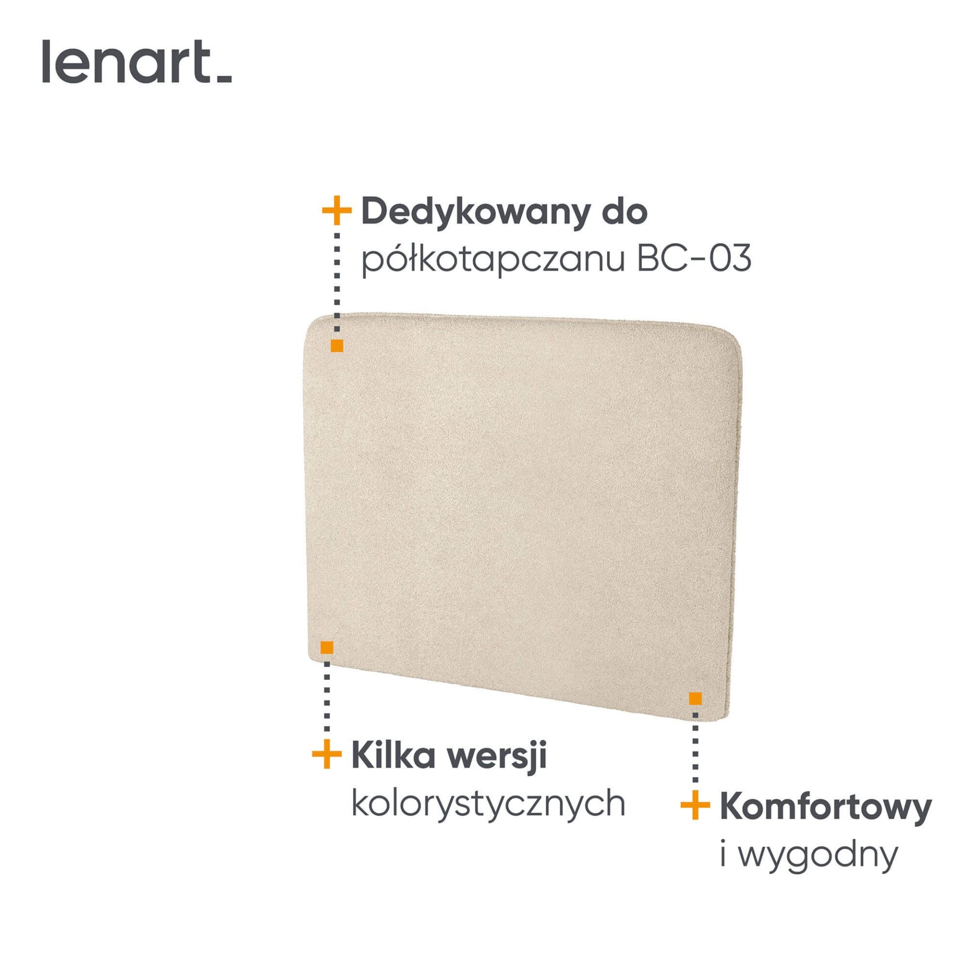 „Lenart BED CONCEPT BC-31“ – tai apmuštas galvūgalis, skirtas BC-03 sieninei lovai su 90 cm pločio čiužiniu. Tai funkcionalus ir elegantiškas priedas, padidinantis lovos komfortą ir suteikiantis jaukumo pojūtį. „Lenart“ užtikrino, kad BC-31 modelis būtų ne tik praktiškas, bet ir estetiškai patrauklus, puikiai papildantis modernų interjerą. Galvos atrama pagaminta iš smėlio spalvos ART-82610 audinio. Ši 300 g/m², 100% PES medžiaga yra minkšta, patvari ir atspari kasdieniam naudojimui. Minkštas užpildas užtikrina patogią atramą skaitant, žiūrint televizorių ar dirbant nešiojamuoju kompiuteriu. Šis praktiškas elementas padidina miego komfortą ir suteikia lovai elegantišką akcentą.