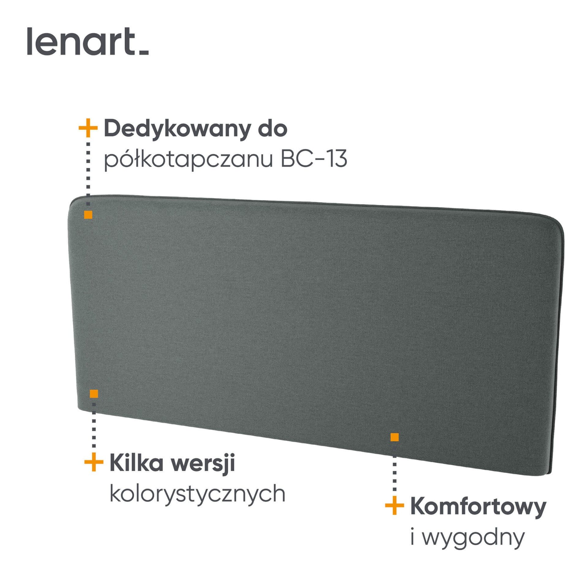 „Lenart BED CONCEPT BC-33“ – tai 180 cm pločio apmuštas galvūgalis, skirtas grafito spalvos BC-13 sieninei lovai. Tai elegantiškas ir praktiškas priedas, padidinantis kasdienio sieninės lovos naudojimo komfortą. „Lenart“ sukūrė šį modelį tiems, kurie vertina funkcionalumą, estetiką ir komfortą miegamajame ar svetainėje. BC-33 galvos atrama suteikia minkštą ir stabilią atramą, todėl vakare skaityti, žiūrėti filmus ar dirbti nešiojamuoju kompiuteriu yra daug patogiau. Grafito spalvos apmušalai suteikia interjerui elegantiško ir modernaus akcento, o universalus dizainas leidžia jį pritaikyti įvairiems interjerams – nuo minimalistinio iki klasikinio. Sukurtas lovai, kurios miegamojo plotas yra 180 x 200 cm, BC-33 galvos atrama sudaro darnią visumą su BC-13 sienine lova, suteikdama jai jaukią ir stilingą išvaizdą.