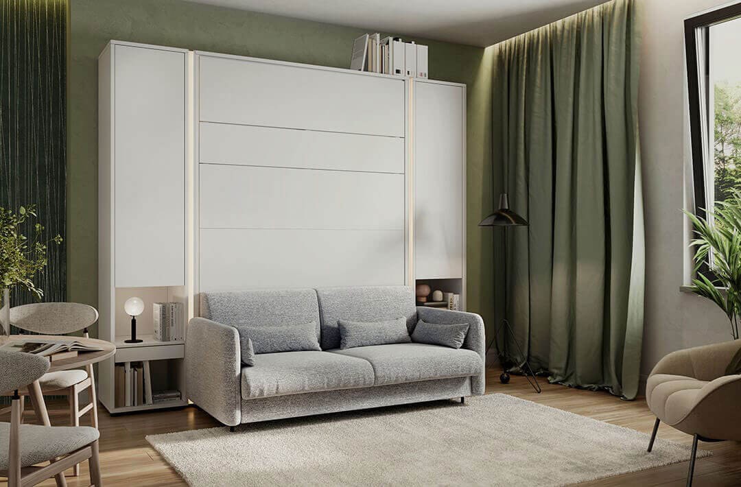 Rekomenduojamas montavimas, kai sieninė lova derinama su sofa ir prailginamuoju moduliu
