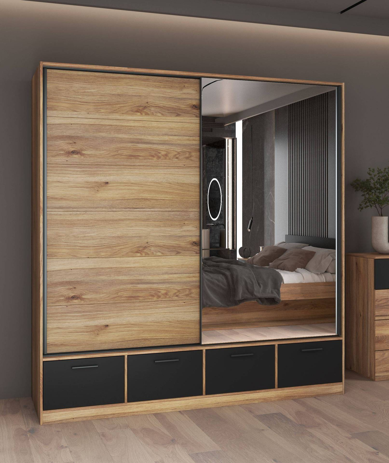 Beta – Drabužinė 2D4S su veidrodžiu, „Mauvella Oak“ matinės juodos spalvos