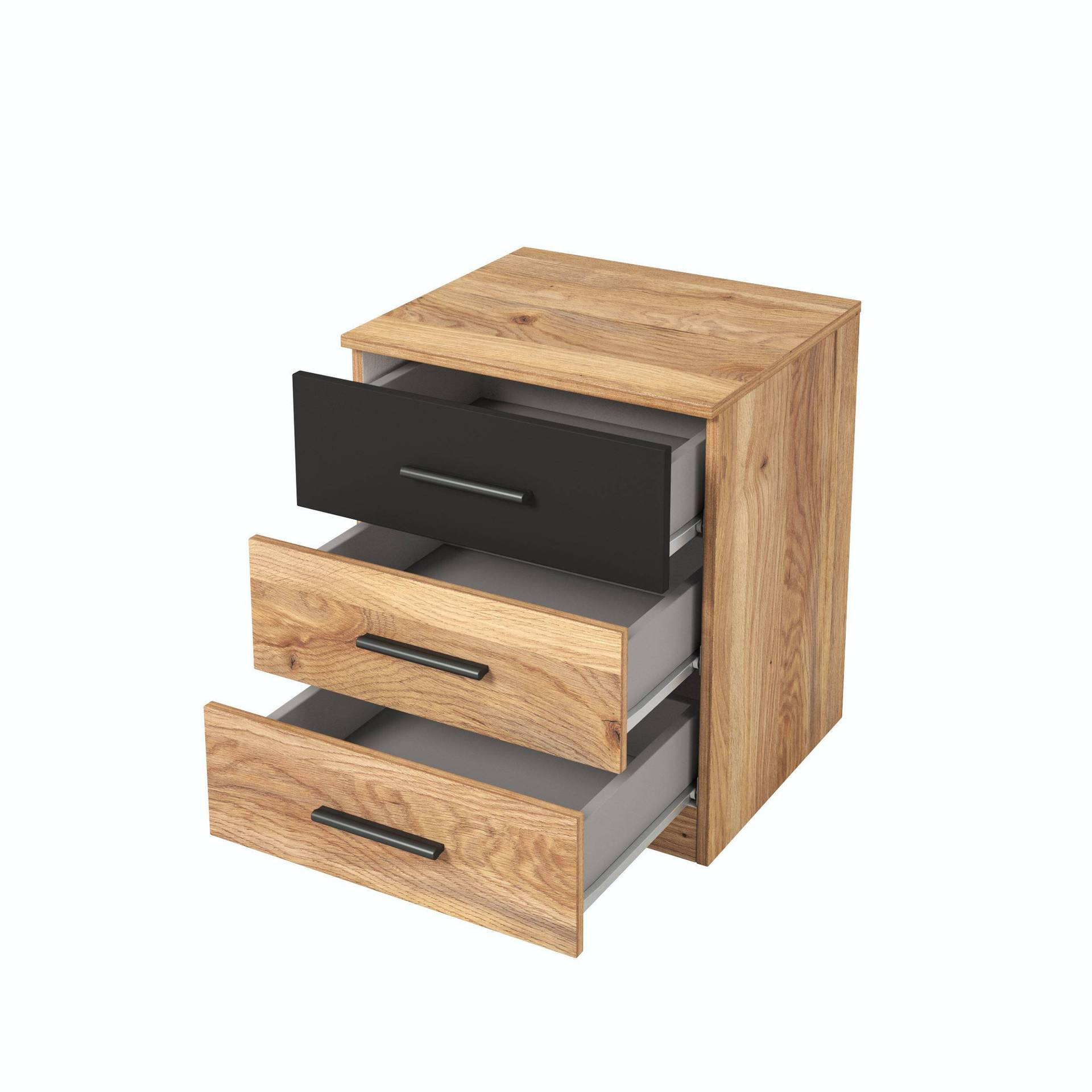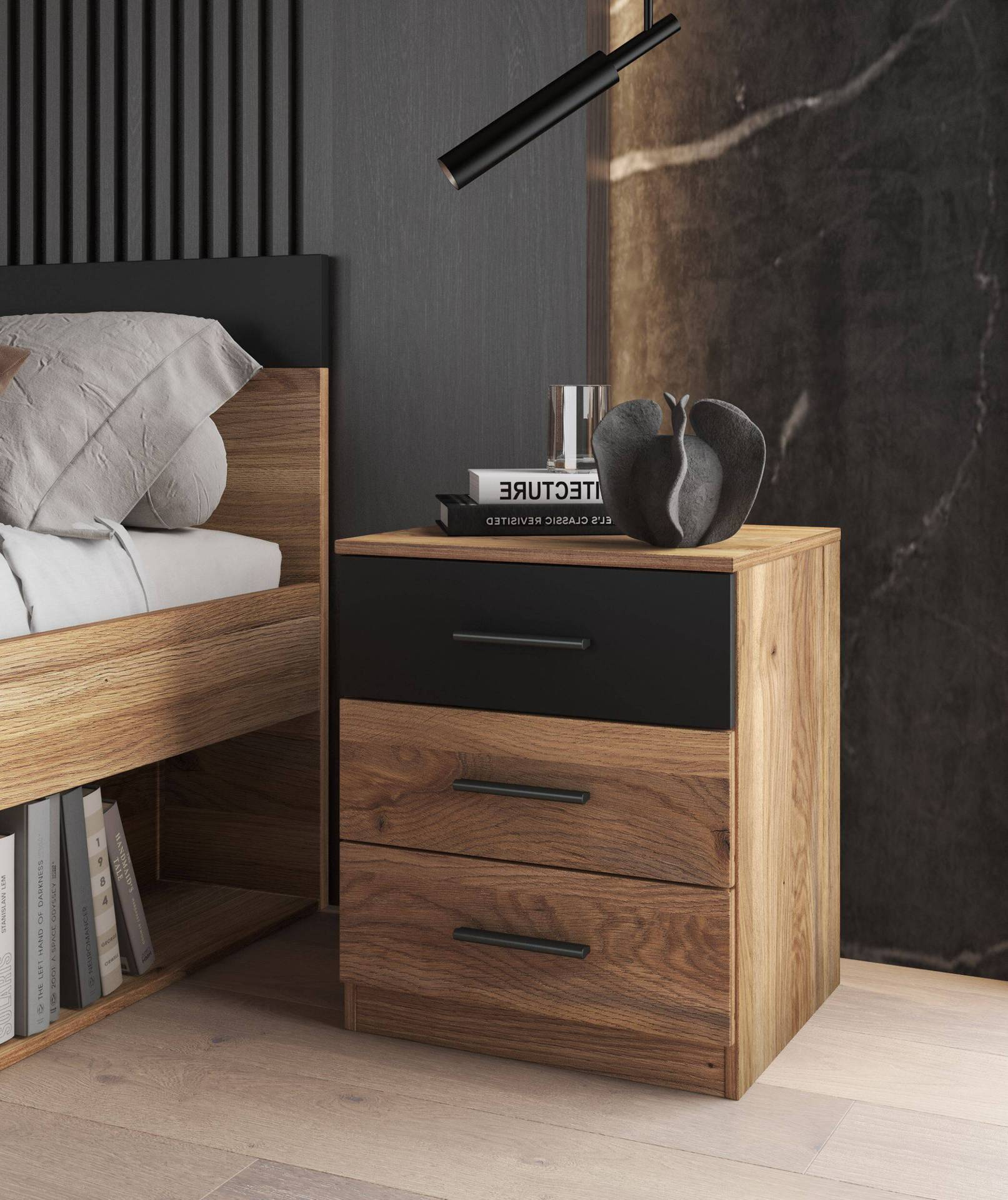Beta – naktinis staliukas su 3 stalčiais, Mauvella ąžuolo spalvos, matinės juodos spalvos