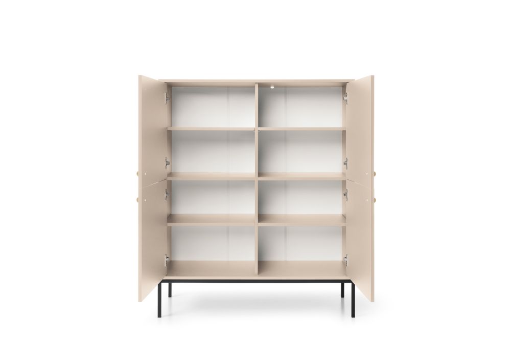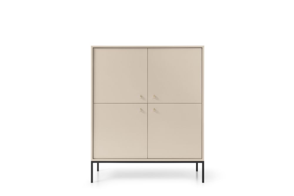 Smėlio spalvos komoda „Mono MK104“ turi keturias spinteles su lentynomis už fasadų.