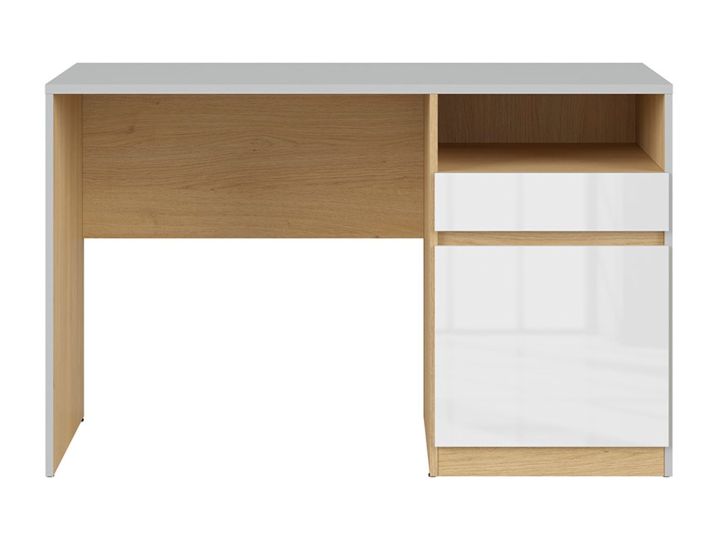 NANDU vienų durų rašomasis stalas su stalčiumi, 120 cm, šviesiai pilka/poliruotas ąžuolas/blizgi balta