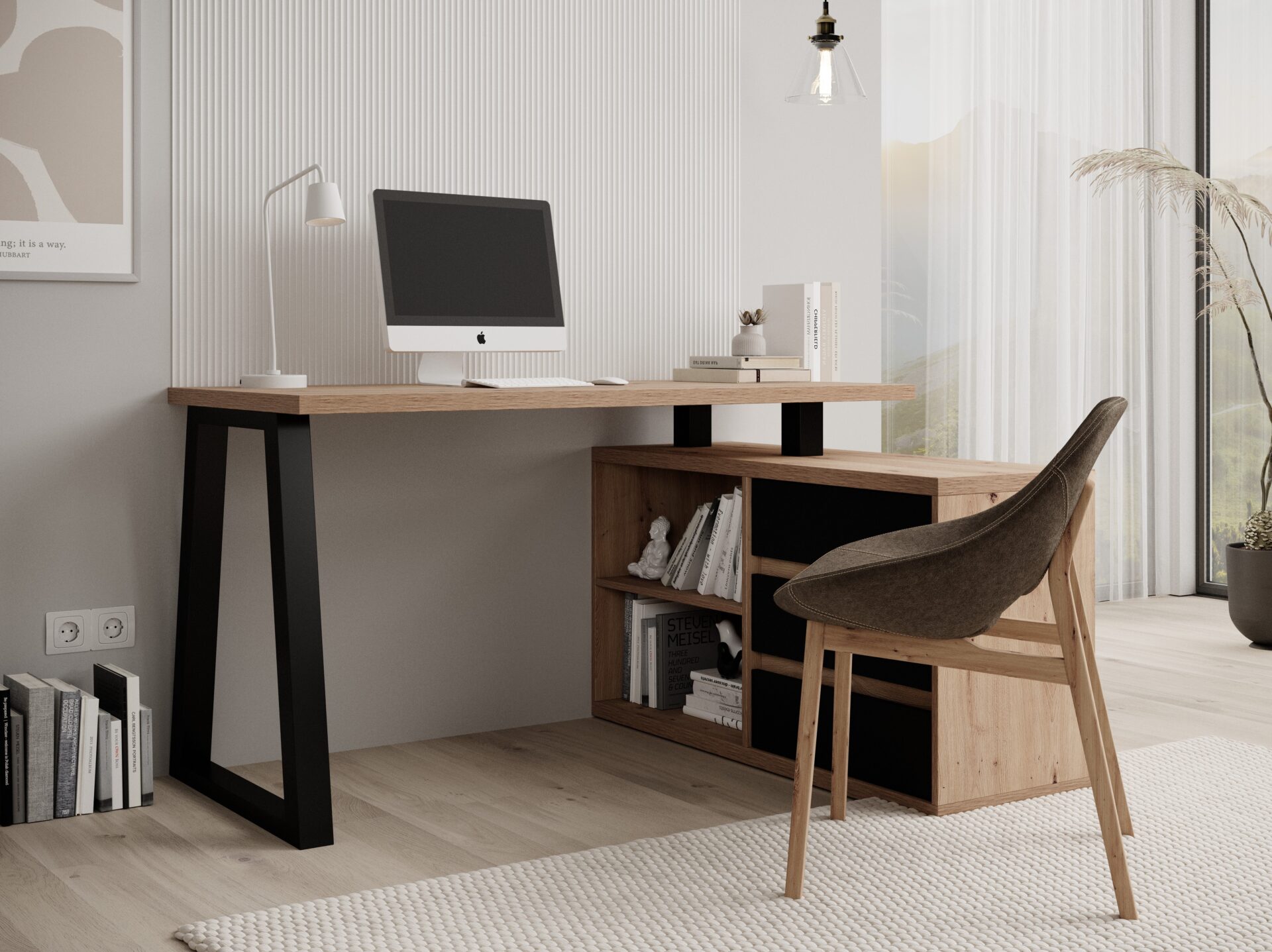 Kampinis stalas IWO II puikiai tinka paauglio kambariui, biurui ar studijai. Dėl kampinio dizaino jis tilps net ir mažose erdvėse. Stalas turi tris stalčius ir erdvią lentyną, todėl jame yra daug vietos biuro reikmenims laikyti. IWO II stalas yra lengvai naudojamas ir universalus baldas, kuris tiks prie daugumos interjerų.