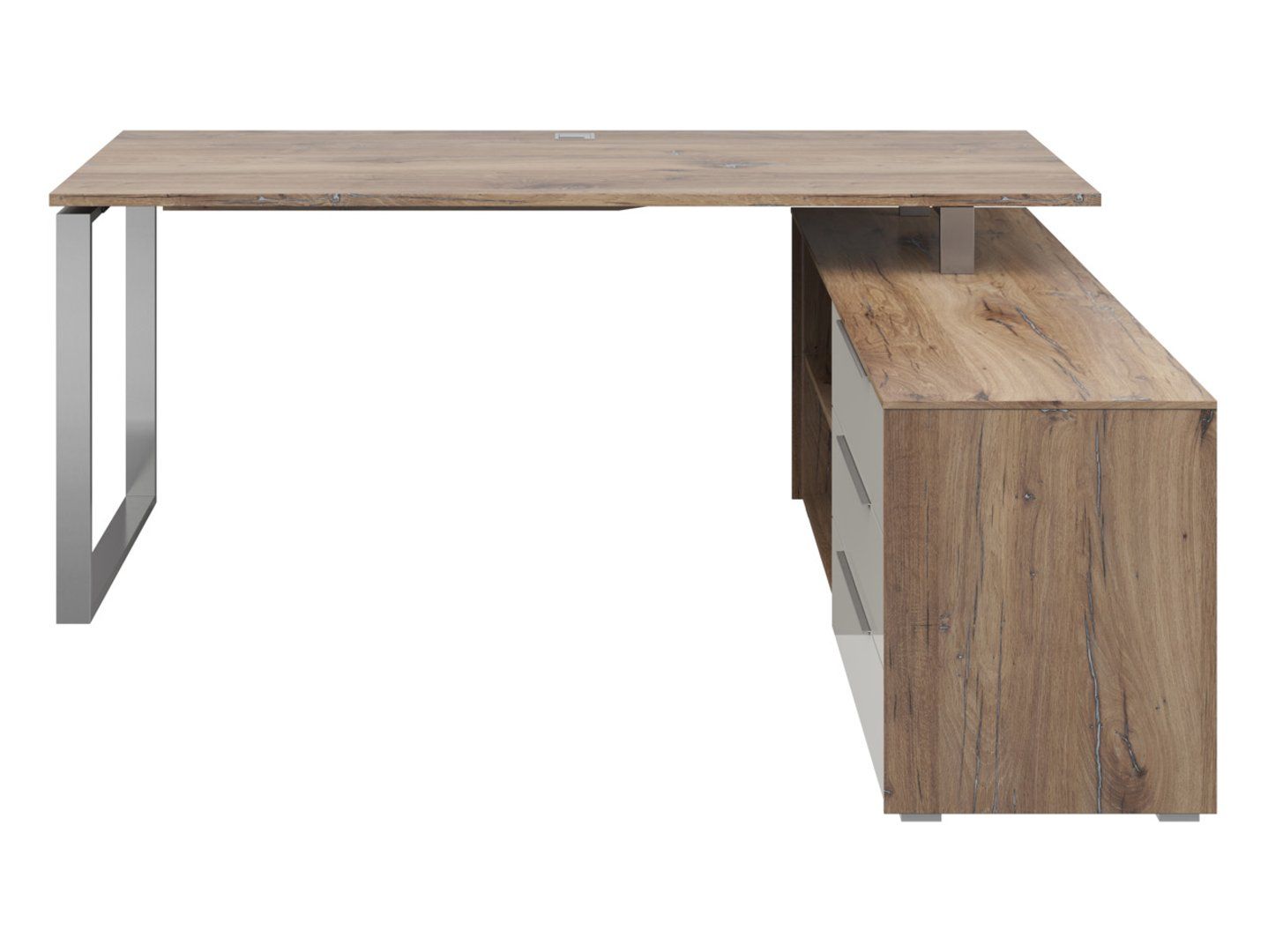 Nevada kampinis rašomasis stalas ant rėmo 158×184 cm su 3 stalčiais ir lentyna, tamsaus vėliavos stiebo ąžuolo spalvos