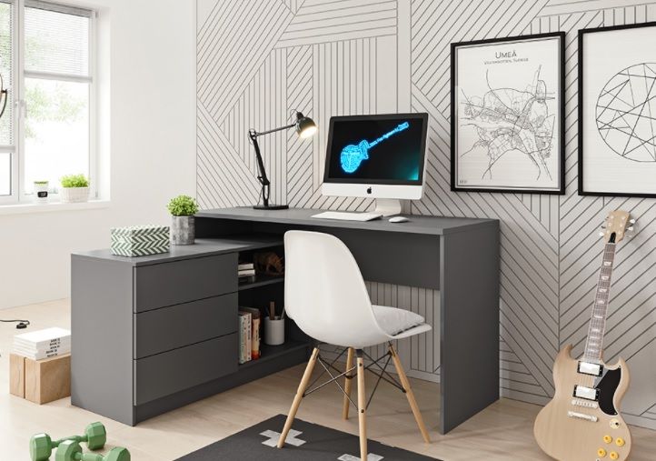 TEO / stalas Funkcinis stalas – puiki vieta mokytis ir dirbti. Spalva: – grafitas Universalus stalas – gali būti montuojamas dešinėje arba kairėje pusėje.