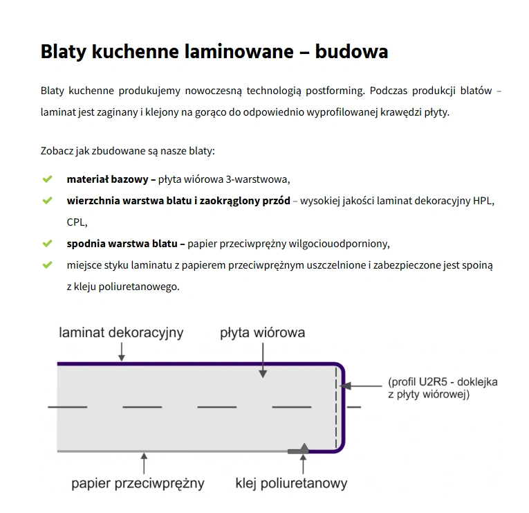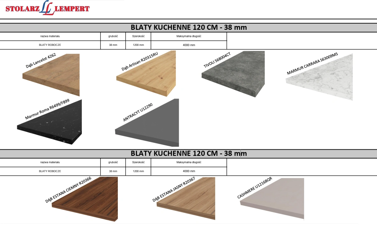 „Stolarz Lempert“ virtuvės stalviršių nominalus gylis yra 120 cm. Šis gilesnis stalviršis leidžia įrengti lango nišą ir sukurti bendrą palangę su stalviršiu.