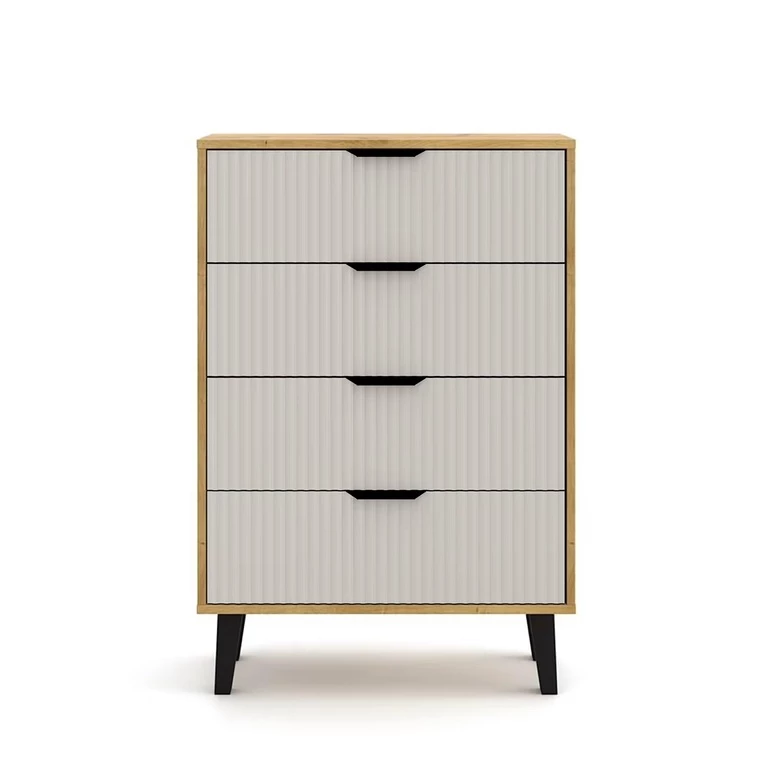 Komoda turi keturis erdvius stalčius, kuriuose lengva susidėti daiktus ir įvairius smulkius daiktus, aksesuarus ir tekstilės gaminius. Šviesios spalvos fasadai su dekoratyviniais grioveliais suteikia bendram dizainui subtilios tekstūros ir elegancijos. Juodos, minimalistinės rankenėlės sukuria estetinį kontrastą su šiltu korpusu ir kašmyro fasadais, pabrėždamos modernų kolekcijos charakterį. Tai funkcionalus ir stilingas pasirinkimas svetainei, miegamajam ar prieškambariui – visur, kur būtinas subalansuotas estetikos ir praktiškumo derinys.