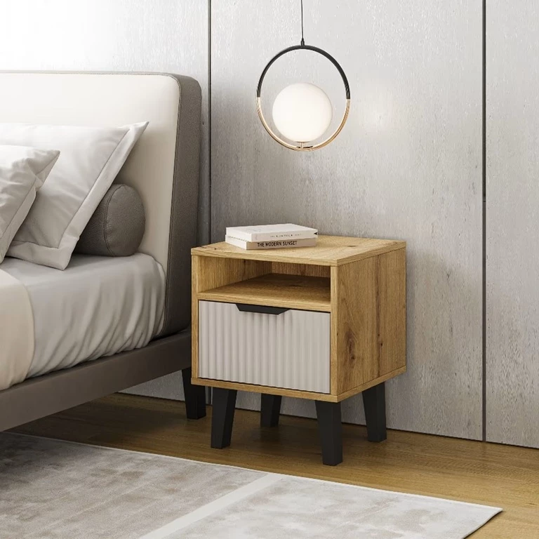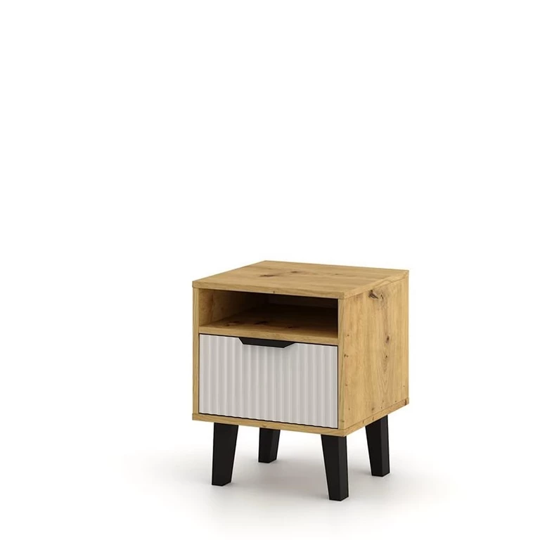 Jame yra vienas praktiškas stalčius ir atvira lentyna – puikiai tinkanti knygai, stiklinėms ar įkrovikliui. Kašmyro fasadas papuoštas subtiliais grioveliais, suteikiančiais baldui unikalų charakterį ir elegantišką tekstūrą. Juodos rankenėlės pabrėžia modernų kolekcijos stilių ir sukuria ryškų kontrastą su šviesiu fasadu ir mediniu korpusu. Tai puikus pasirinkimas kaip funkcionalus miegamojo papildymas, derinantis estetiką su praktiškumu.