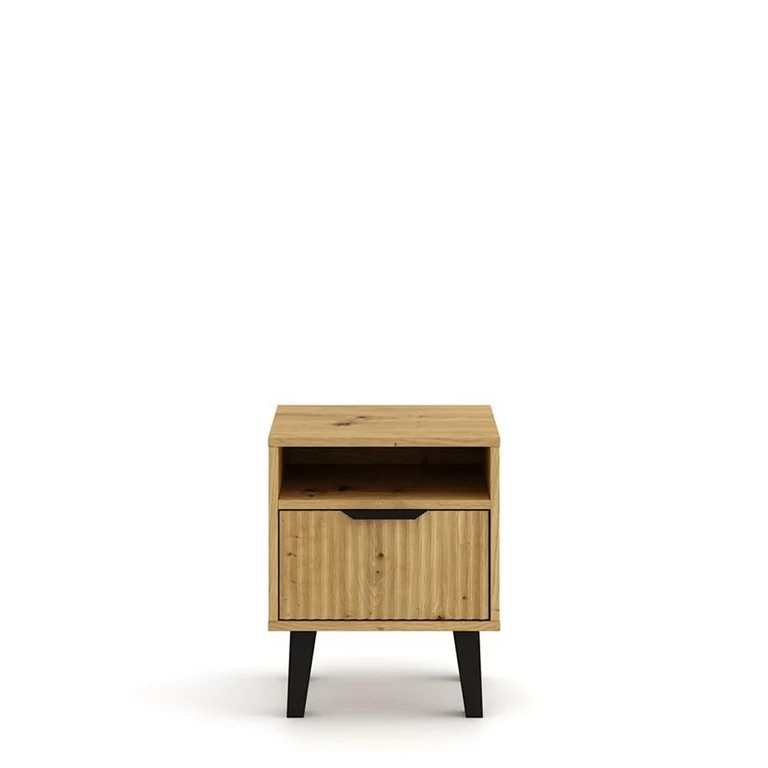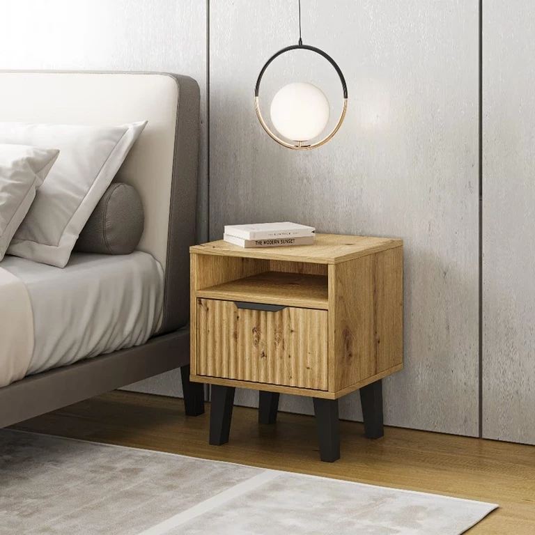Su vienu praktišku stalčiumi ir atvira lentyna, ji puikiai tinka laikyti niekučius, knygas ar įkroviklį. „Artisan Oak“ fasadas pasižymi subtiliais grioveliais, suteikiančiais elegantišką tekstūrą ir natūralų charakterį.