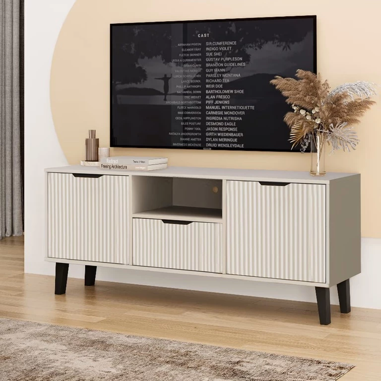 Subtilus vertikalus fasadų frezavimas suteikia baldams unikalaus žavesio, o minimalistinės juodos rankenėlės pabrėžia modernų dizainą. Tai praktiškas ir stilingas svetainės sprendimas, kuris puikiai derės tiek prie modernaus, tiek prie klasikinio interjero.