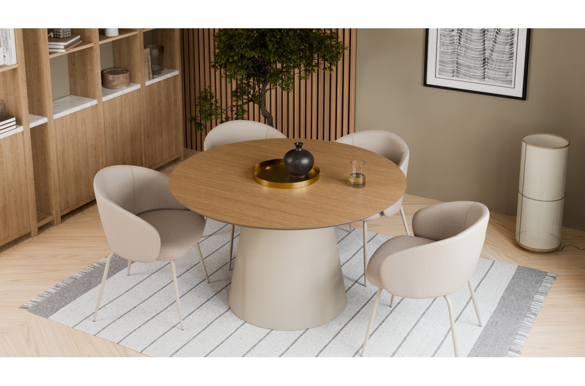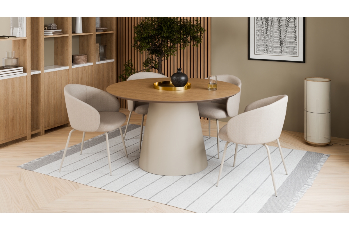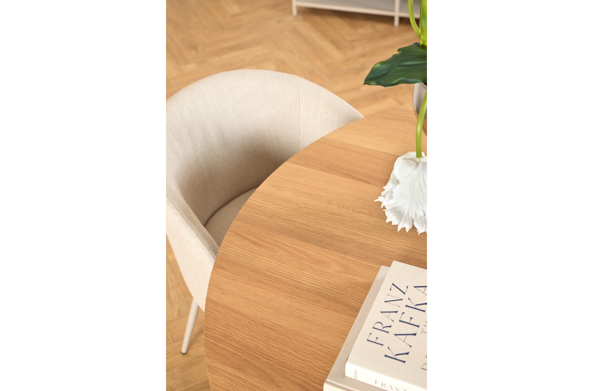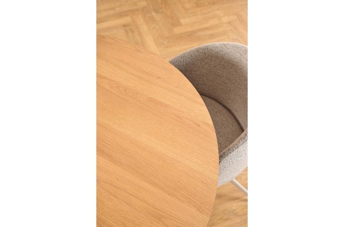 BOSCO natūralaus ąžuolo/smėlio spalvos kojos (kašmyras) – apvalus stalas 120 cm virtuvei, valgomajam, svetainei, fanera