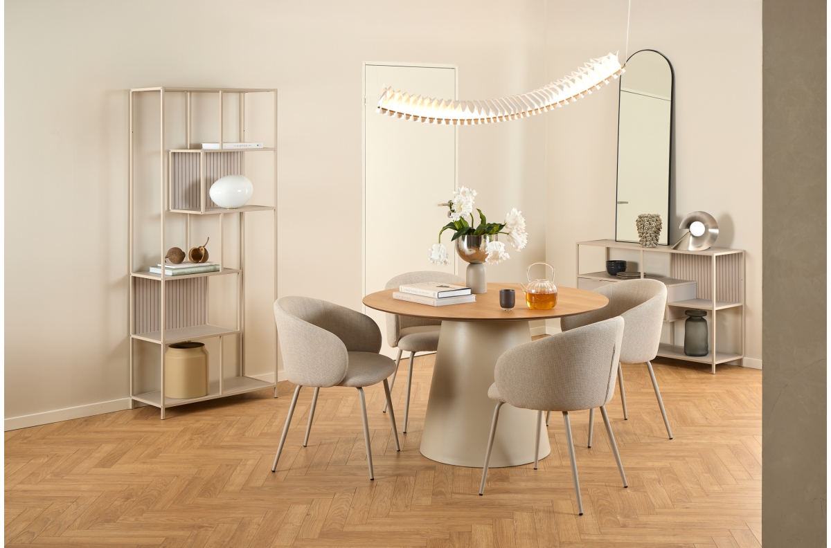 PLOTIS 120 cm, GYLIS 120 cm, AUKŠTIS 75 cm, STALVIRŠIAUS FORMA Apvali, MEDŽIAGOS MDF / natūralus lukštas / milteliniu būdu dažytas plienas, PAVIRŠIUS Matinis, STILIUS Modernus / Boho, SVORIS SU PAKUOTE 40,4 kg