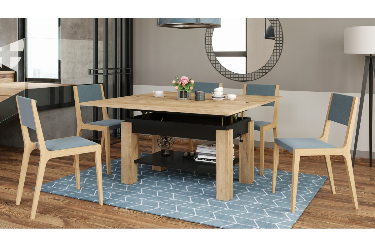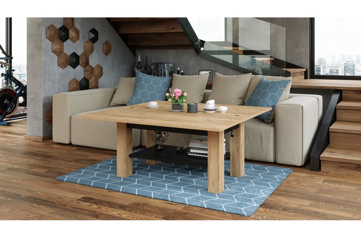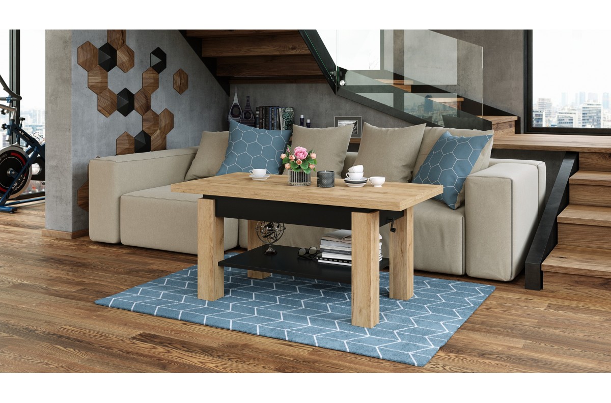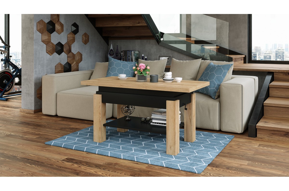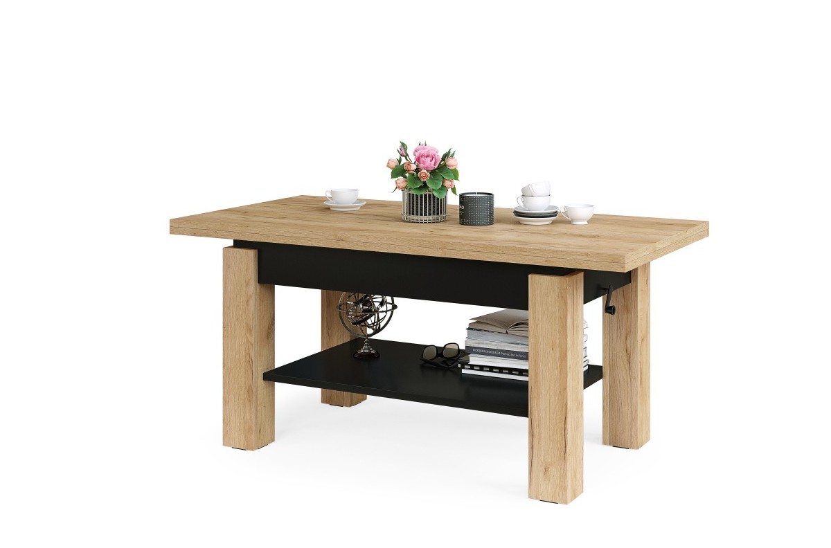 BRAWO Craft ąžuolo aukso/matinės juodos spalvos – kavos staliukas su ištraukiamu ir pakeliamu stalviršiu kavos staliukas su lentyna