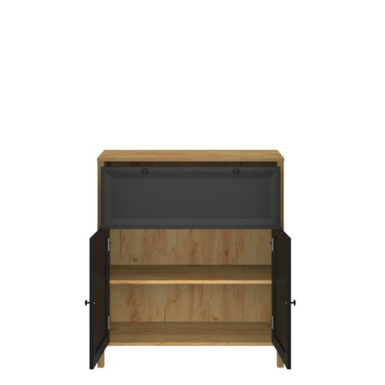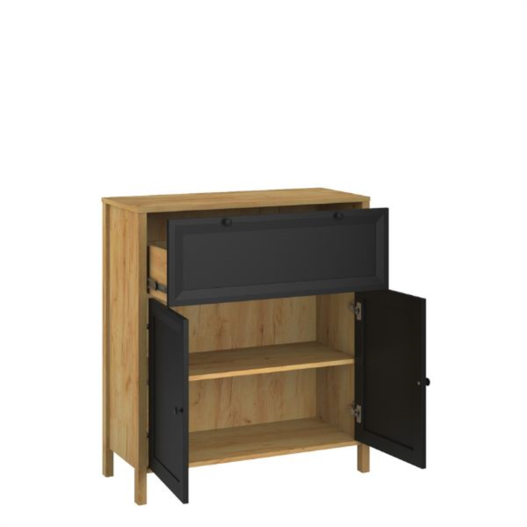 Reikia papildomos vietos daiktams susidėti? Ši 2 durų komoda iš BRENT kolekcijos, aukso / juodo ąžuolo spalvos, yra kaip tik tinkamas priedas, padėsiantis sutvarkyti jūsų svetainę ar valgomąjį. Paprastas, tradicinis dizainas, juodi fasadai ir rankenėlės bei stalčius puikiai dera su šiuo klasikiniu ir nesudėtingu baldu. Komodos viduje yra lentyna, kuri padalija daiktų laikymo erdvę į dvi dalis, taip padedant išlaikyti tvarką.