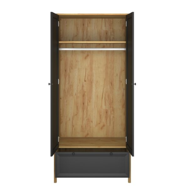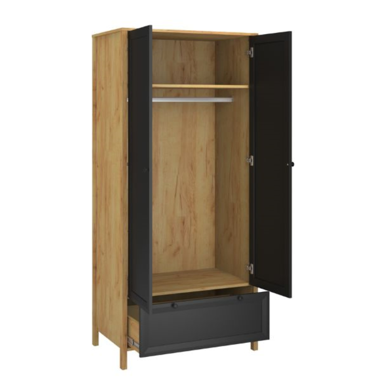 Nesvarbu, ar miegamajame, ar bet kurioje kitoje namų vietoje, BRENT 2D1S spinta iš auksinio ąžuolo su juodais fasadais padės tvarkingai laikyti drabužius ir palengvins pasiruošimą ryte. Dviejų spalvų derinys suteikia BRENT spintai elegantiškumo ir lengvai dera prie beveik bet kokio interjero. Dvi didelės durys dengia erdvų vidų su metaline skersine striukėms, kelnėms, megztiniams ir kitiems daiktams pakabinti. Apatinis stalčius suteikia papildomos vietos drabužiams ir kitiems aksesuarams.
