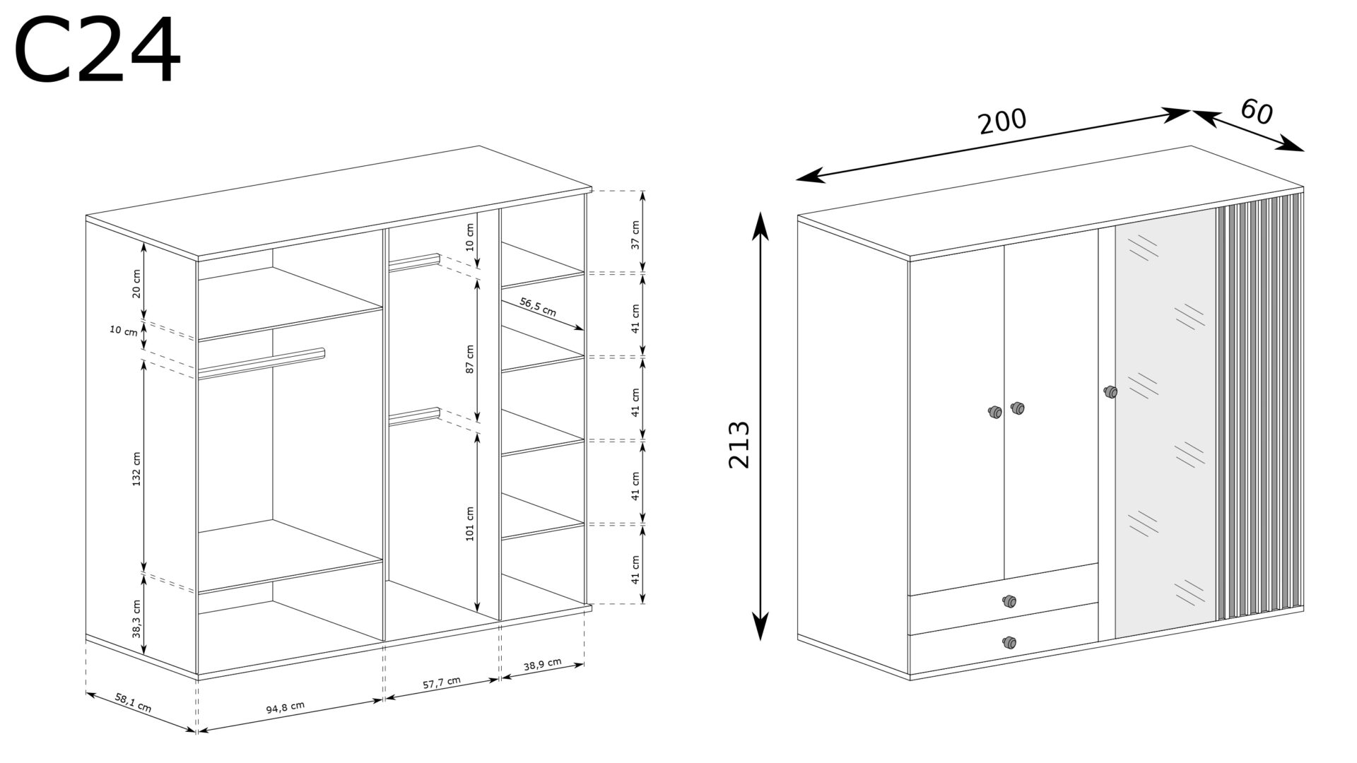 Spinta CALI-24 – tai tobulas modernumo ir funkcionalumo derinys, kuris neabejotinai patenkins net ir reikliausių vartotojų lūkesčius. Unikali, lofto stiliaus išvaizda paverčia ją išskirtiniu bet kokio interjero elementu, suteikiančiu charakterio ir stiliaus. Natūralus „Artisan“ atspalvis harmoningai derinamas su elegantiškais juodais aksesuarais, kurie pabrėžia modernų baldų dizainą. Didelis veidrodis, esantis ant spintos priekio, ne tik įneša į kambarį daugiau šviesos, bet ir vizualiai padidina erdvę, o tai ypač svarbu mažesnėse erdvėse. Pagaminta iš aukštos kokybės laminuotos plokštės, CALI-24 garantuoja patvarumą ir atsparumą pažeidimams, todėl tai idealus sprendimas kasdieniam naudojimui. Metalinių rankenų naudojimas yra ne tik estetikos, bet ir funkcionalumo klausimas, užtikrinantis patogią prieigą prie laikomų daiktų. Spinta CALI-24 buvo kruopščiai suprojektuota siekiant maksimaliai išnaudoti erdvę ir pasiūlyti daug vietos daiktams susidėti. Erdvus vidus leidžia tvarkingai susidėti drabužius ir aksesuarus, o tai atitinka estetiką ir praktiškumą, kurio visi siekiame balduose. Be to, tylus vyrių uždarymas leidžia patogiai ir be vargo naudotis spinta.