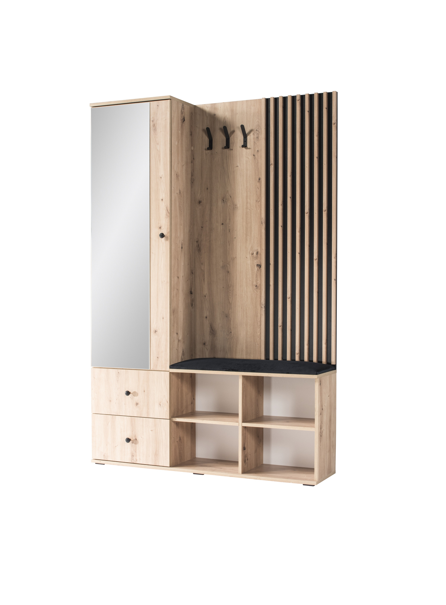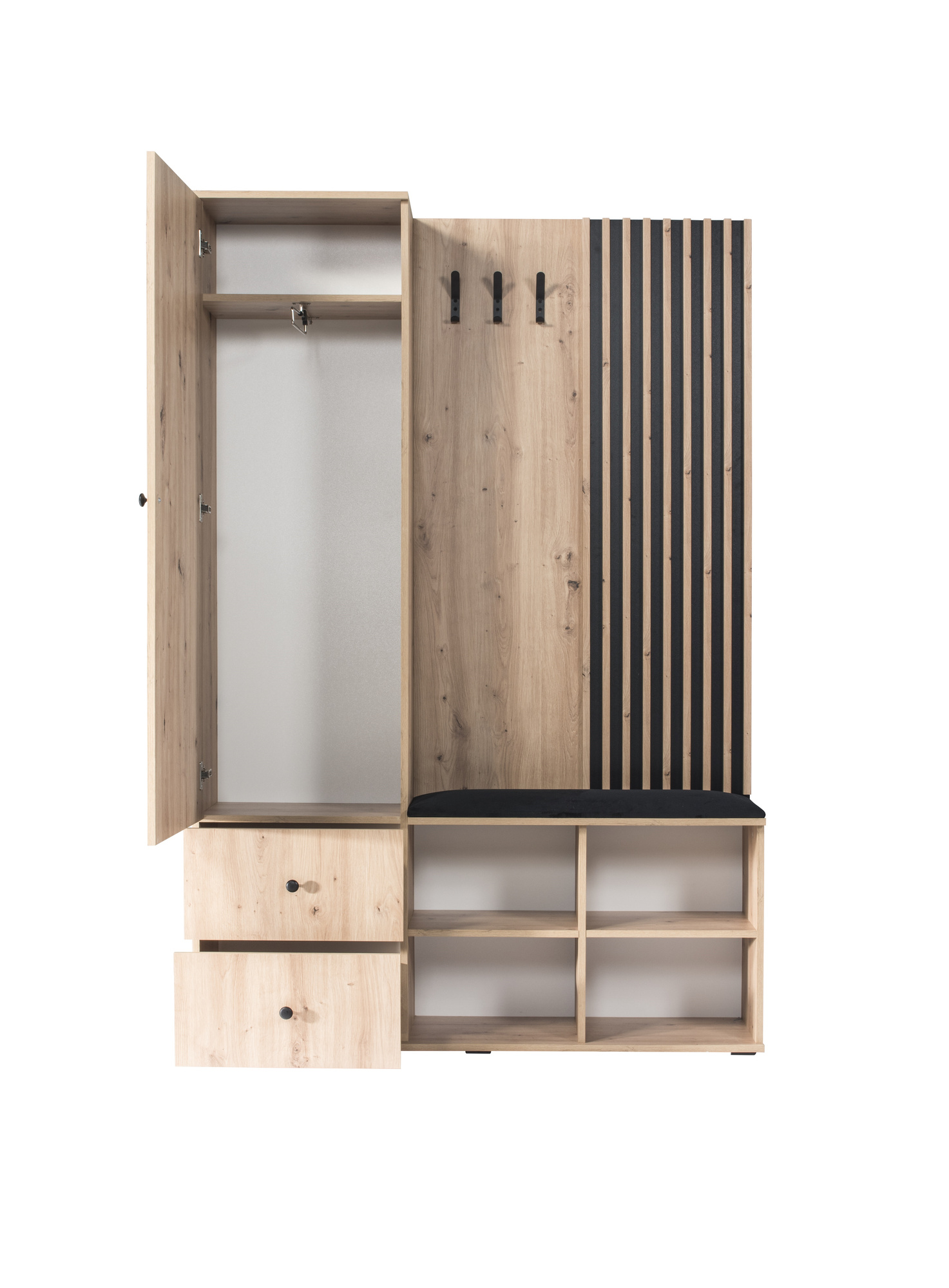 CALI – 1D2S Artisan spinta su veidrodžiu ir sėdyne – tai amžina elegancija, kuri suteiks charakterio jūsų prieškambariui. Modernus Artisan atspalvio dizainas ne tik suteikia baldui neįtikėtinai stilingą išvaizdą, bet ir sukuria malonią atmosferą. Ši spinta – puikus jūsų namų akcentas, harmoningai derinantis funkcionalumą su estetika, suteikiantis modernų stilių naudojant groteles, todėl kiekvienas svečias iš karto pasijus laukiamas. Priklausomai nuo jūsų poreikių, CALI siūlo apgalvotus organizavimo sprendimus. Du erdvūs stalčiai puikiai tinka sezoniniams aksesuarams, tokiems kaip kepurės ir pirštinės, laikyti, leisdami palaikyti tvarką. Viršuje esanti pakabinama spinta yra puiki vieta striukėms ir paltams, užtikrinanti, kad viskas būtų po ranka kasdieniame skubėjime. Erdvė suprojektuota taip, kad kiekvienas daiktas sudarytų darnią visumą. Gėdinga vieta batams? Tik ne su CALI! Patogios batų lentynos leidžia greitai ir lengvai susitvarkyti daiktus. Be to, skoninga, apmušta elegantiškos juodos spalvos sėdynė yra ne tik patogi, bet ir gražiai papildo bendrą dizainą. Ant jos galite patogiai sėdėti audamiesi batus arba tiesiog mėgautis ramybės akimirka stilingame prieškambario dekore.