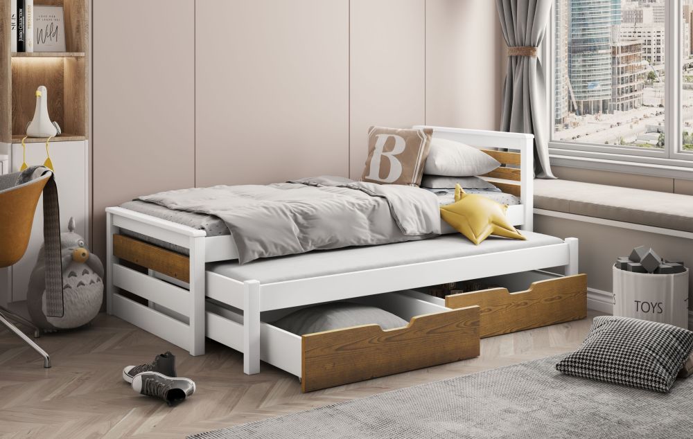 CALWIN dviaukštė lova su žema lova pagaminta iš pušies medienos, kuri kruopščiai tikrinama dėl patvarumo ir saugos savybių.