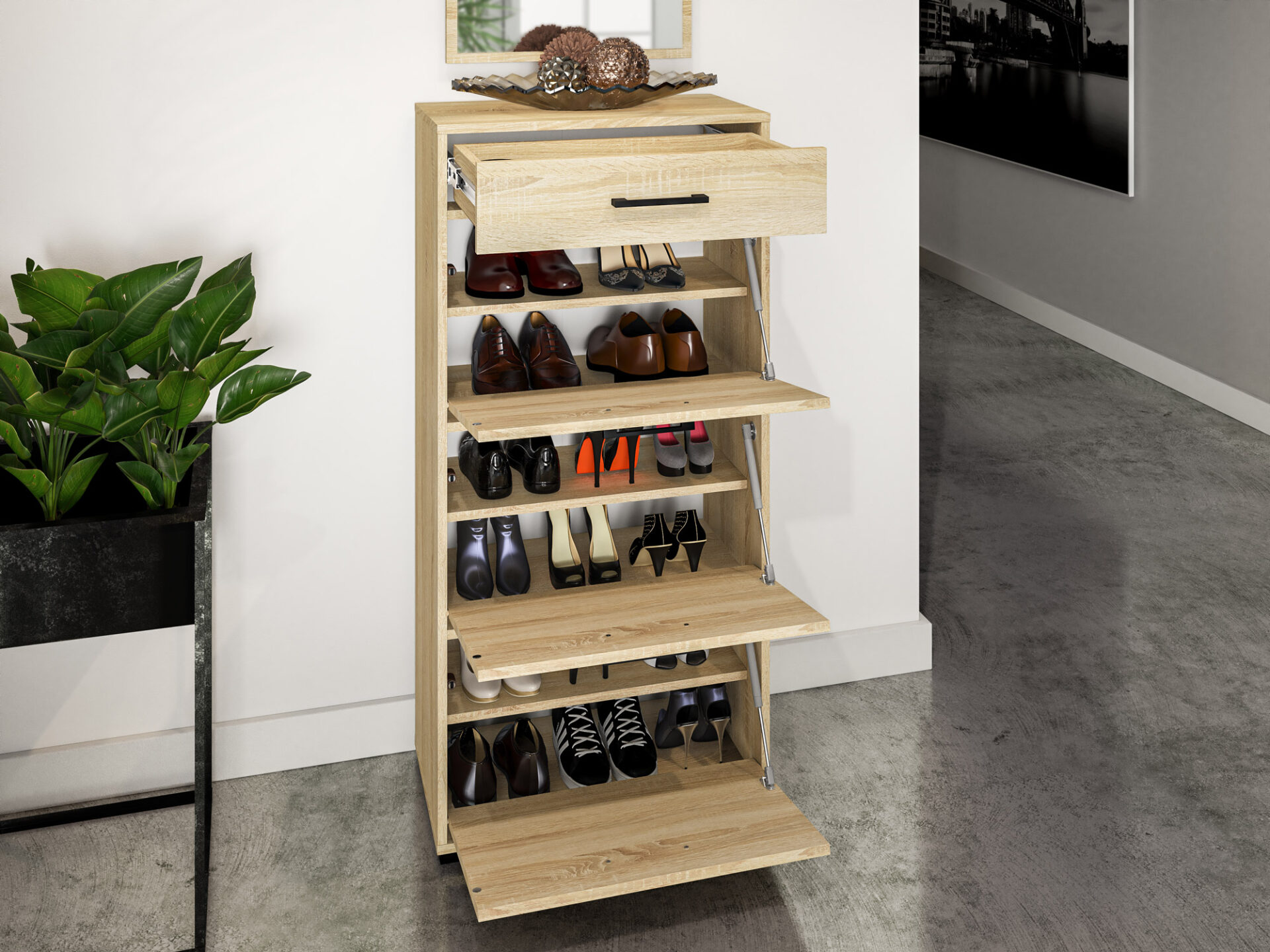 Aukšta batų spintelė „Caro 14“ – puikus sprendimas bet kokiam prieškambariui. Joje yra šešios erdvios nišos, puikiai tinkančios batams laikyti. Spintelė atsidaro iš viršaus. Durys aprūpintos moderniais dujiniais amortizatoriais, kurie žymiai padidina kasdienį komfortą. Spintelė turi patogų stalčių, puikiai tinkantį laikyti tokius daiktus kaip automobilio rakteliai ar batų aksesuarai. Kompaktiškas stalviršis užbaigia išvaizdą – puikiai tinka eksponuoti mėgstamas dekoracijas ar laikyti smulkius daiktus įžengus į namus.