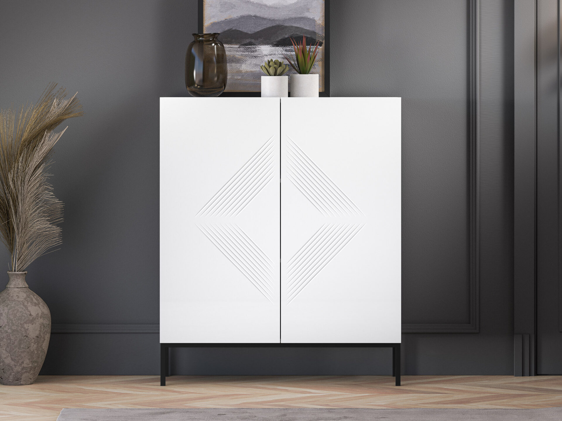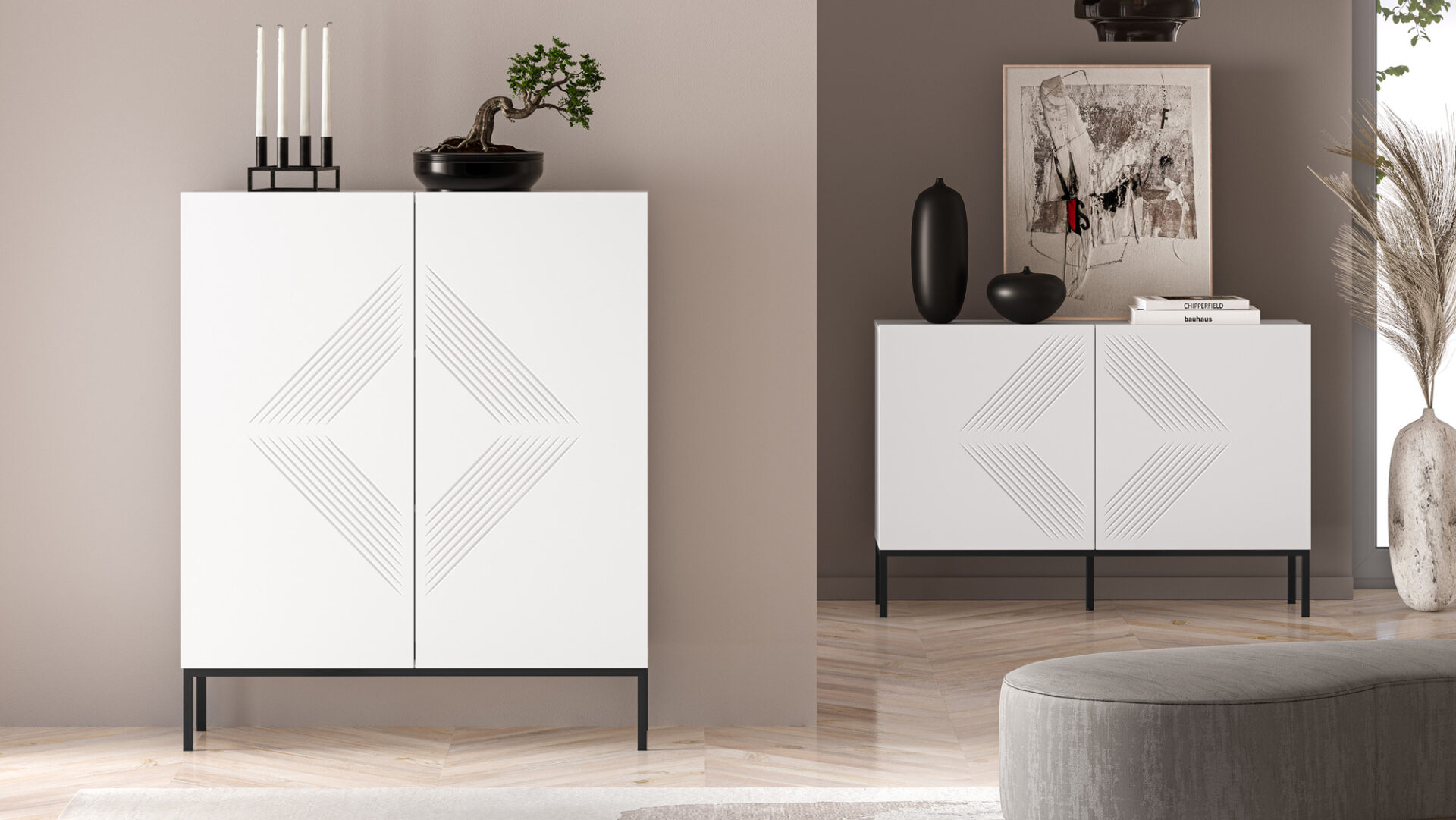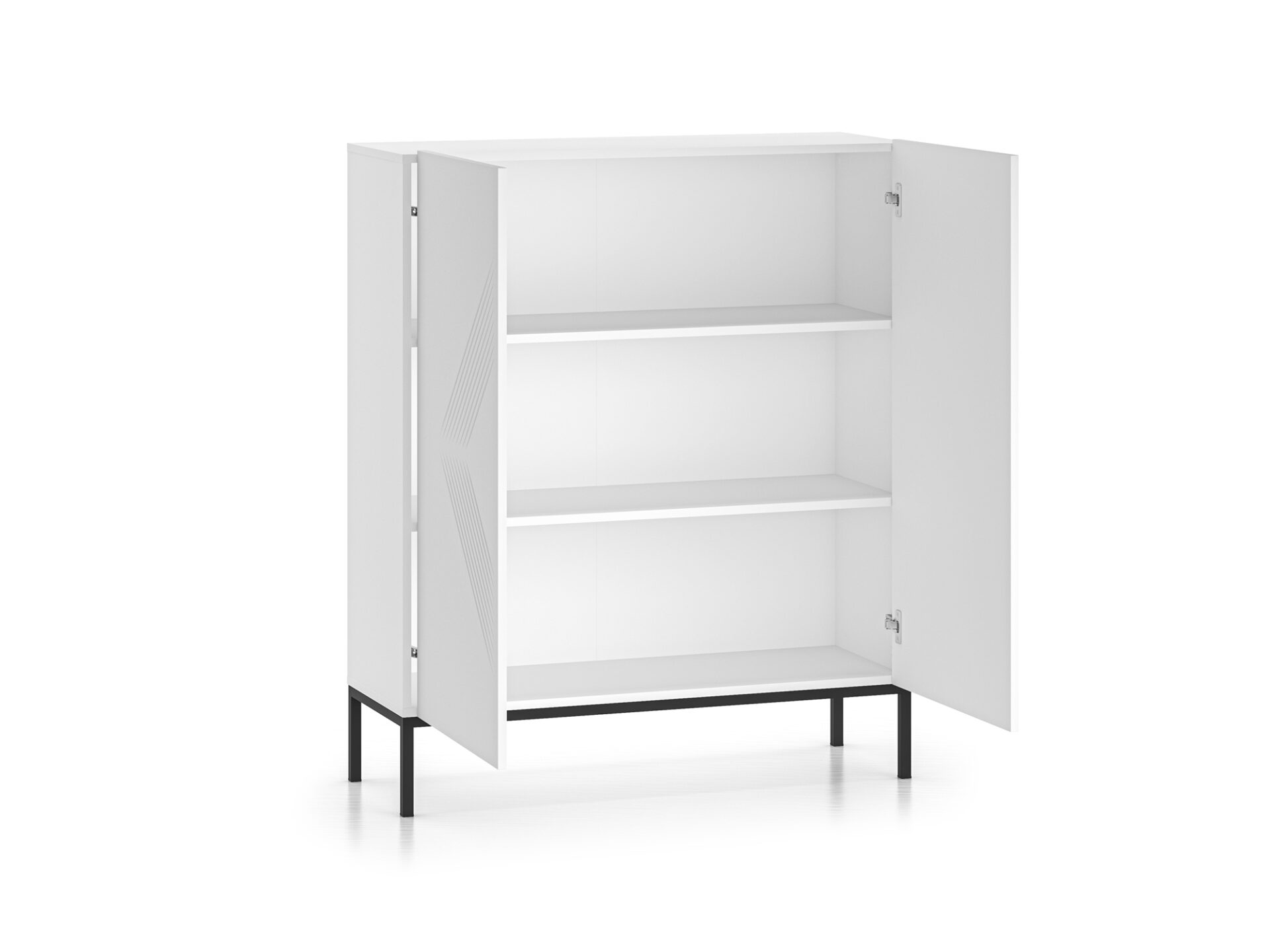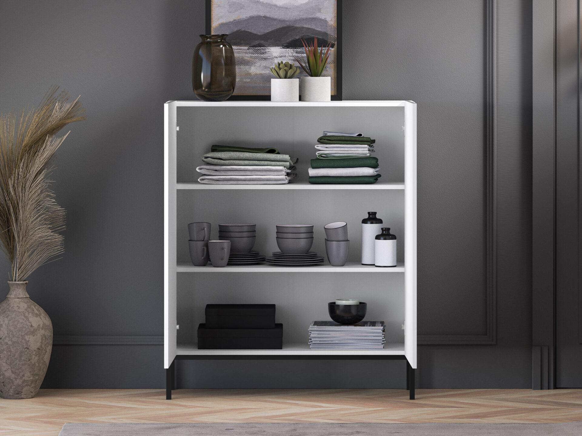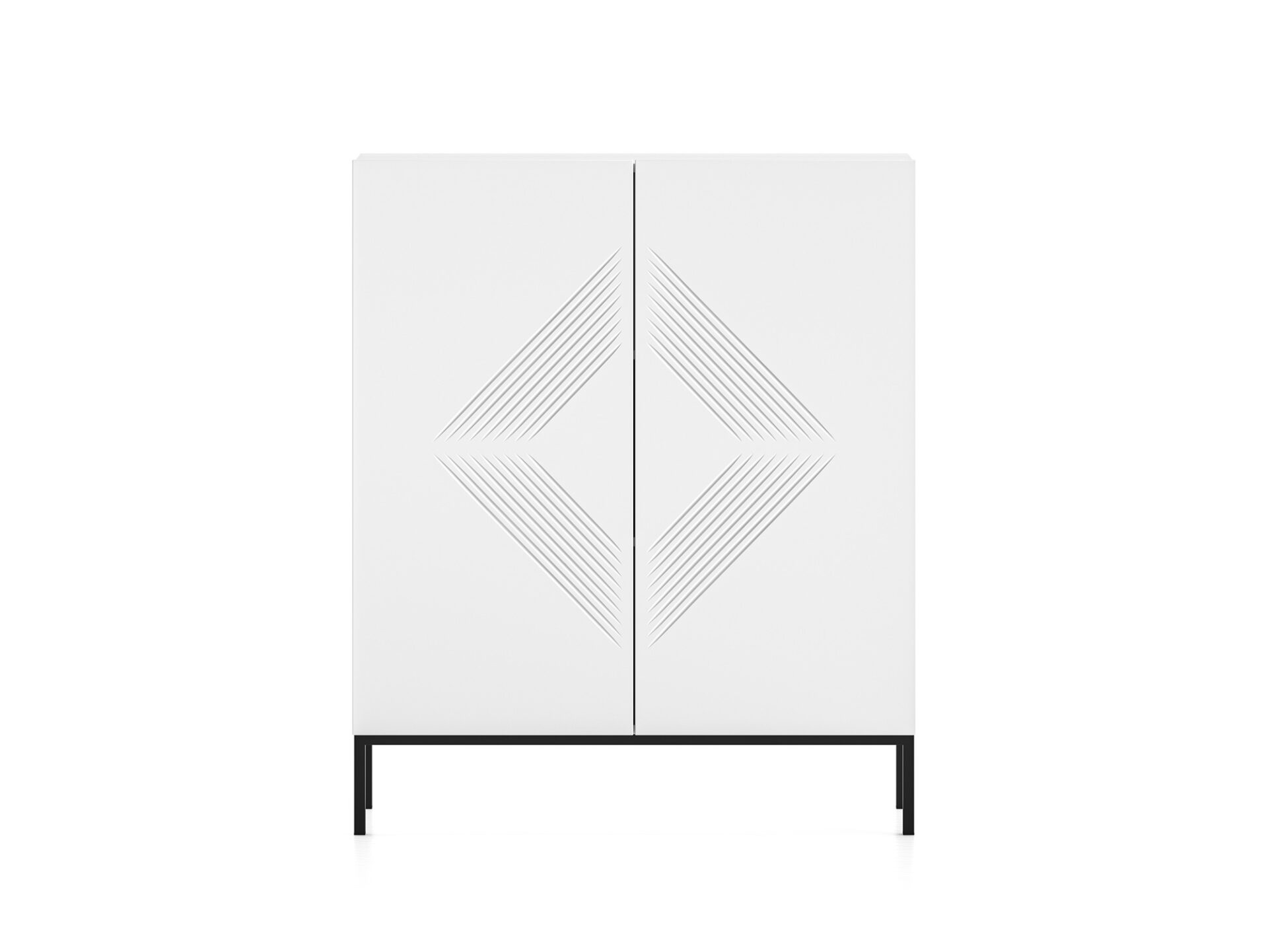 Aukšta komoda „Clearing 01“ – tai baldas, puikiai tinkantis stalo įrankiams, staltiesėms ar kitiems namų tekstilės gaminiams laikyti. Dvi plačios lentynos, padalijančios uždarą erdvę į tris erdvias nišas, leidžia tvarkingai susidėti daugybę namų apyvokos daiktų. Be to, didelis stalviršis leidžia demonstruoti mėgstamas nuotraukas, vazas ar atostogų suvenyrus. Be funkcionalumo, pagrindinis „Clearing“ kolekcijos baldų privalumas yra jų dizainas. Paprasti, balti fasadai, pagaminti iš itin patvarios MDF plokštės, paryškinti unikaliais frezavimais. Minimalistinė forma su įdomiu akcentu sukuria modernų įspūdį šiuolaikinei svetainei ar miegamajam. Juodas metalinis pagrindas suteikia komodai charakterio ir kartu su likusia balto korpuso dalimi sukuria klasikinį ir elegantišką spalvų kontrastą.