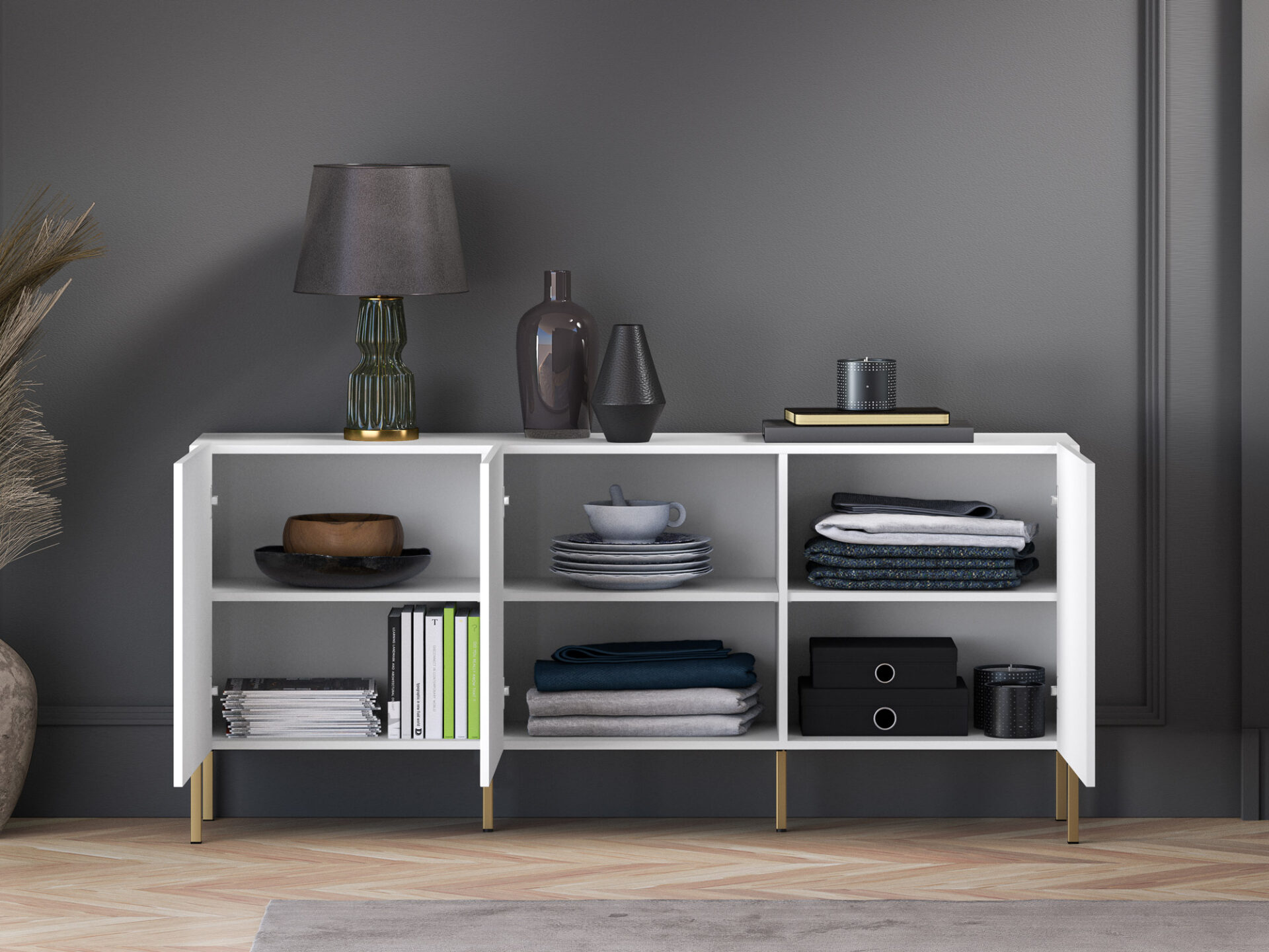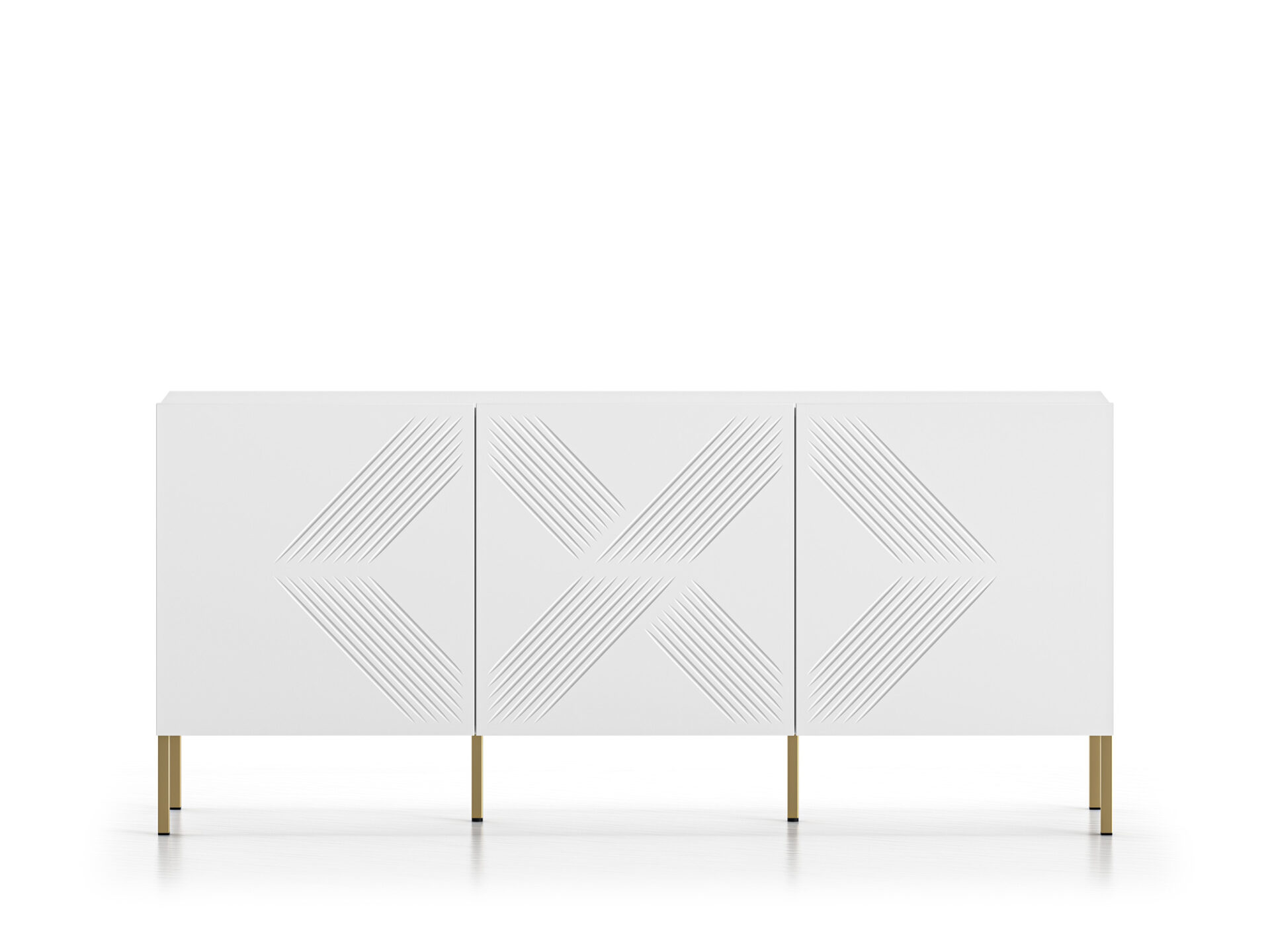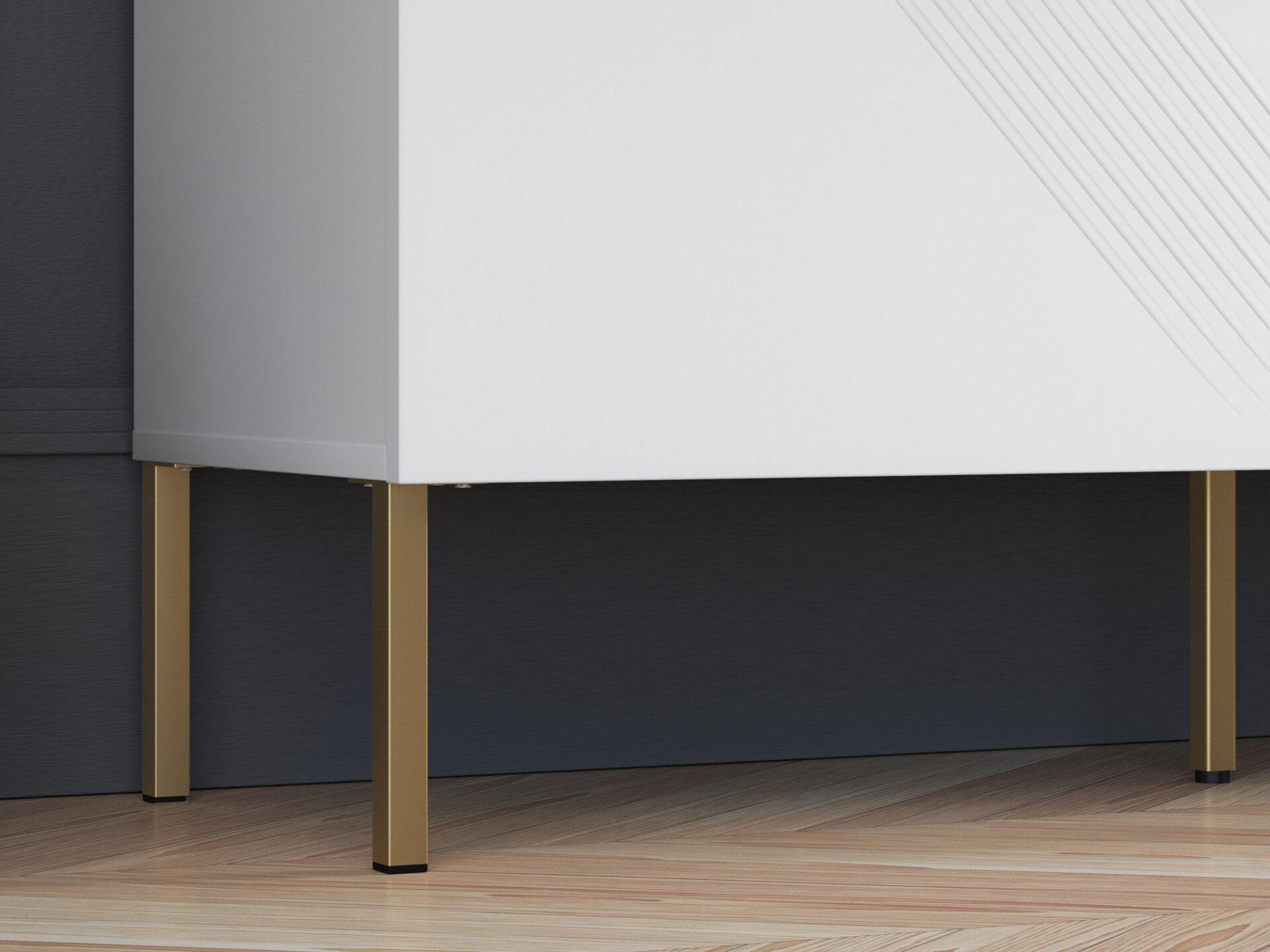 Komoda „Clearing 02“ – tai baldas, puikiai tinkantis stalo įrankiams, staltiesėms ir kitiems namų tekstilės gaminiams laikyti. Šešios erdvios nišos leidžia tvarkingai susidėti daugybę namų apyvokos daiktų. Be to, didelis stalviršis leidžia laikyti mėgstamas nuotraukas, vazas ar atostogų suvenyrus. Be funkcionalumo, pagrindinis „Clearing“ kolekcijos baldų privalumas yra jų dizainas. Paprasti, balti fasadai, pagaminti iš itin patvarios MDF plokštės, paryškinti unikaliais frezavimais. Minimalistinė forma su įdomiu akcentu sukuria modernų įspūdį šiuolaikinei svetainei ar miegamajam. Auksinės metalinės kojelės suteikia komodai charakterio ir kartu su likusia balto korpuso dalimi sukuria klasikinį ir elegantišką spalvų kontrastą.
