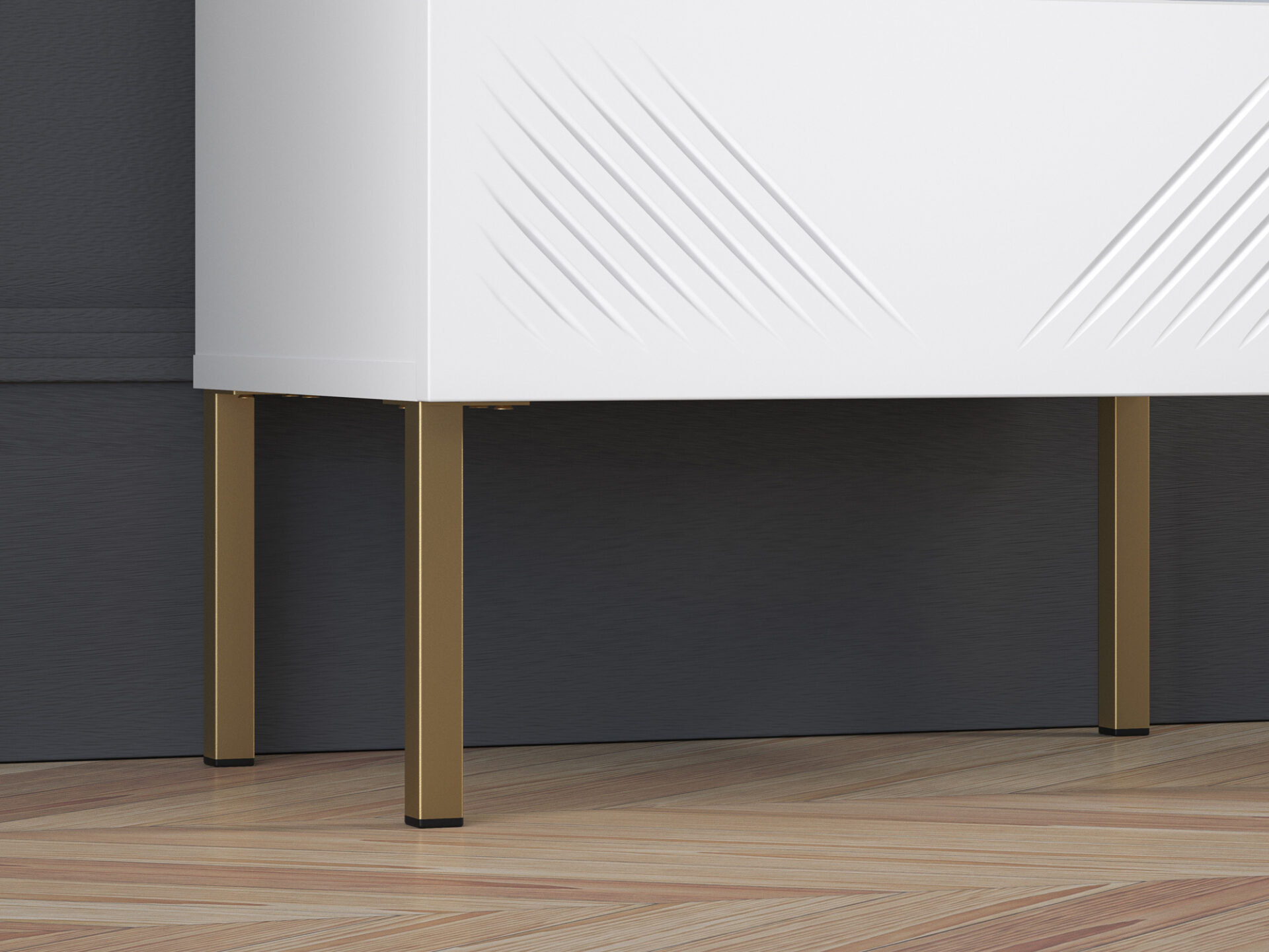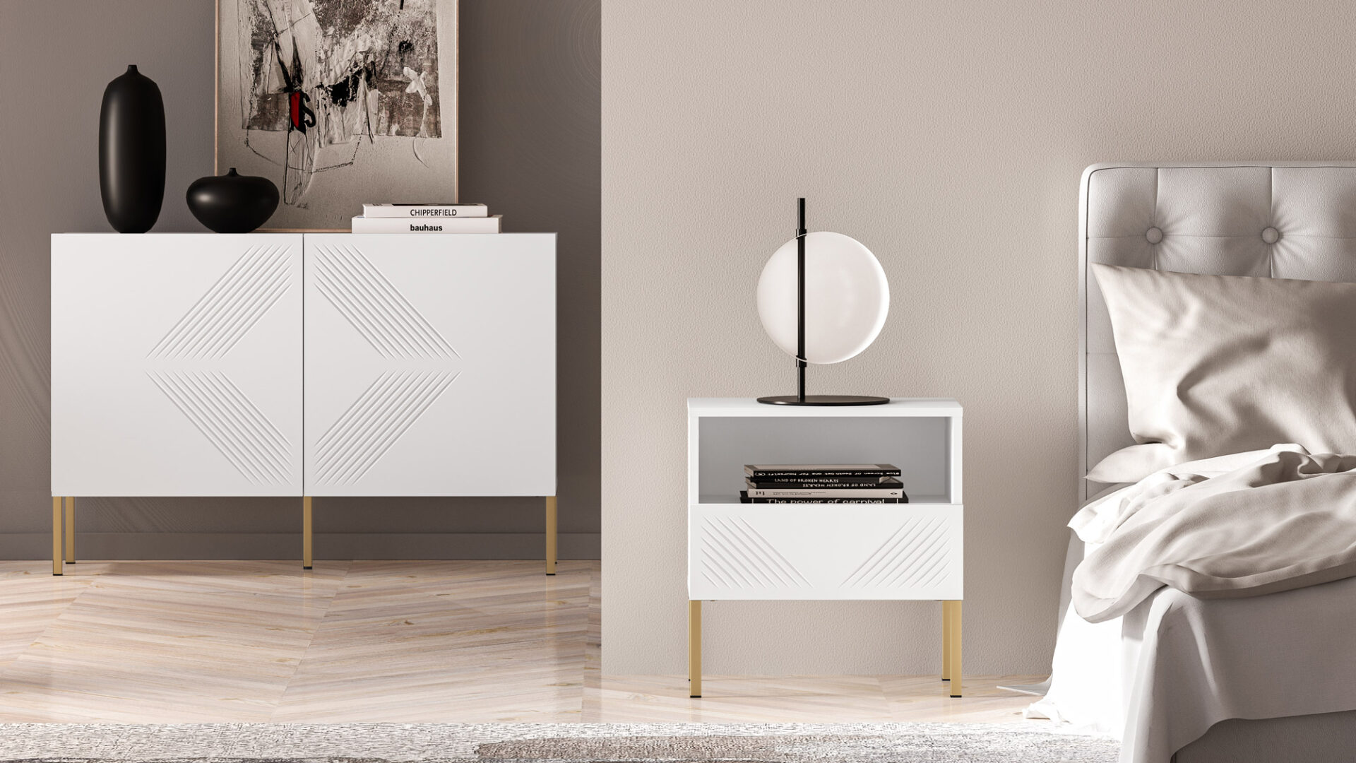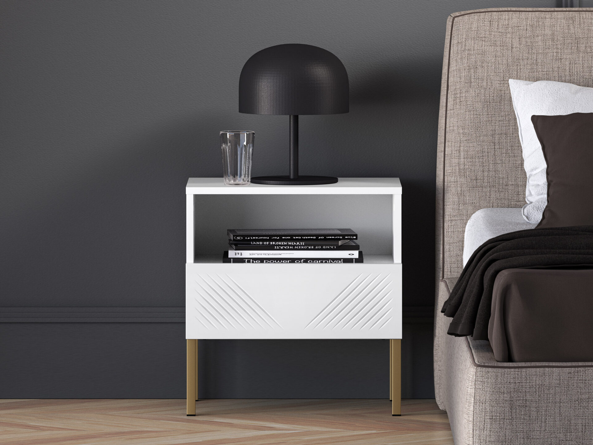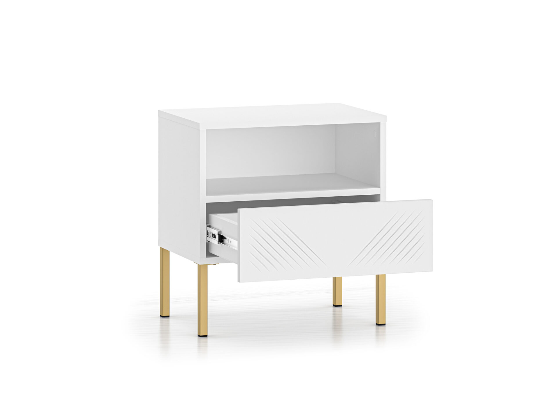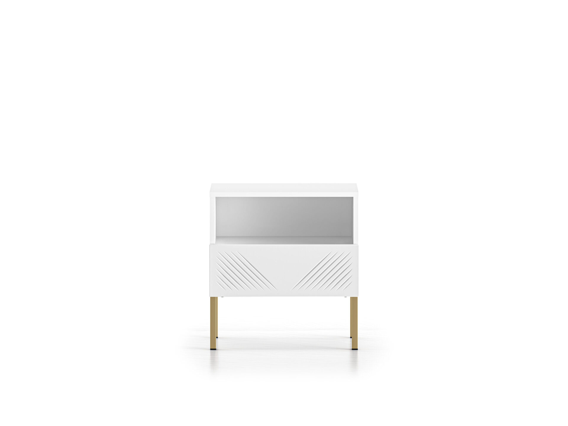 „Clearing 05“ naktinis staliukas – tai baldas, kuris puikiai tiks jūsų miegamajame. Atvira niša – puiki vieta susidėti mėgstamas knygas ar laikraščius. Stalčius puikiai tinka laikyti mėgstamas žvakes, plaukų šepetį ar rankų kremą. Ant stalviršio galite pasidėti naktinio stalelio lempą ir kitus daiktus, kuriuos norite turėti po ranka. Be funkcionalumo, pagrindinis „Clearing“ kolekcijos baldų privalumas yra jų dizainas. Paprasti, balti fasadai, pagaminti iš itin patvarios MDF plokštės, paryškinti unikaliais frezavimais. Minimalistinė forma su įdomiu akcentu sukuria modernų vaizdą šiuolaikinei svetainei ar miegamajam. Auksinės metalinės kojelės suteikia komodai charakterio ir kartu su likusiu baltu dizainu sukuria klasikinį ir elegantišką spalvų kontrastą.
