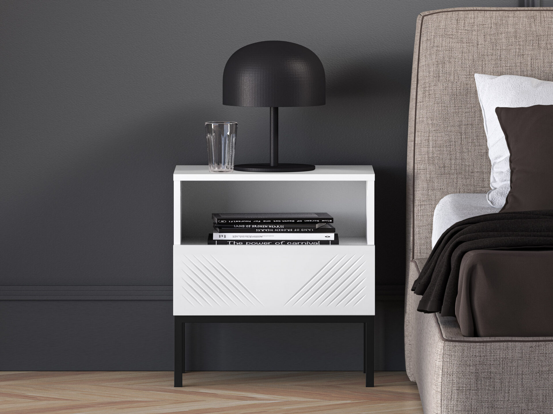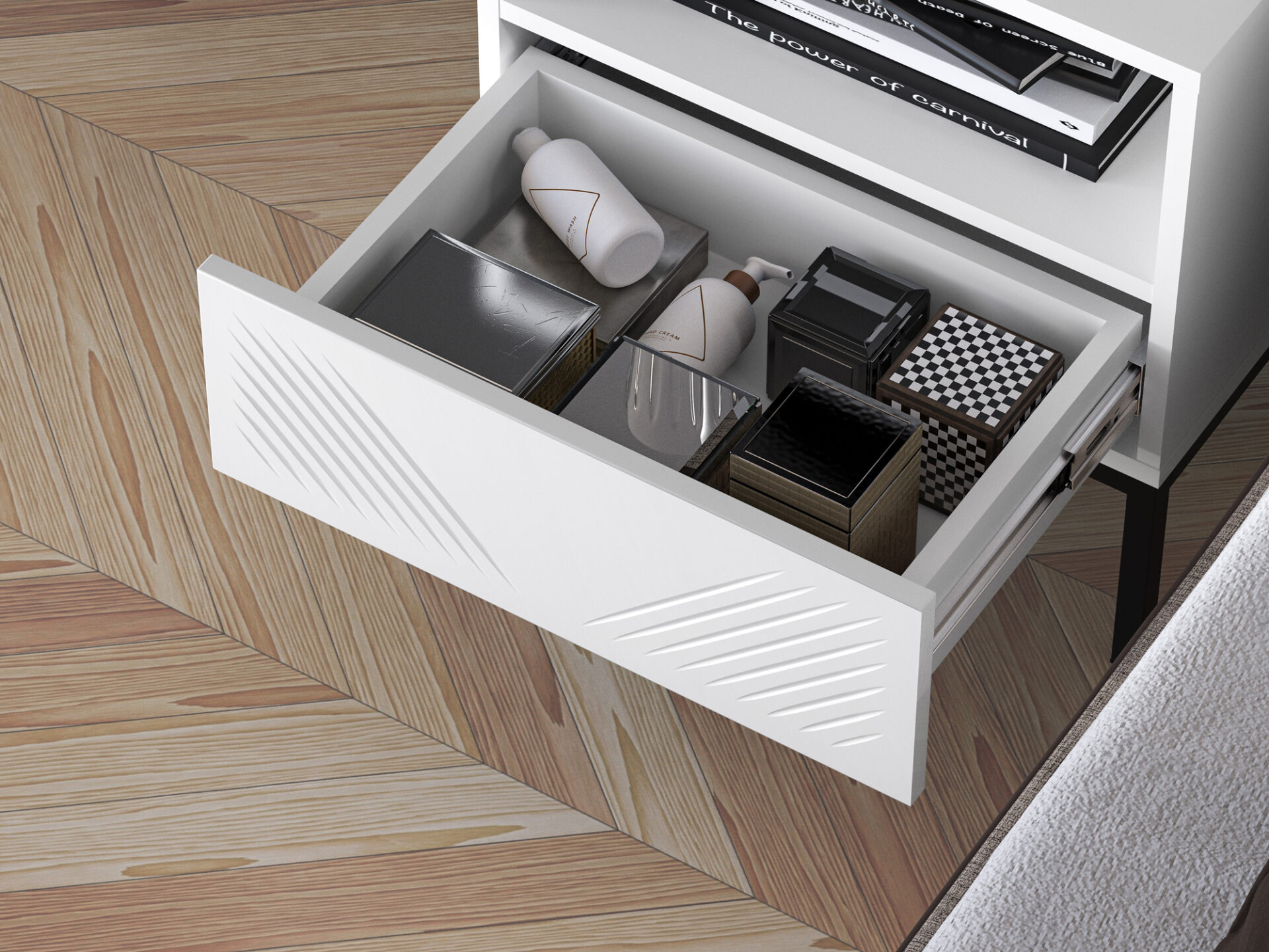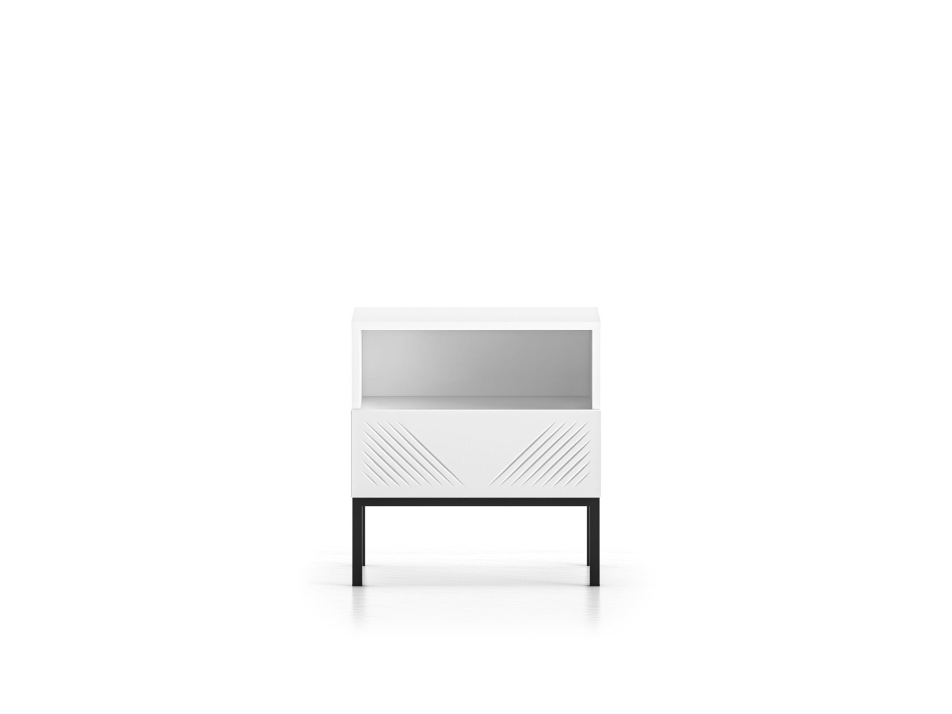 „Clearing 05“ naktinis staliukas – tai baldas, kuris puikiai tiks jūsų miegamajame. Atvira niša – puiki vieta susidėti mėgstamas knygas ar laikraščius. Stalčius puikiai tinka laikyti mėgstamas žvakes, plaukų šepetį ar rankų kremą. Ant viršaus galite pasidėti naktinio stalelio lempą ir kitus daiktus, kuriuos norite turėti po ranka. Be funkcionalumo, pagrindinis „Clearing“ kolekcijos privalumas yra jos dizainas. Paprasti, balti fasadai, pagaminti iš itin patvarios MDF plokštės, paryškinti unikaliais frezavimais. Minimalistinė forma su įdomiu akcentu sukuria modernų dizainą šiuolaikinei svetainei ar miegamajam. Juodas metalinis pagrindas suteikia komodai charakterio ir kartu su likusia baltos spalvos dizaino dalimi sukuria klasikinį ir elegantišką spalvų kontrastą.