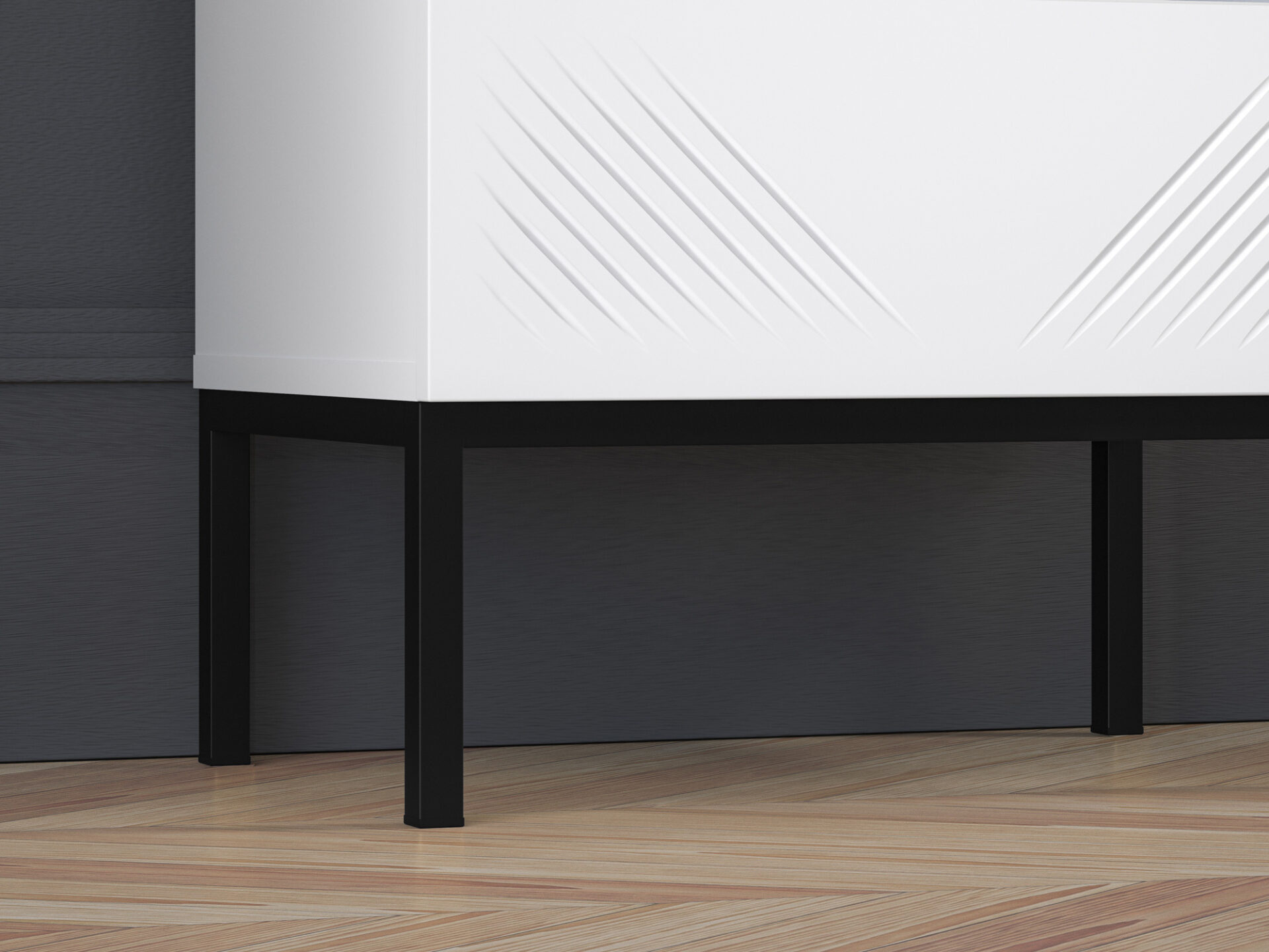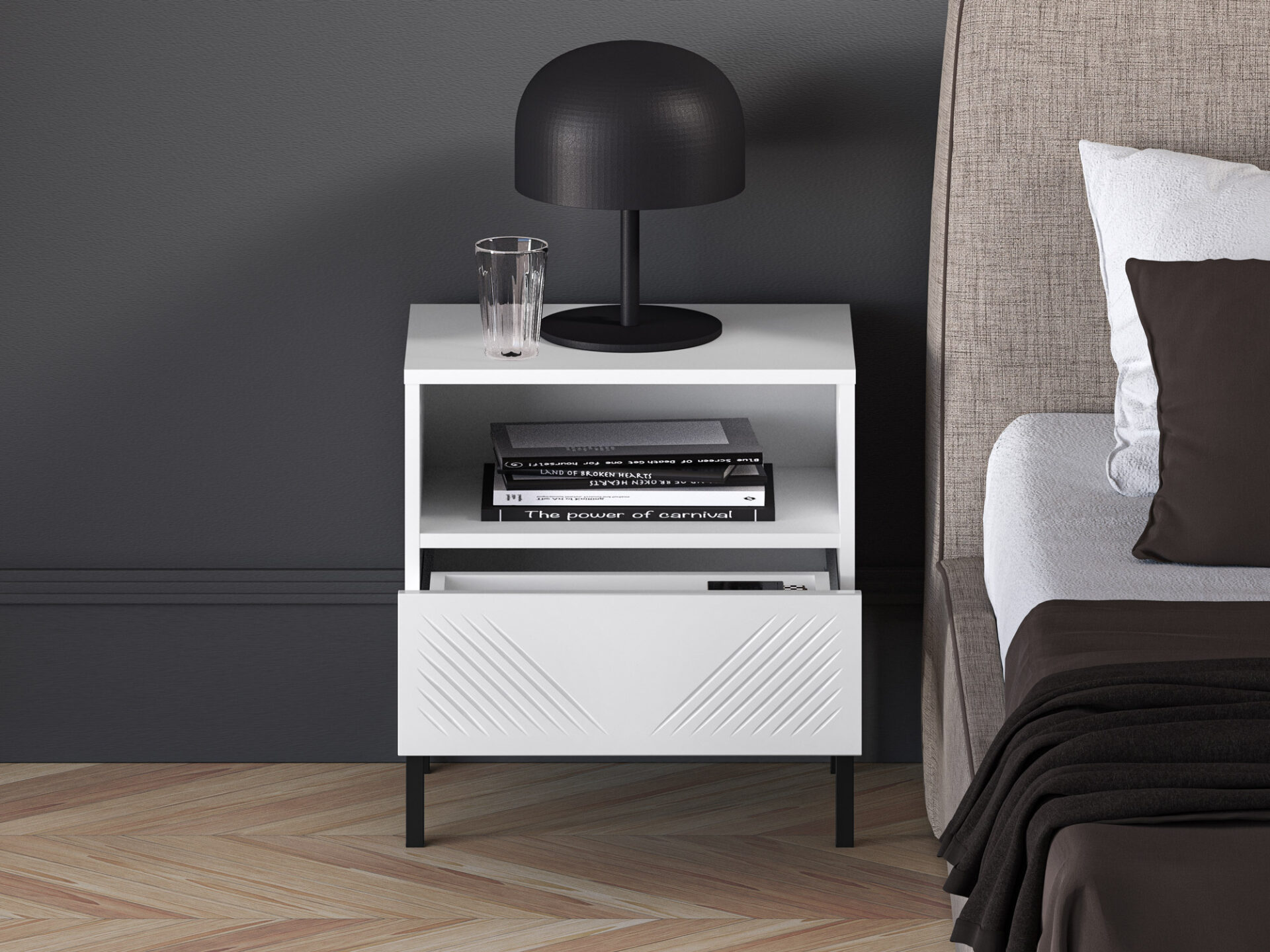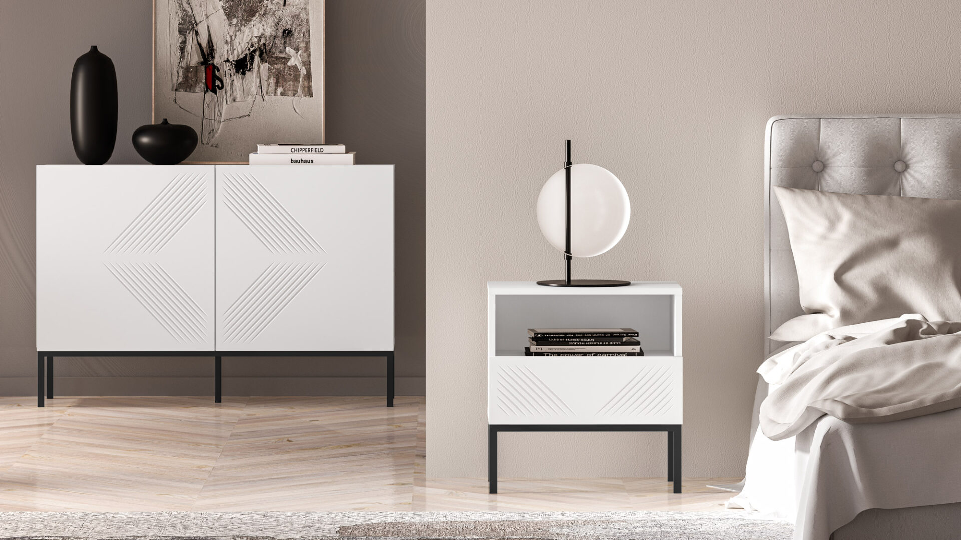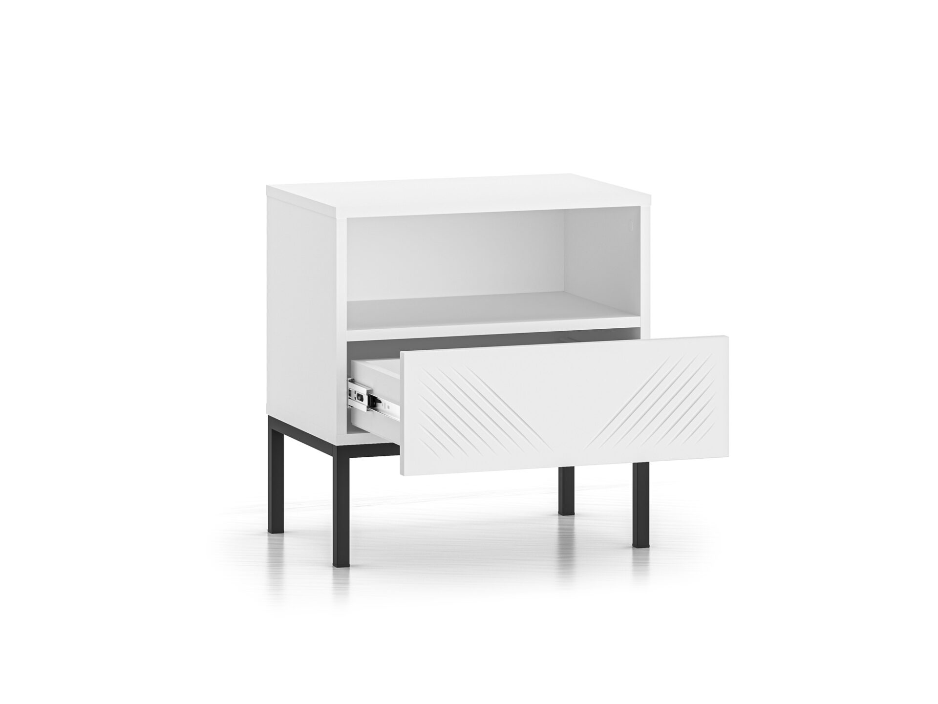 „Clearing 05“ naktinis staliukas – tai baldas, kuris puikiai tiks jūsų miegamajame. Atvira niša – puiki vieta susidėti mėgstamas knygas ar laikraščius. Stalčius puikiai tinka laikyti mėgstamas žvakes, plaukų šepetį ar rankų kremą. Ant viršaus galite pasidėti naktinio stalelio lempą ir kitus daiktus, kuriuos norite turėti po ranka. Be funkcionalumo, pagrindinis „Clearing“ kolekcijos privalumas yra jos dizainas. Paprasti, balti fasadai, pagaminti iš itin patvarios MDF plokštės, paryškinti unikaliais frezavimais. Minimalistinė forma su įdomiu akcentu sukuria modernų dizainą šiuolaikinei svetainei ar miegamajam. Juodas metalinis pagrindas suteikia komodai charakterio ir kartu su likusia baltos spalvos dizaino dalimi sukuria klasikinį ir elegantišką spalvų kontrastą.